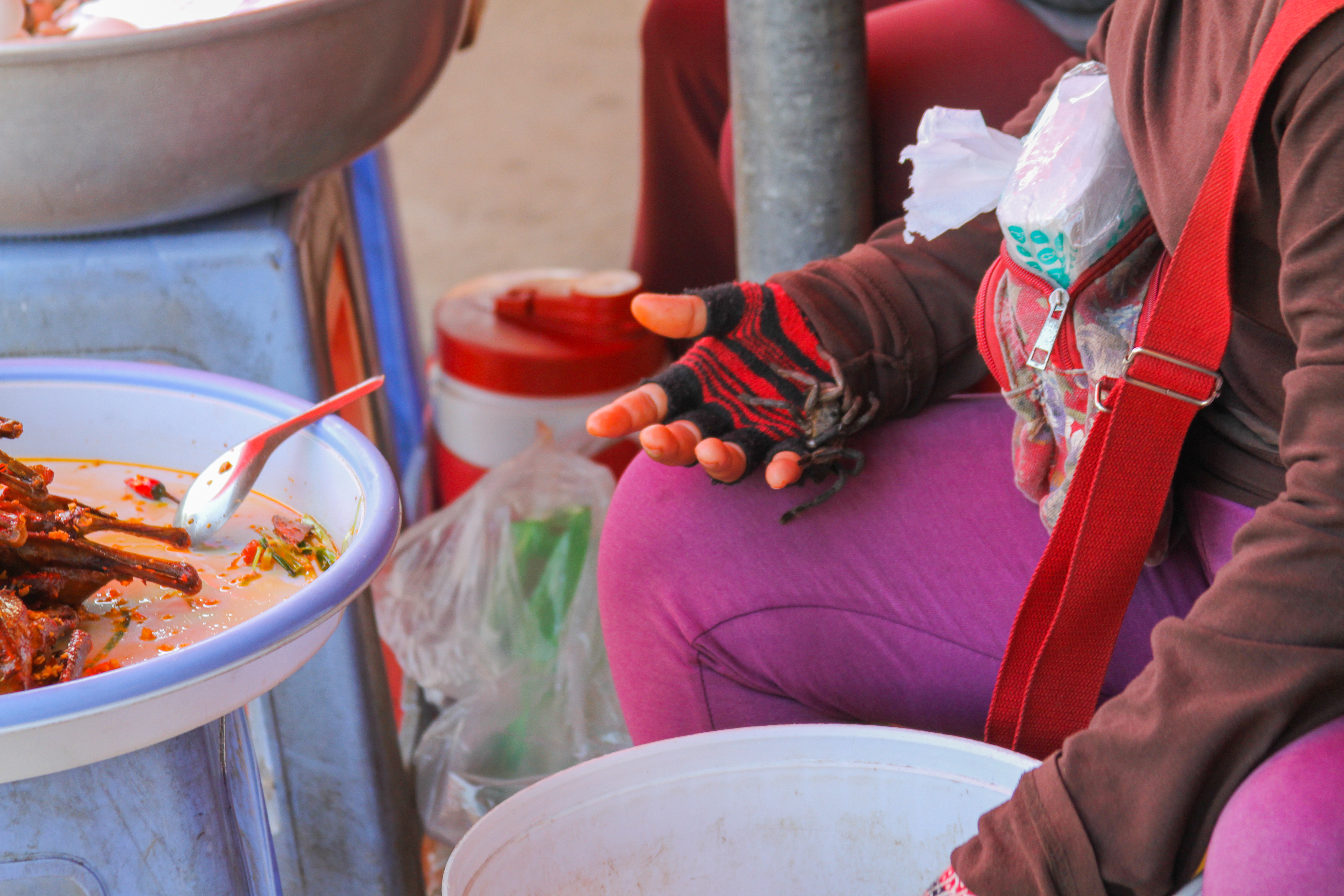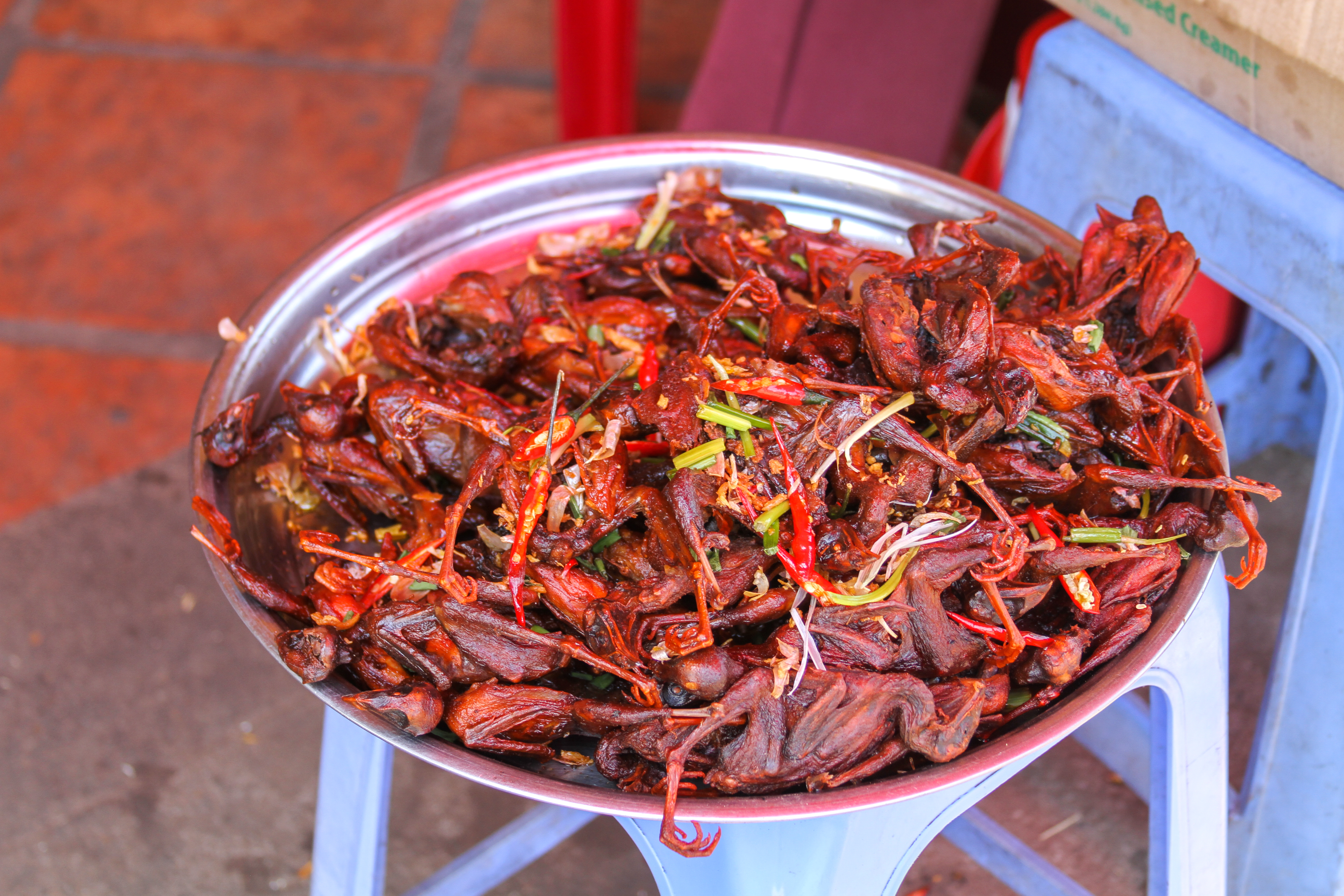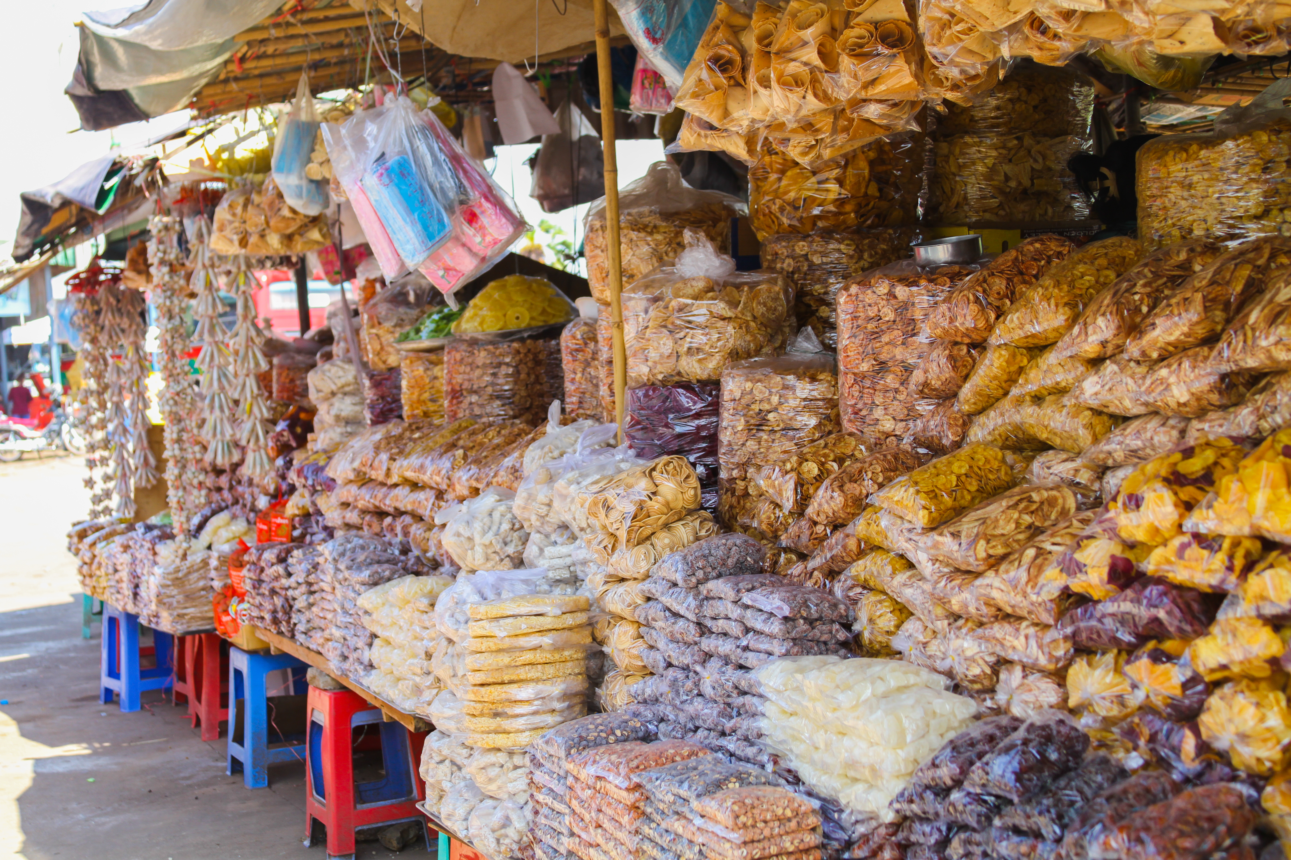 We stopped for lunch at Prey Pross, eating a decent boxed lunch by a lake. We later stopped at Skun, which is apparently called “spider town” because of all of the local tarantulas. Our guide said that the locals not only eat them, but they also will cut off their fangs and carry them around. Paul had a kid come by to see if he wanted to hold one of them. There was a market there with all kinds of fried insects, spiders, and scorpions along with eggs and deep fried whole quail and what appeared to be small chickens. There also were fruit and vegetable stands. This area is know for growing cashews as well.