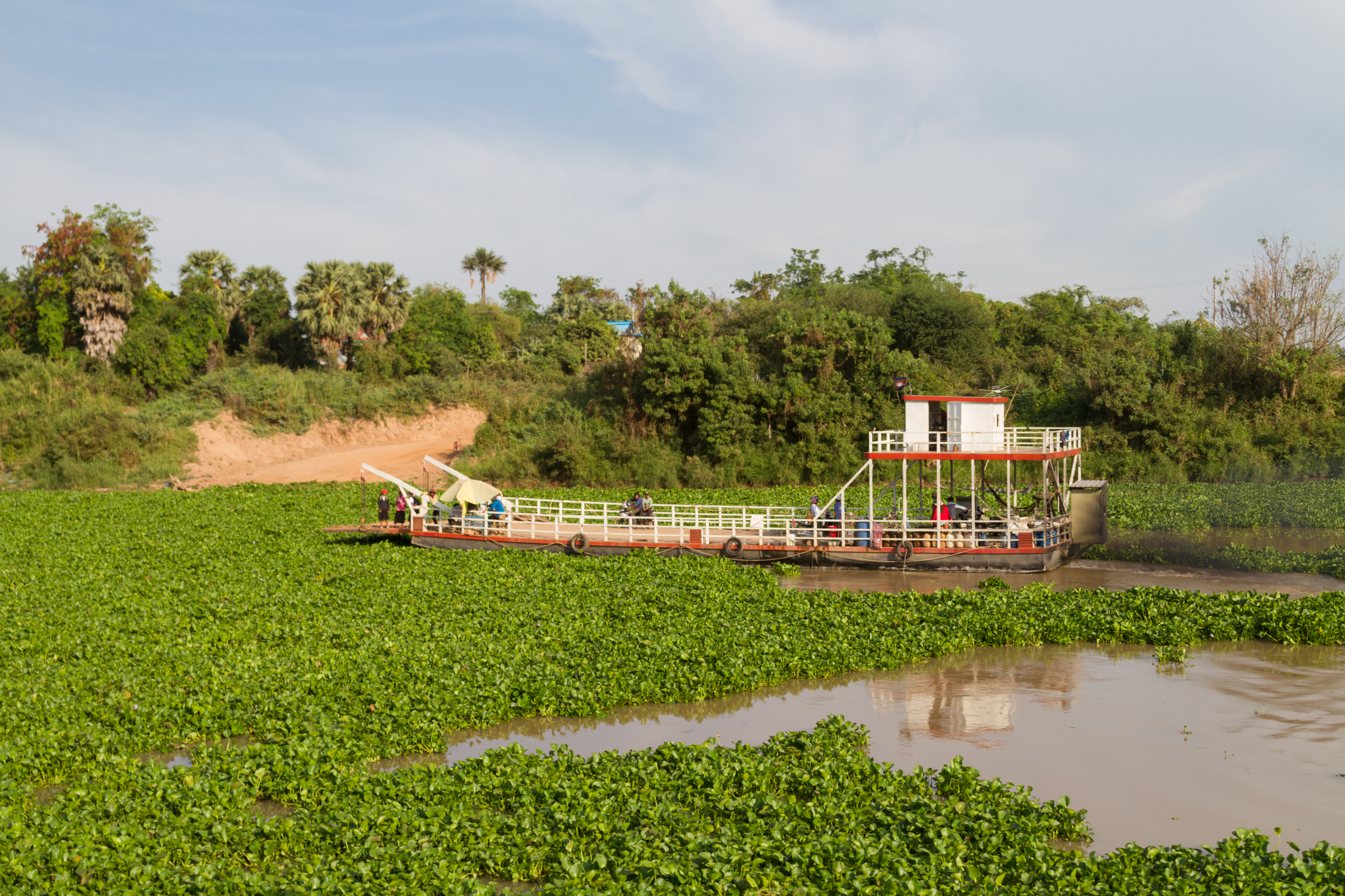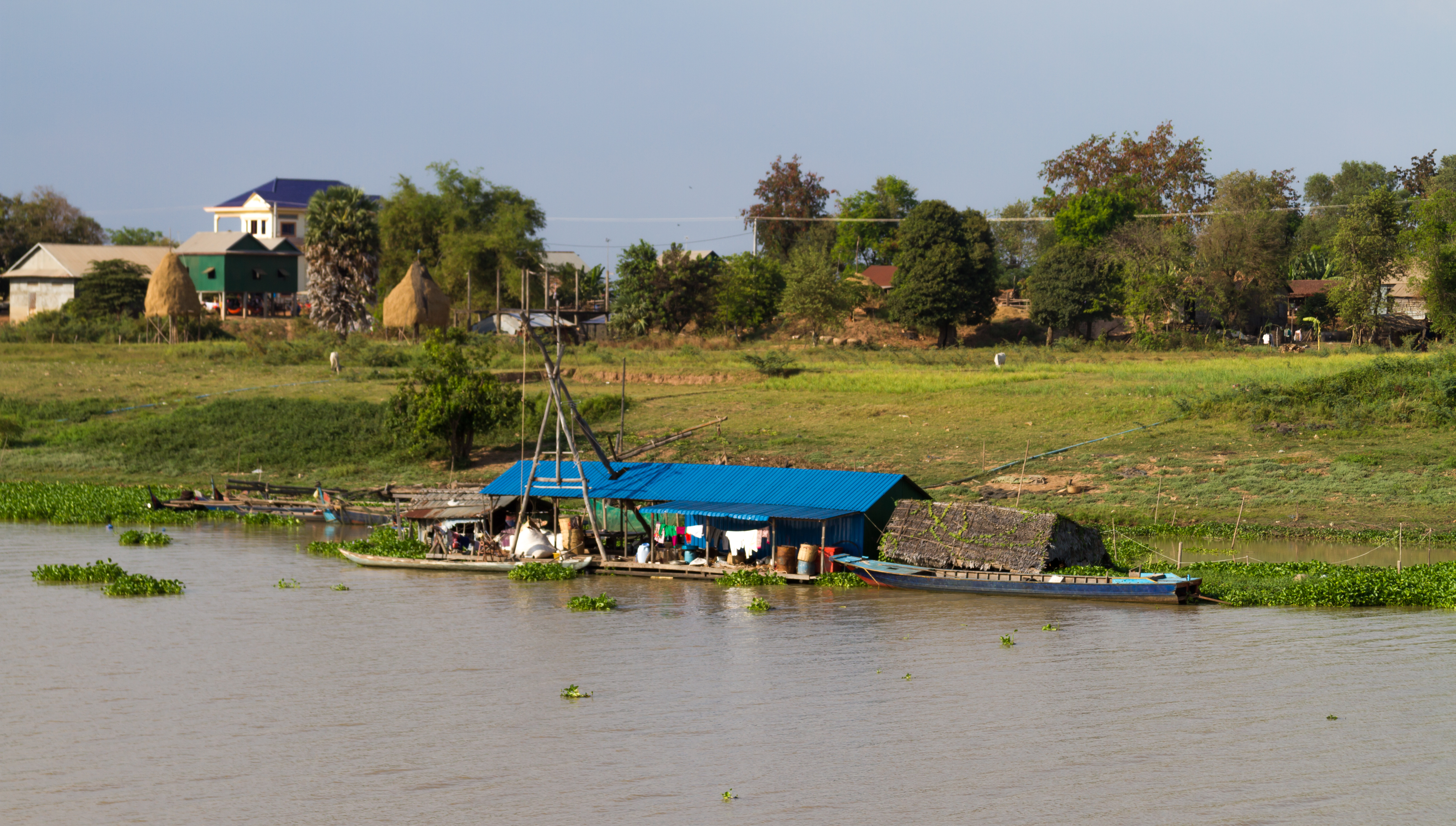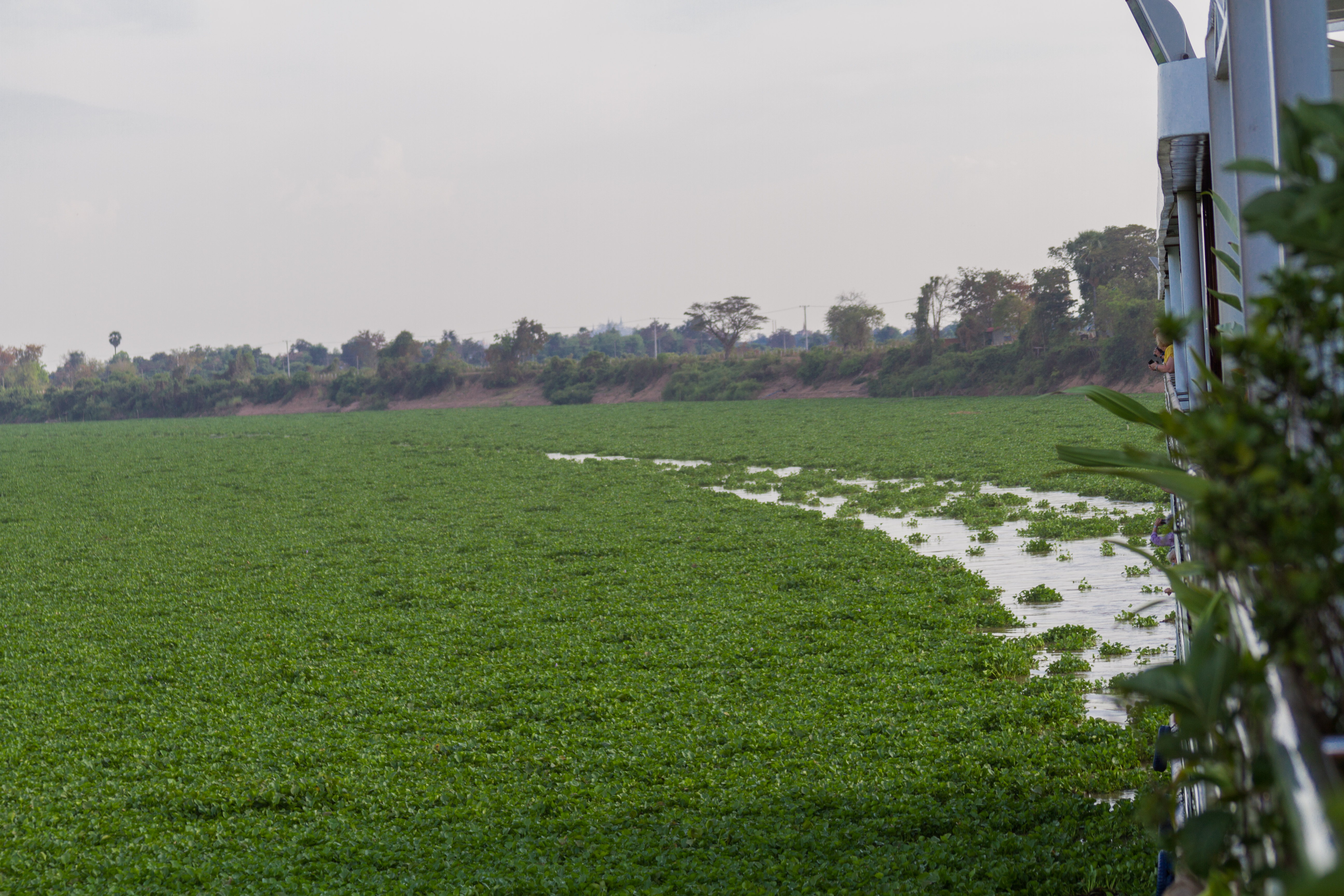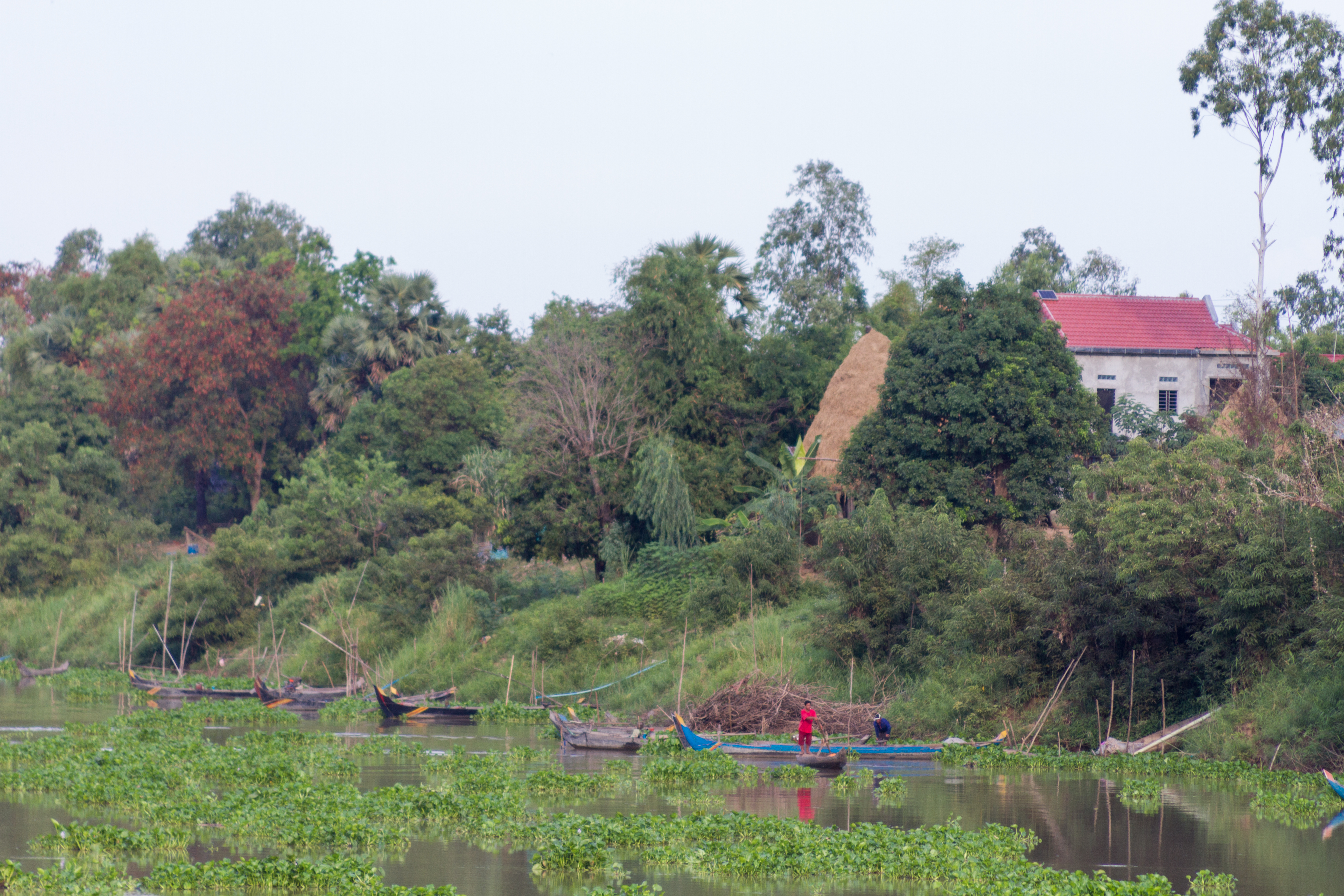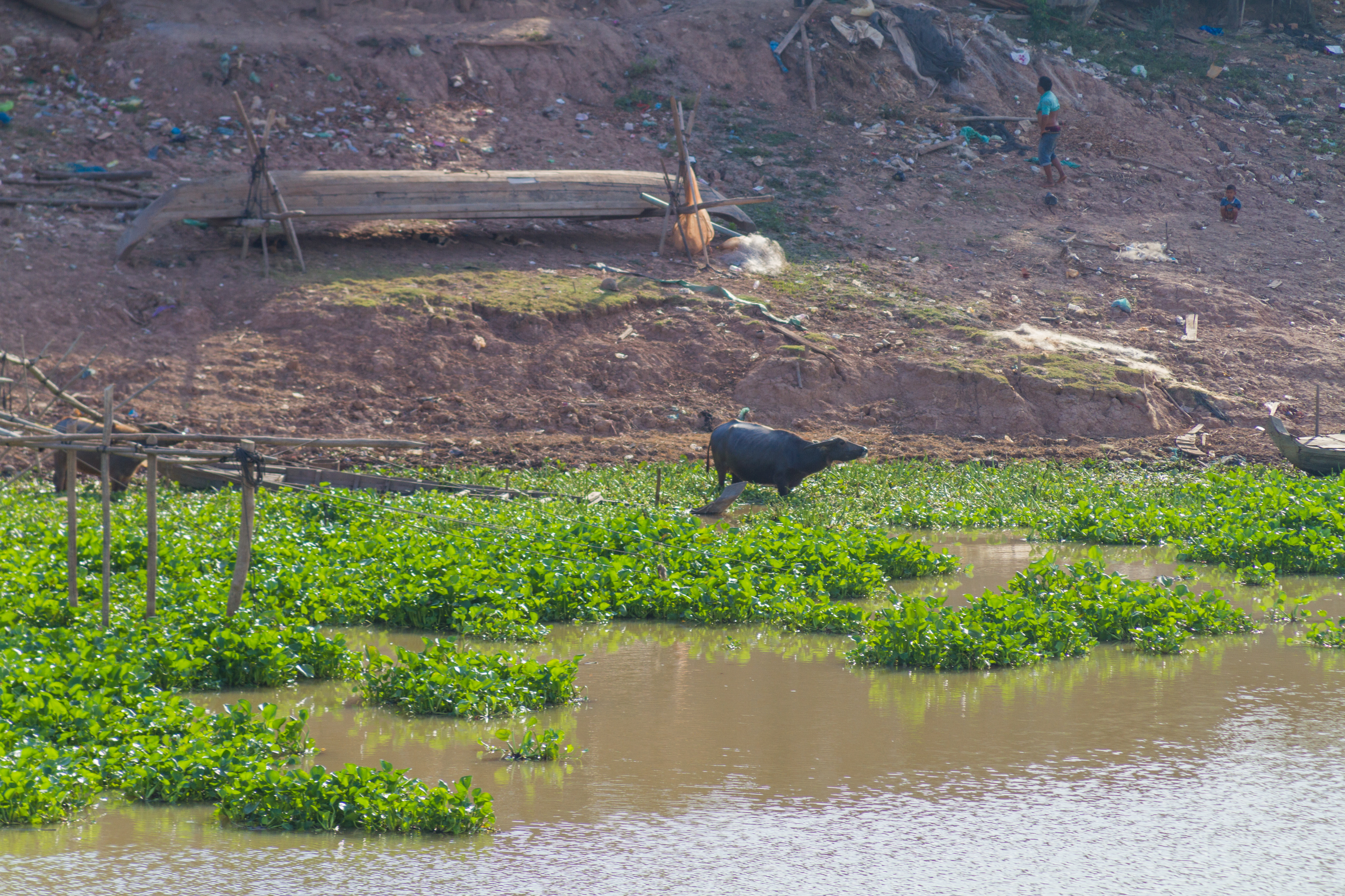 By mid-afternoon we made it to the boat. We are starting out on the Tonle Sap River and will go to the Tonle Sap lake before heading out on the Mekong River. The Tonle Sap River is unusual as the direction of the river changes twice a year. We are starting out going upriver based on current currents. We managed to be here during the 1.5 weeks out of the year that the Tonle Sap River is covered by water hyacinth. It looked like our boat was floating through a field. Very pretty. We also got to see “everyday life” along the river with houses, ferries, fishermen, kids, water buffalo, etc.