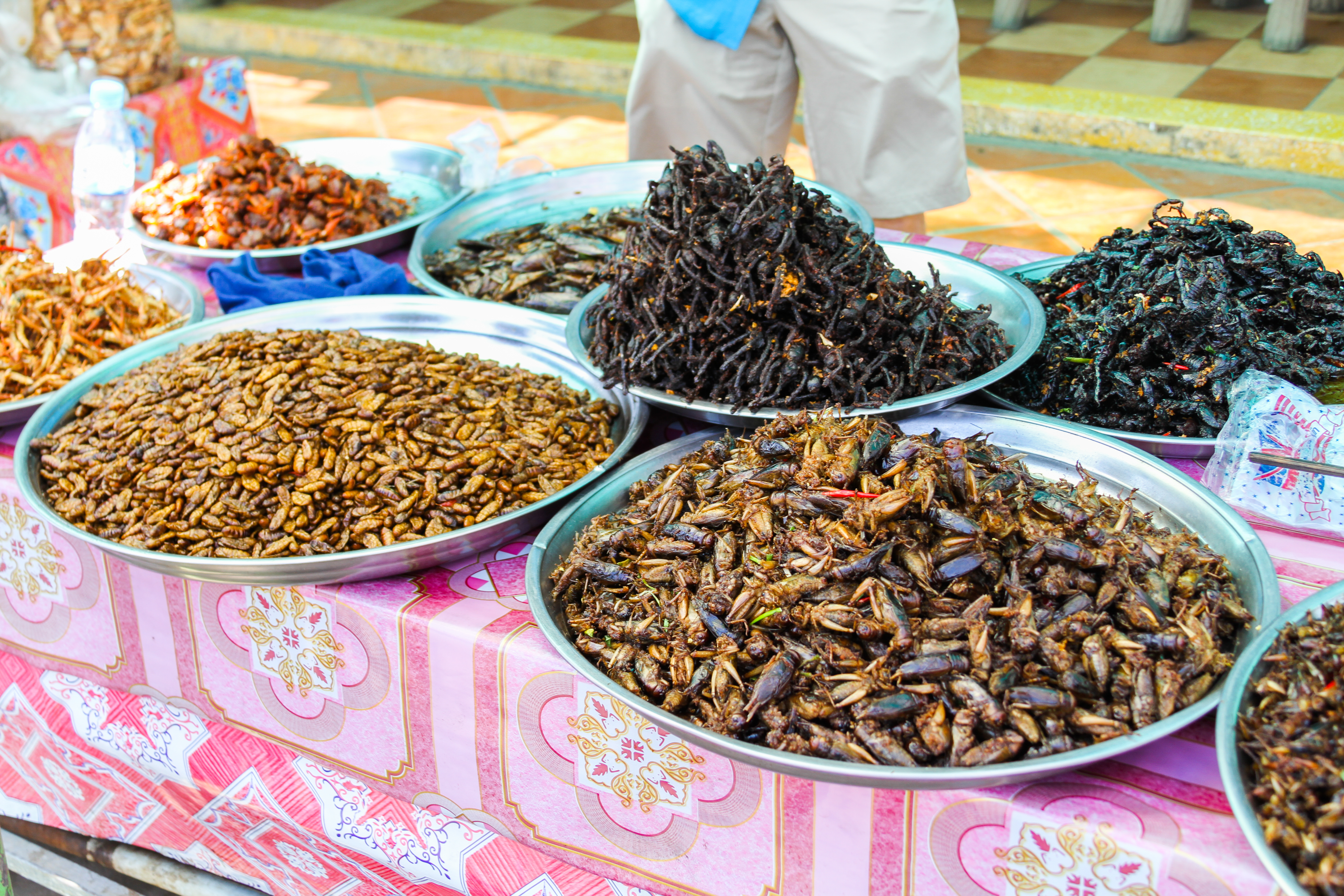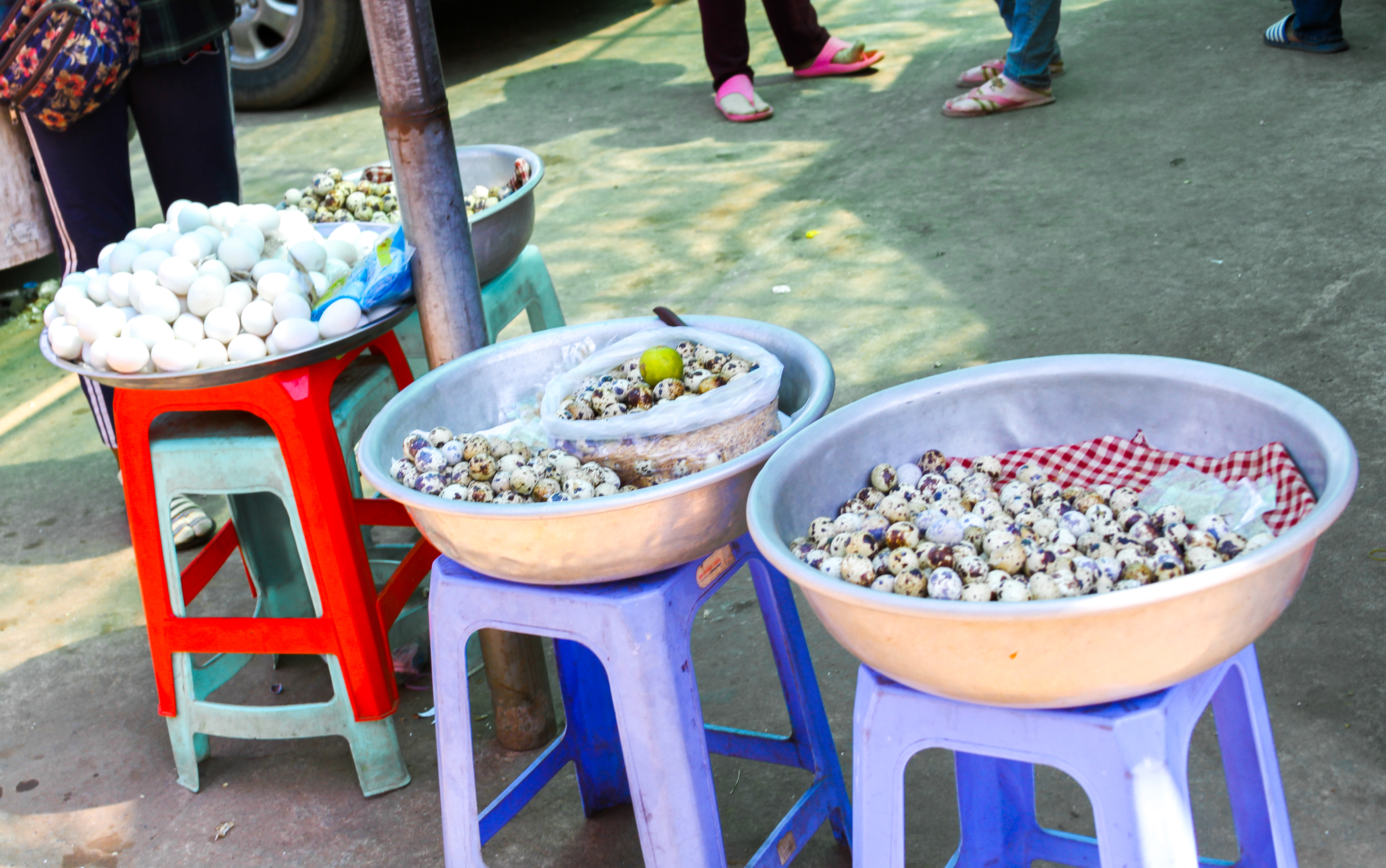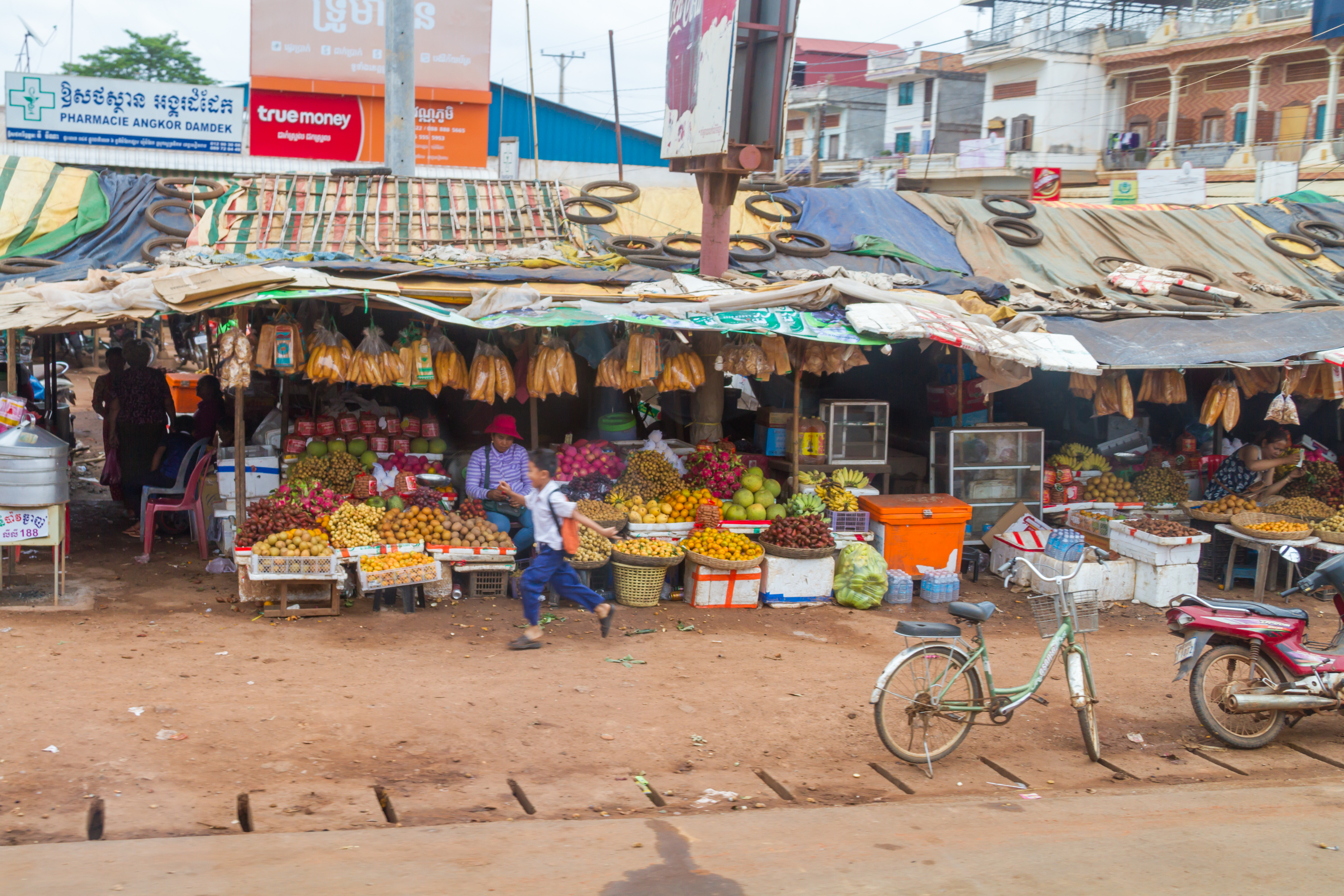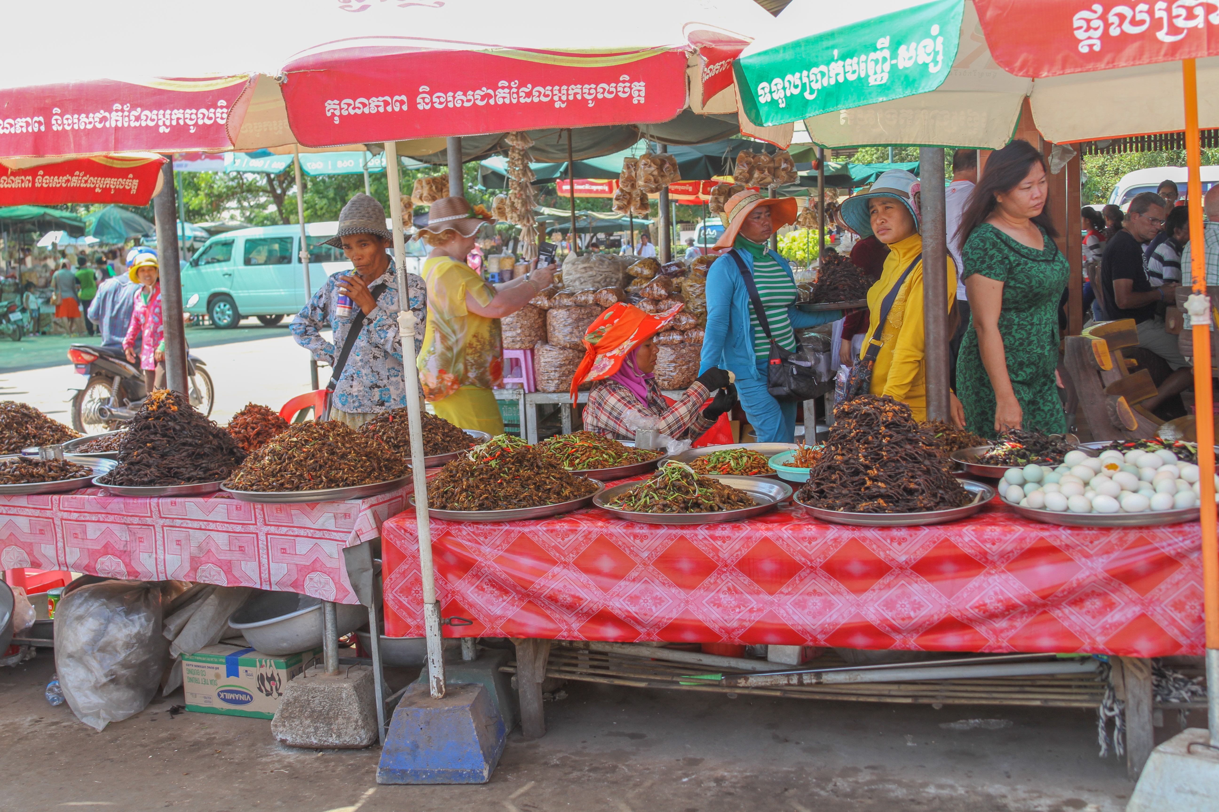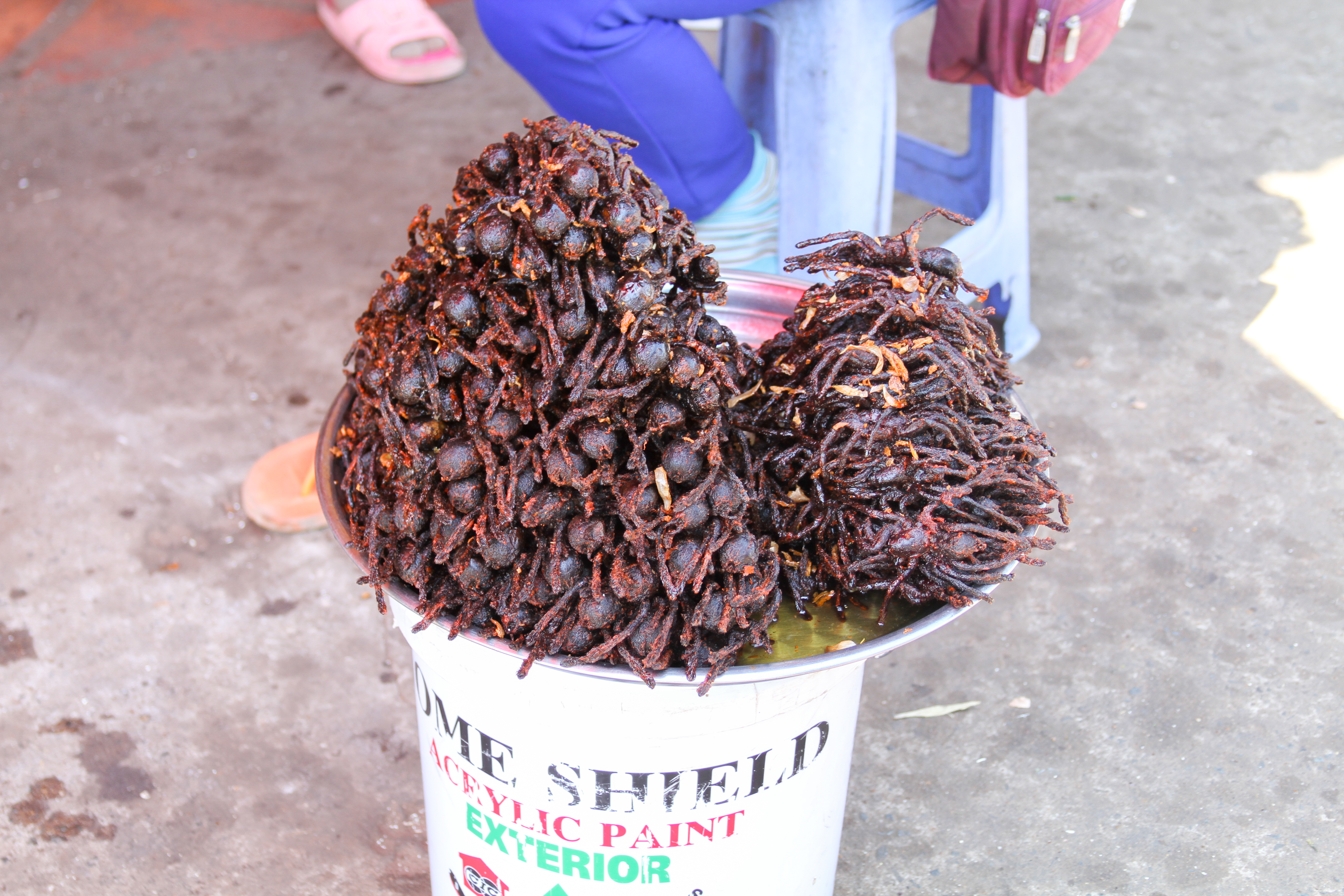 We stopped for lunch at Prey Pross, eating a decent boxed lunch by a lake. We later stopped at Skun, which is apparently called “spider town” because of all of the local tarantulas. Our guide said that the locals not only eat them, but they also will cut off their fangs and carry them around. Paul had a kid come by to see if he wanted to hold one of them. There was a market there with all kinds of fried insects, spiders, and scorpions along with eggs and deep fried whole quail and what appeared to be small chickens. There also were fruit and vegetable stands. This area is know for growing cashews as well.