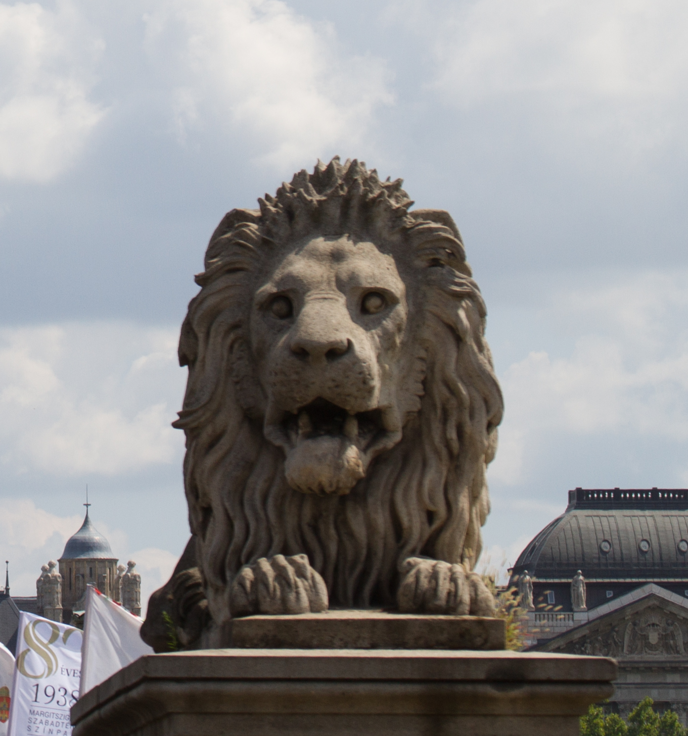 Lion at the end of the Chain Bridge at the base of Gellert Hill