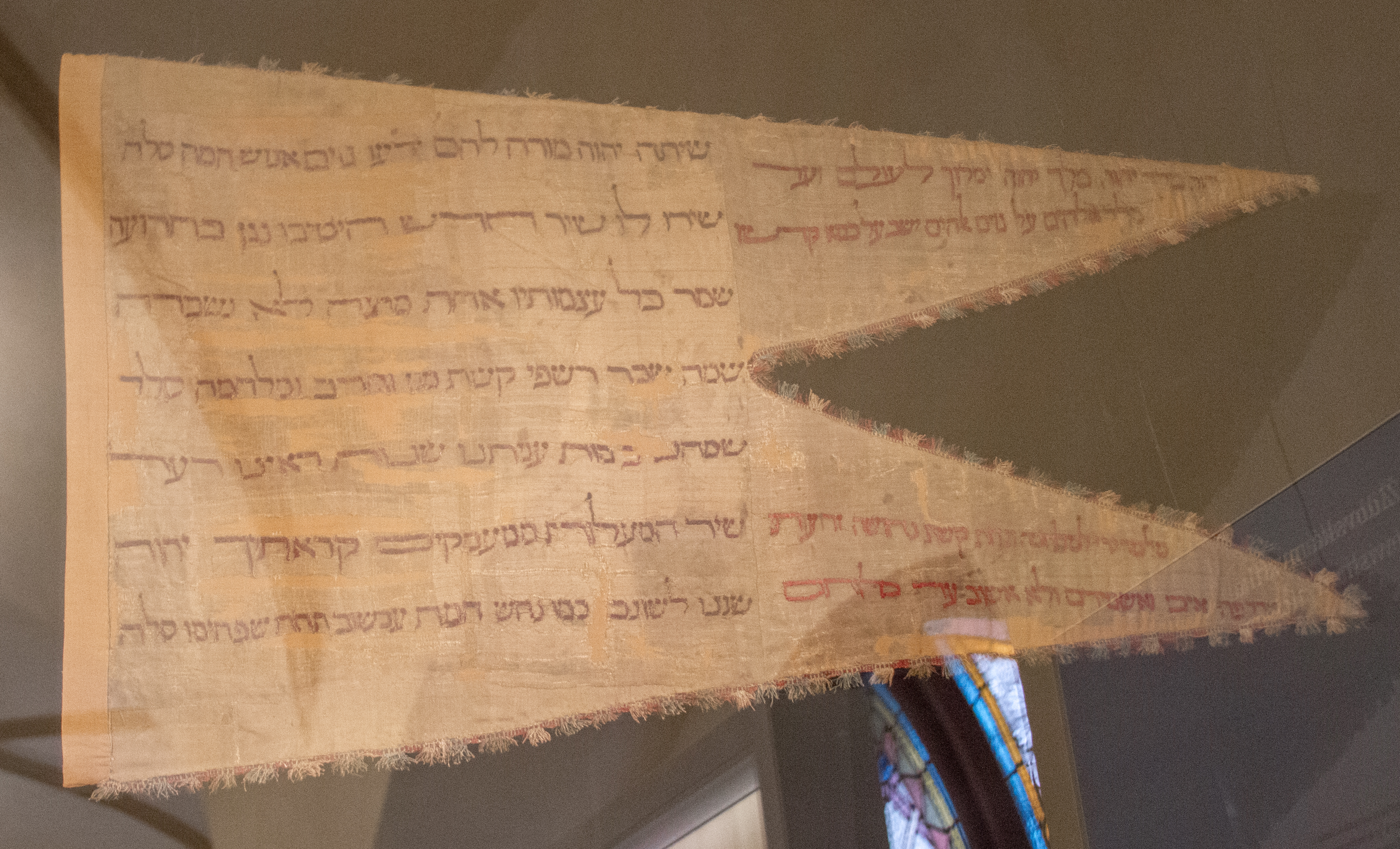 Flag of Solomon Molcho from the early 1500s. This is made of silk and has part of Psalms and the book of Solomon embriodered on it