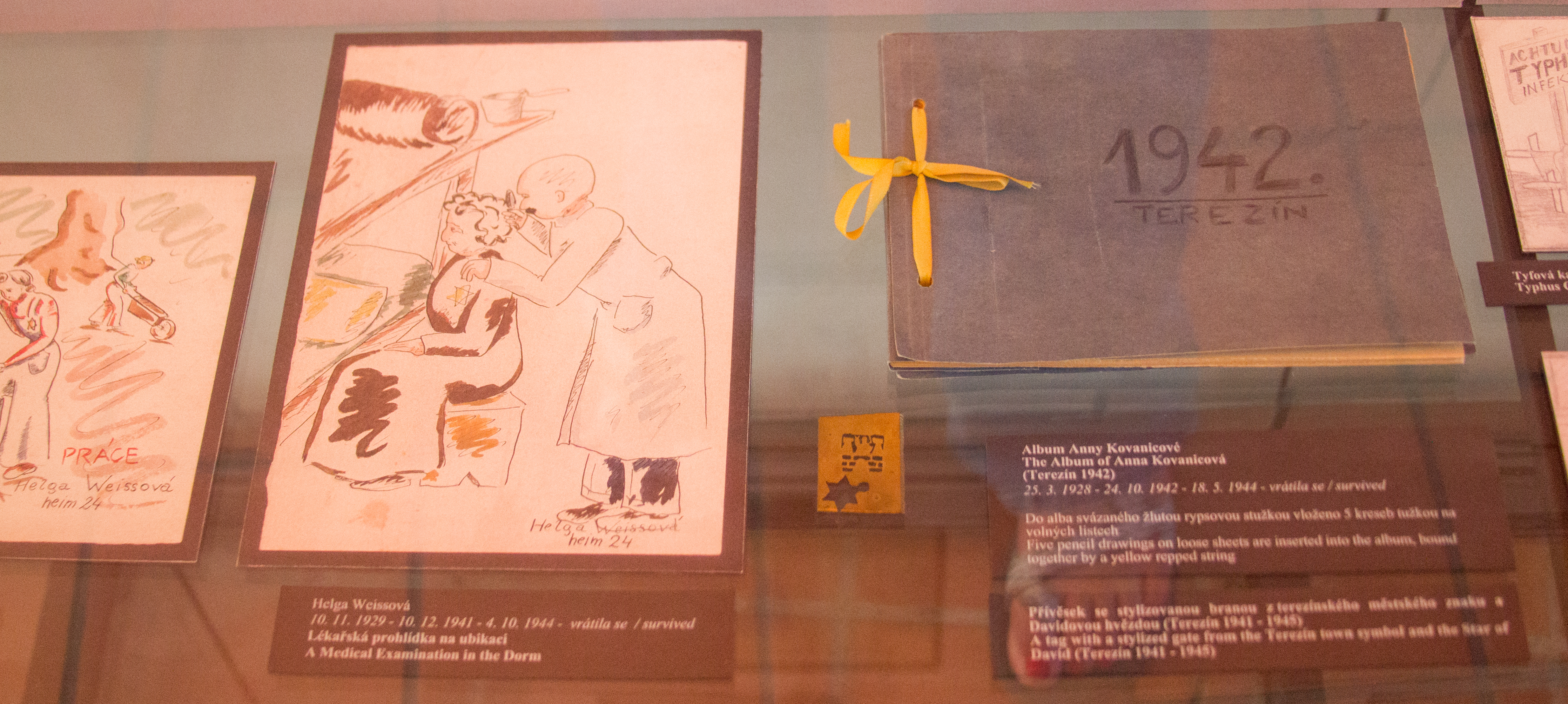 We then walked to Pinkas Synagogue. The Horowitz family lived on this site as far back as 1492 and in 1535 the family replaced the house with a synagogue for the family. This was expanded over time. In the late 1950s, the walls of the synagogue were covered with the names of the Czech victims of the Holocaust. They also have an exhibition of pictures drawn by children who were in the concentration camp in Terezin. These were done as part of school lessons of Friedl Dicker-Brandeis. Before the war she was an artist and textile designer. She and her husband had both been at Terezin, but then her husband got sent to Auschwitz and she volunteered to join him. Before she left Terezin, she gave 2 suitcases with 4500 of the children’s drawings to a tutor to later brought them to the Jewish Community in Prague. Friedl Dicker-Brandeis died in Auschwitz. Her husband survived. Paul and I visited Terezin when we were in the Czech Republic previously and saw some of the children’s drawings then, but we didn’t know the story behind them.