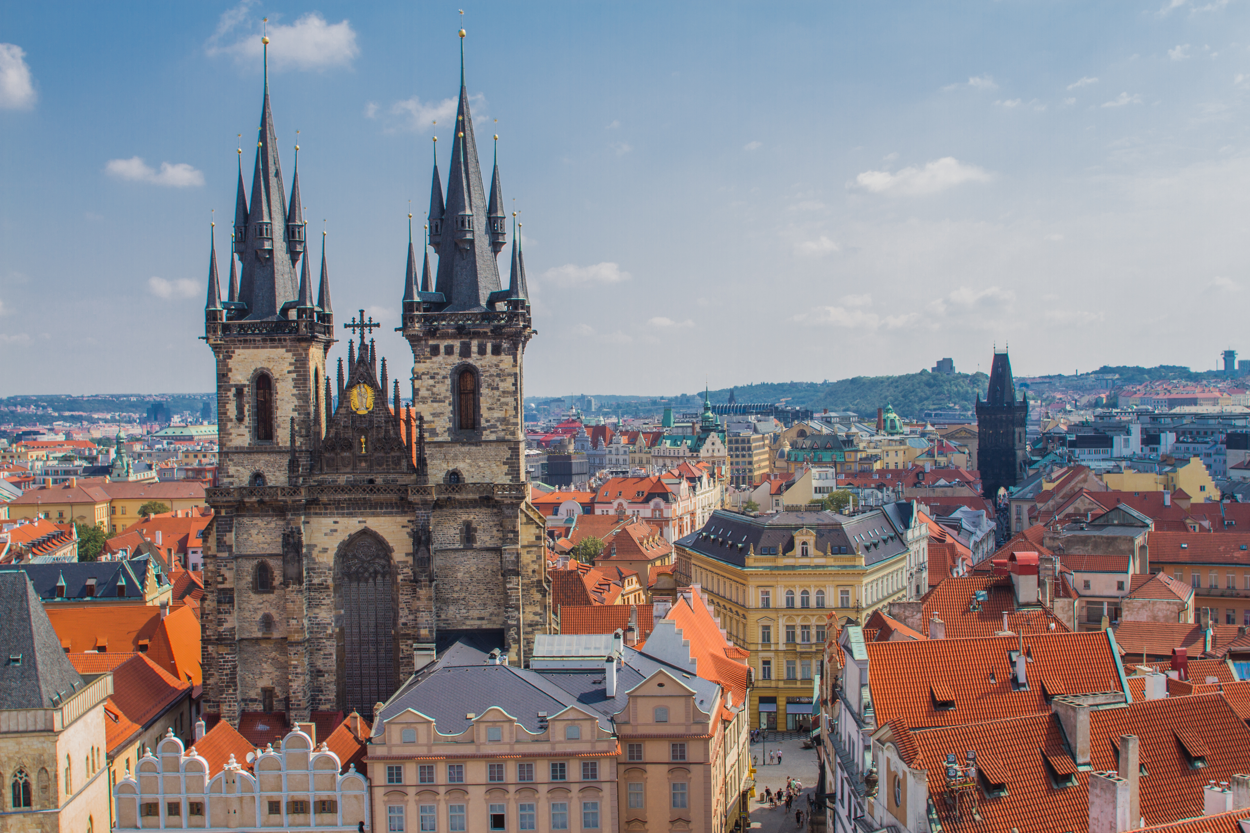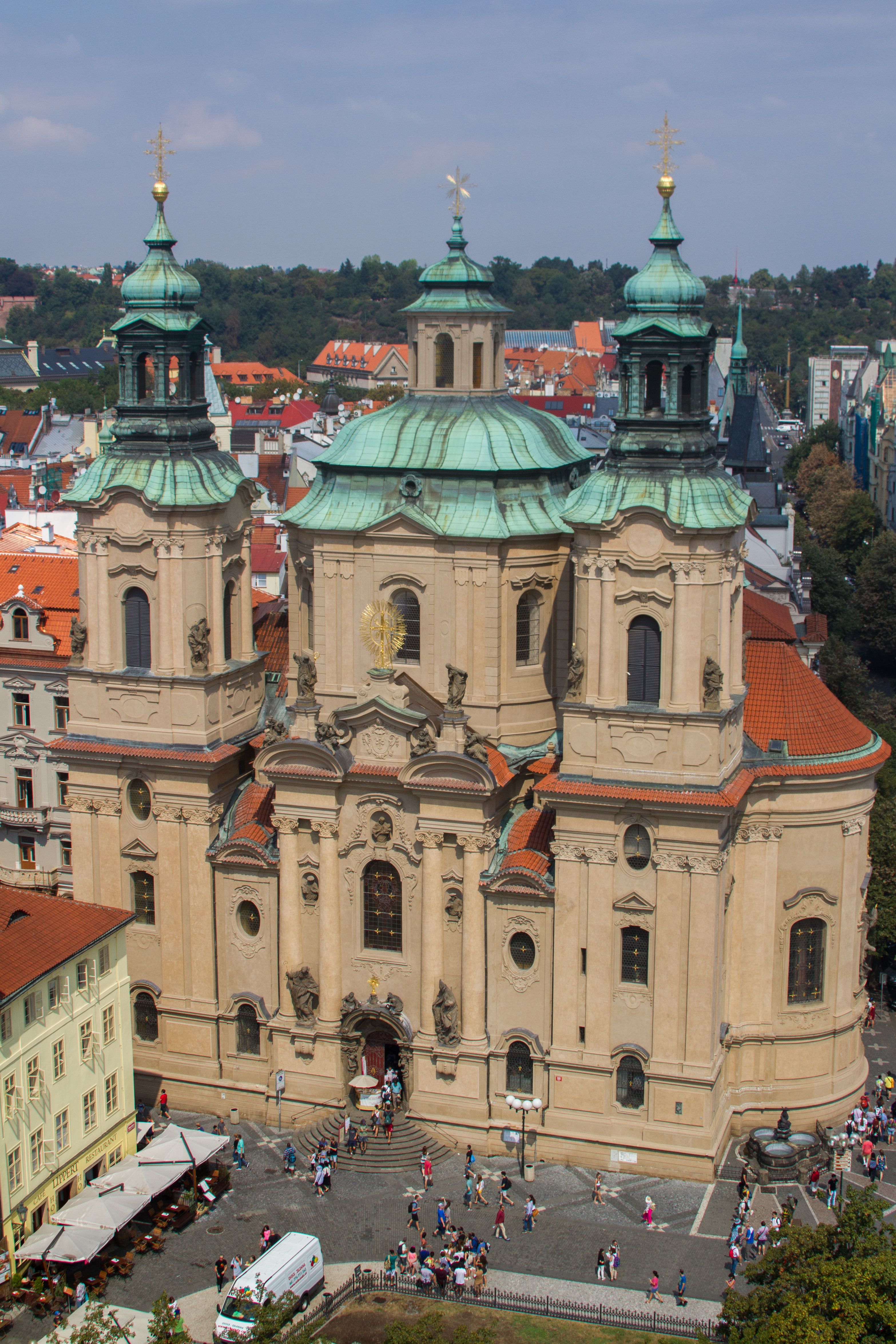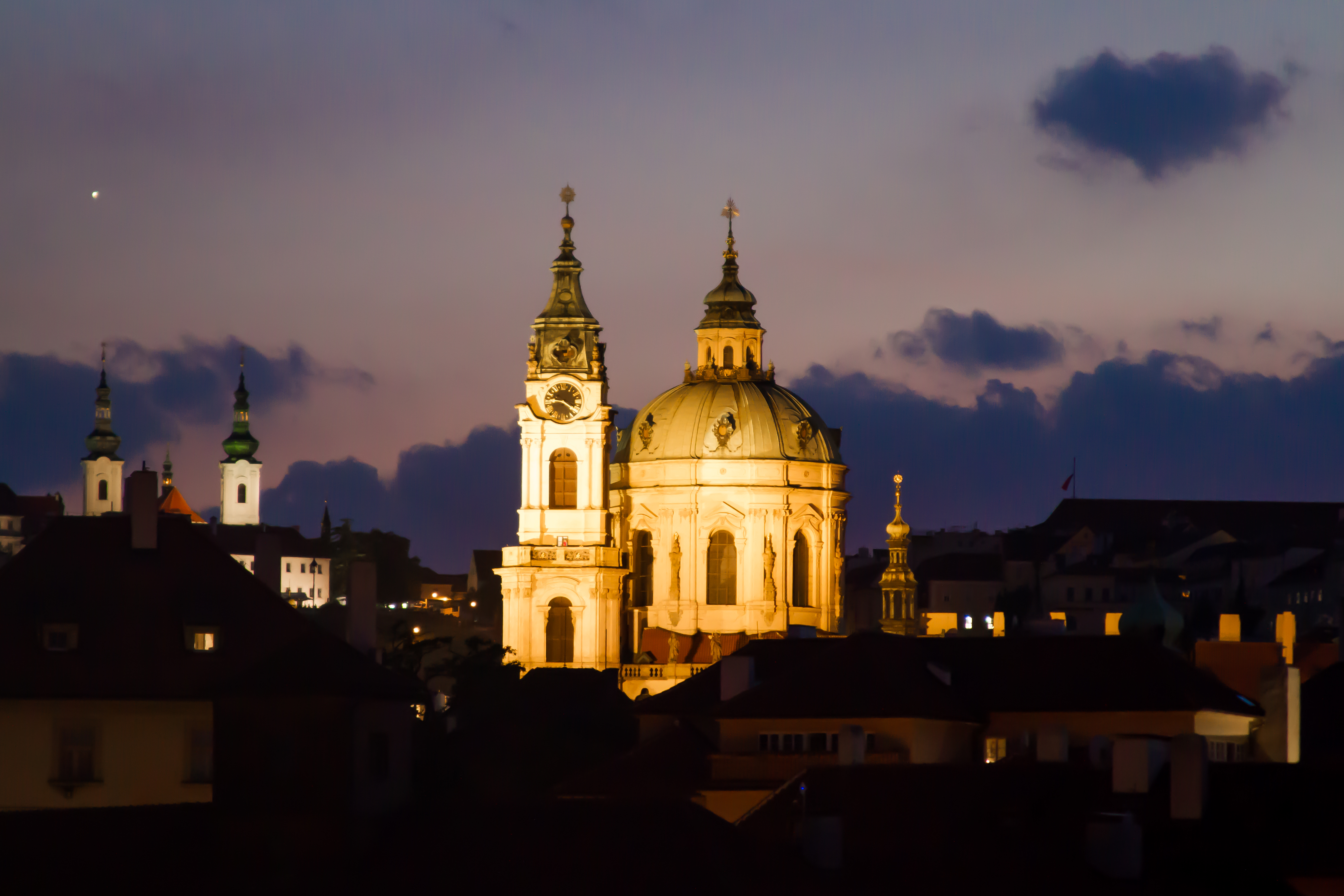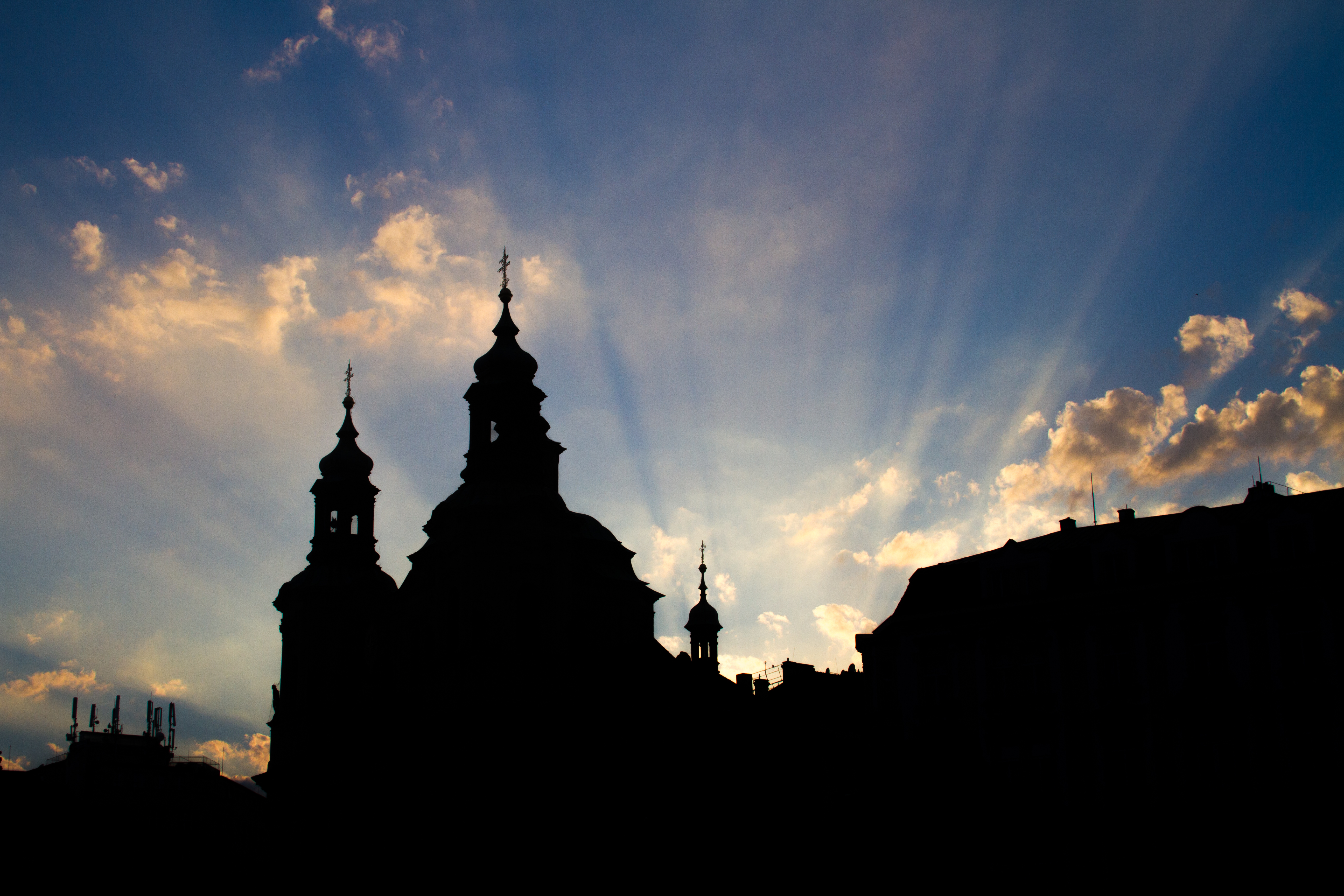 Sun’s rays as it sets over St Nicholas Church on the Old Town Square