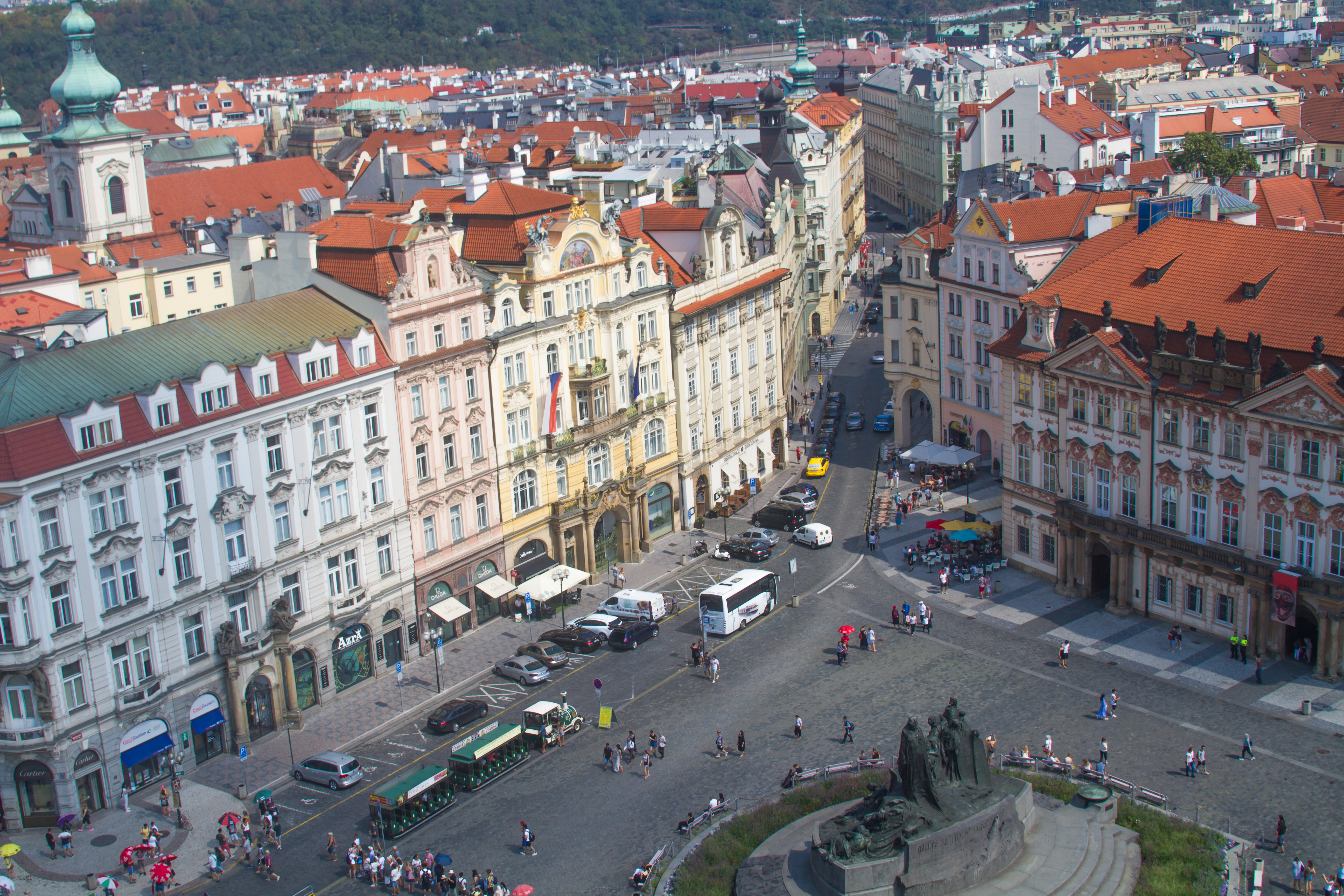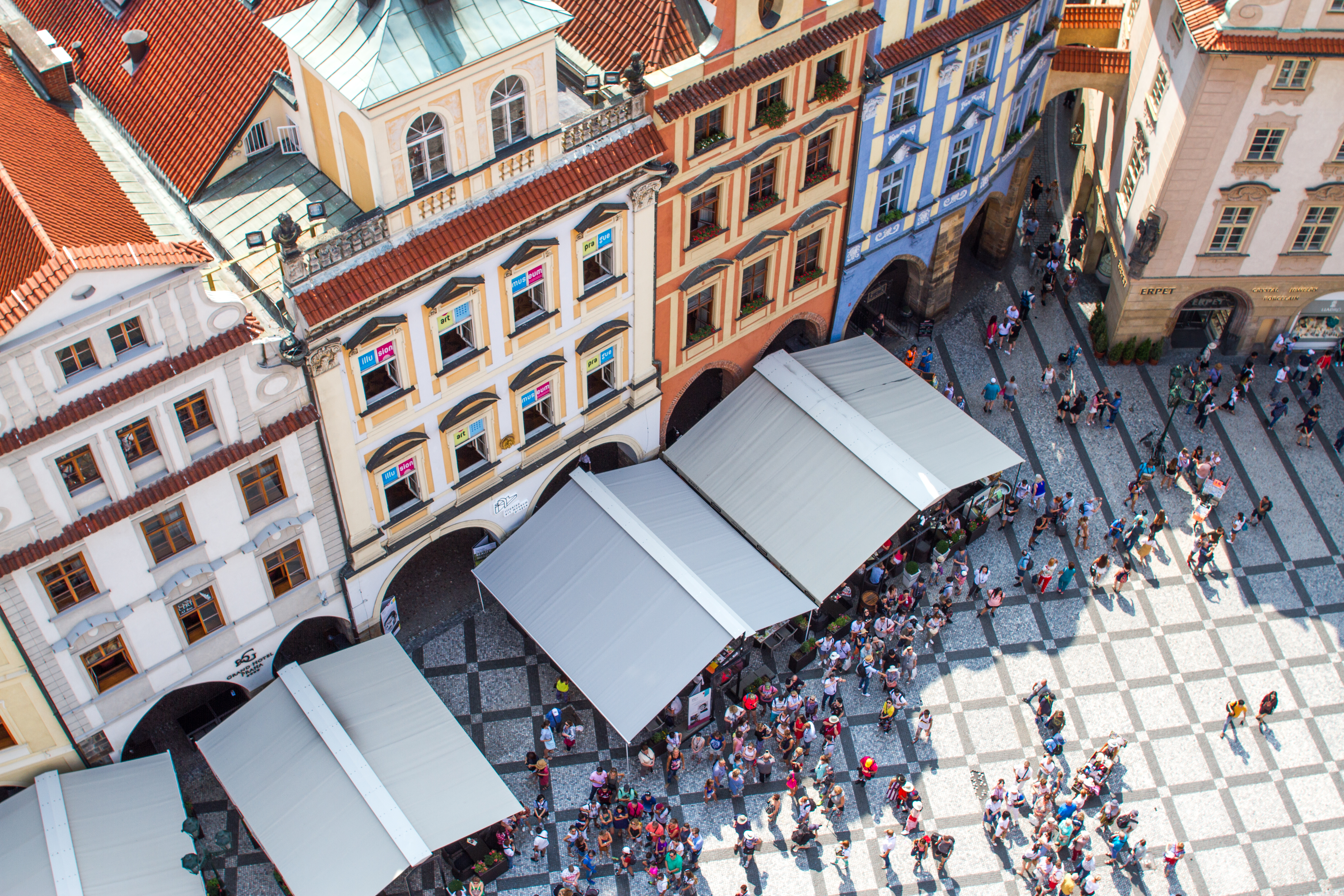 We then went back to our planned city hall tower tour. We started by going up to the top of the tower. Fortunately for me, this involved an elevator. City hall sits on the old town square, which is where we have been having dinner. The view was wonderful and we had the benefit of a beautiful sky. The Old Town Hall was established in 1338. The tower was completed in 1364 and was the tallest building in Prague in the Middle Ages. The tower remains largely unchanged, although the adjacent wing of the town hall was damaged on the last day of WWII and was torn down. One side of the tower has the astronomical clock, which dates back to 1410. Right now it is being renovated, so it is covered. After our great views from the tower we took a formal guided tour of the town hall which included the Romano-Gothic cellars from the 12th century. Portions of these cellars were used in the Prague uprising to fight against the occupation during WWII.