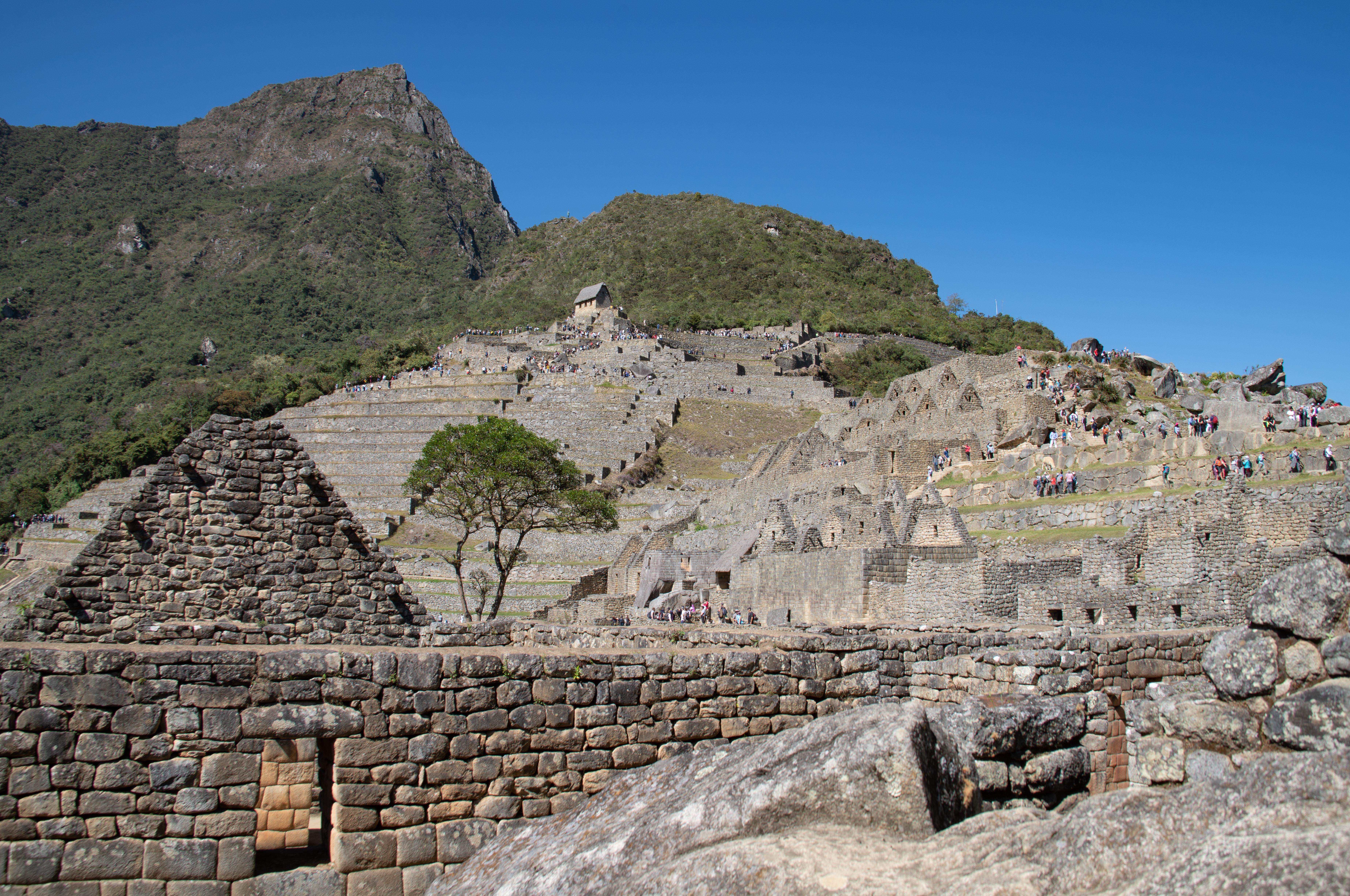 Machu Picchu was still being expanded when it was abandoned. This has helped in the understanding of how it was built. First off, they used the local stone in that part of the Andes, white granite, for construction, largely using natural cracks to make the stones for much of the construction. This means that, instead of the common Incan practice of uniform stones, much of Machu Picchu is constructed with stones of different sizes. Also, they did not use wheels. They did, however, use levers and cylindrical rollers to move larger stones. They didn’t use mortar, instead placing stones directly together. They used various architectural features to stabilize the structures against erosion and earthquakes.