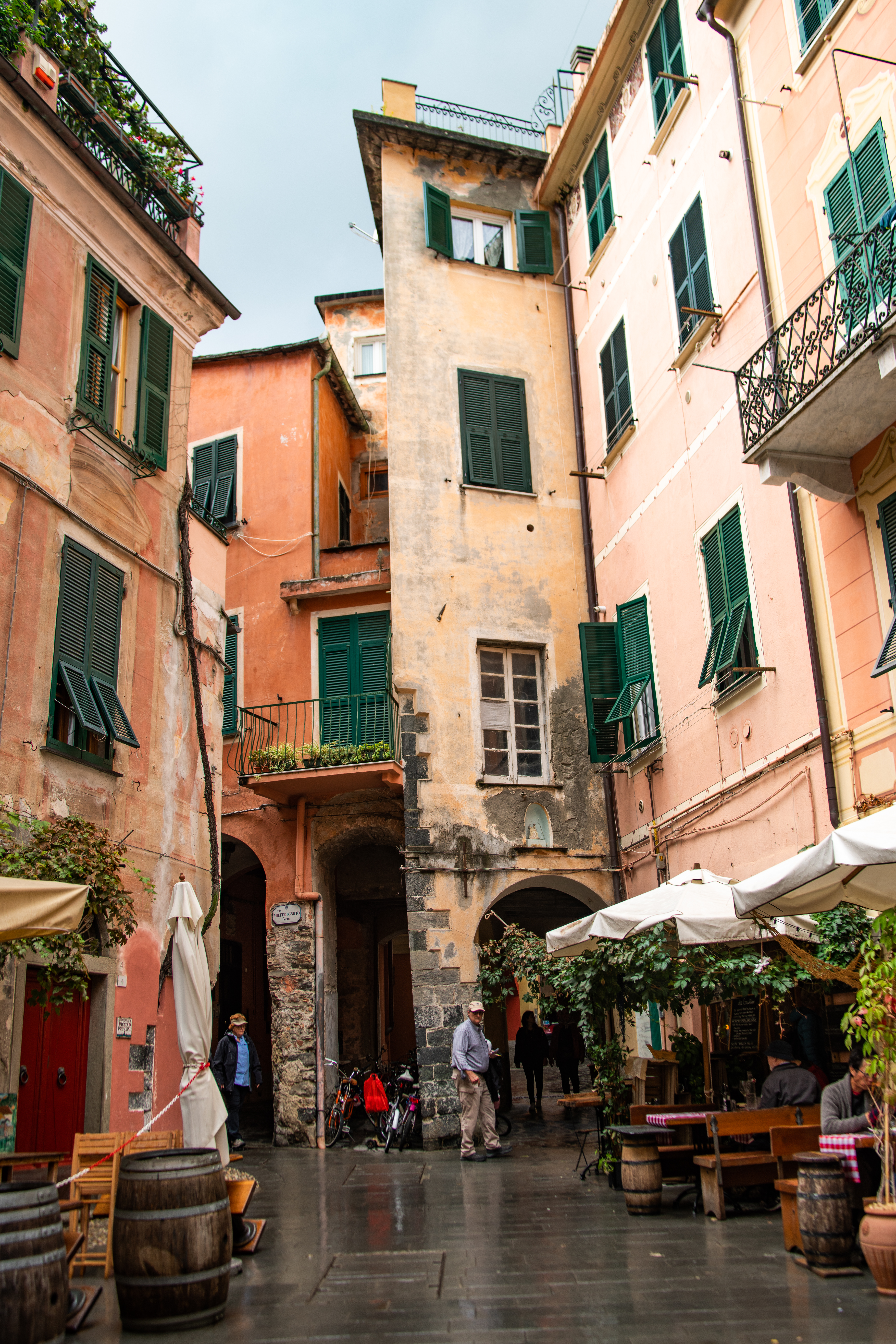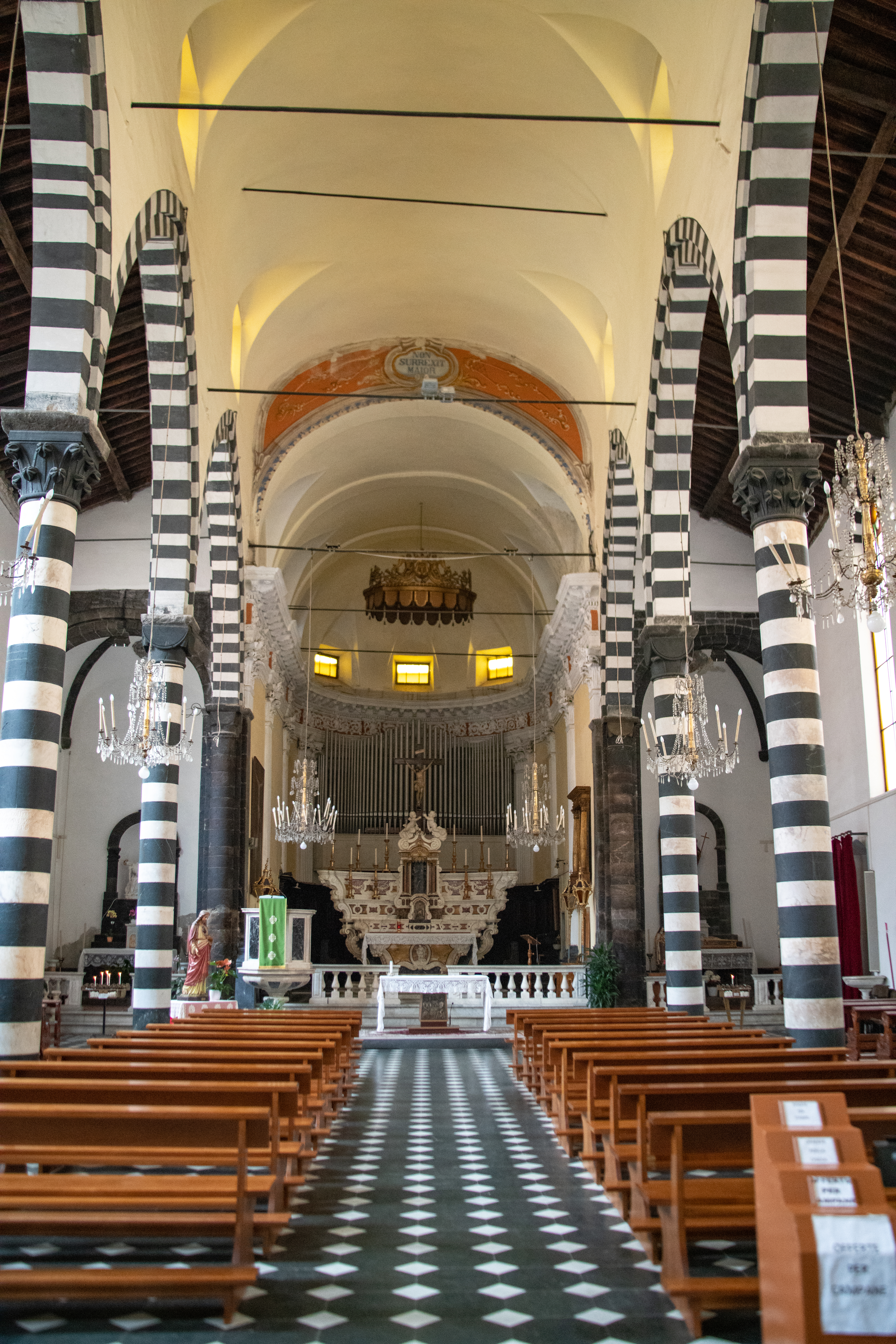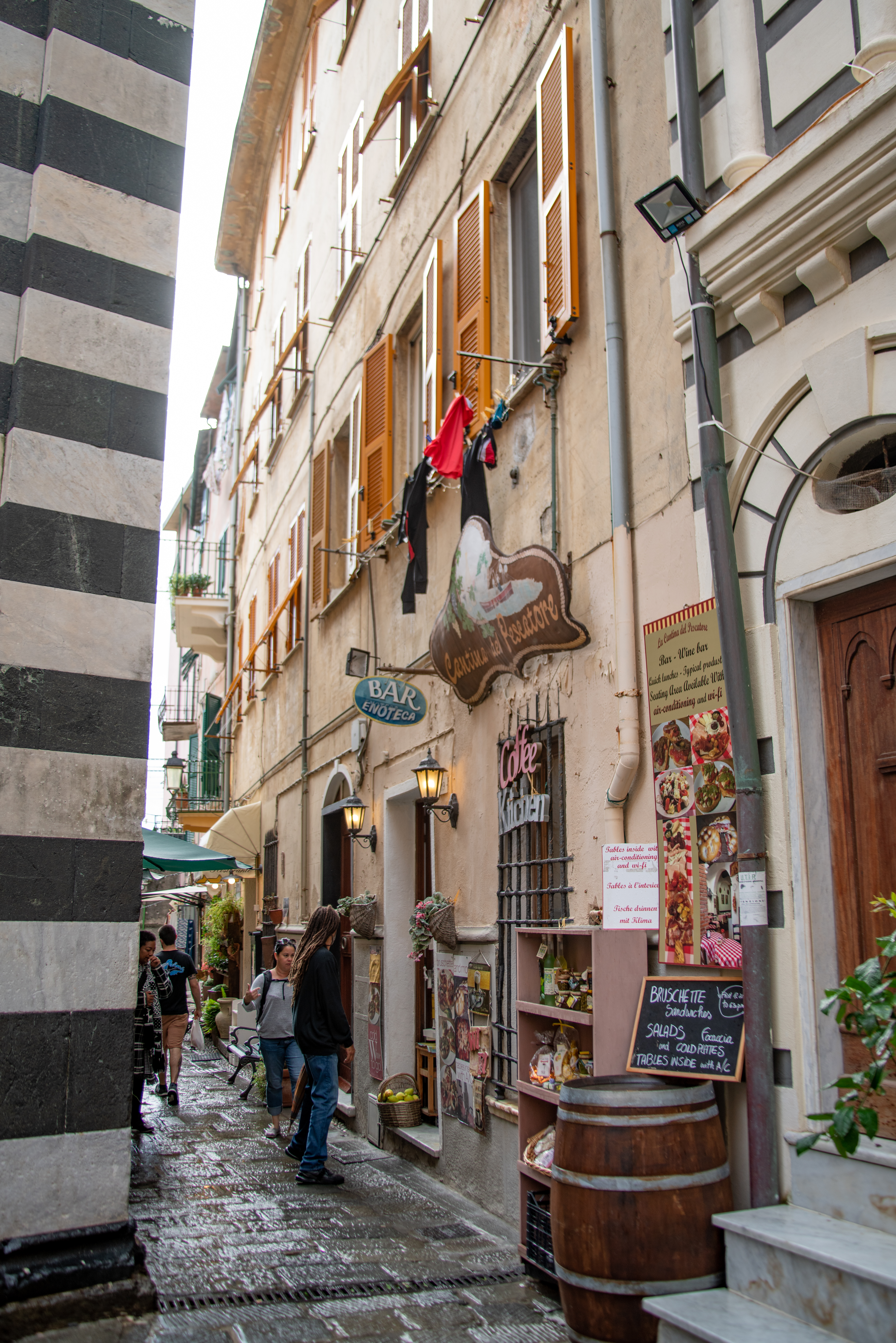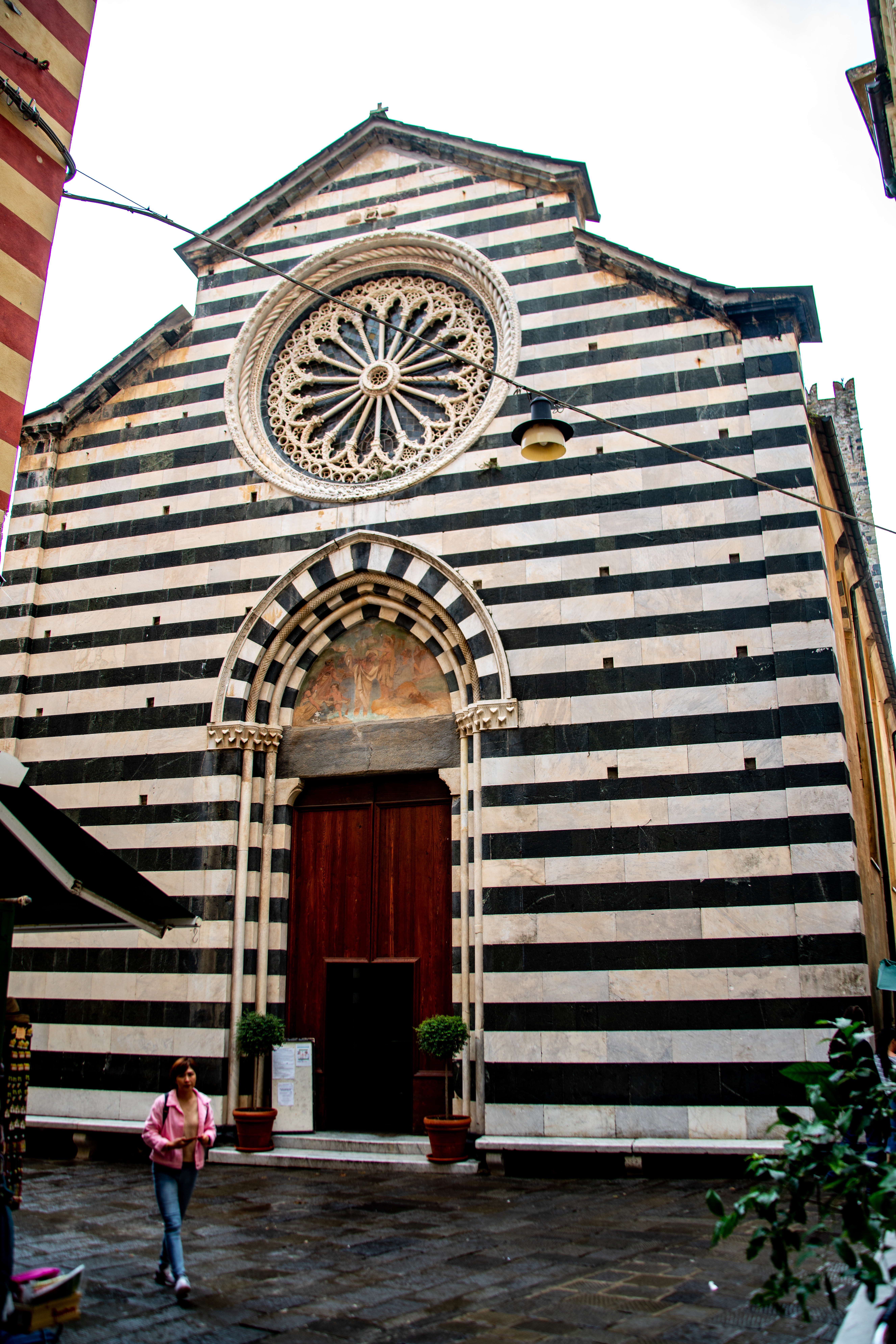 We started out at Monterosso al Mare, which has an old town and new town which are separated by a small reef/rock formation. You can go between the two through a tunnel or take a more scenic route by climbing over the rock formation (there’s a path and a restaurant at the top, so not a real climb). We had free time to walk around here. There is a large beach, although we definitely did not have beach weather. It was raining, sometimes heavily. It still was nice walking around the town and I managed to get good pictures. We went into the local church, St John the Baptist Church, which was built between 1244-1307. It’s an example of Ligurian Gothic architecture (not sure what that is, but that’s apparently what it’s called) and has black and white marble stripes on the outside. I think it looks like Beetlejuice, but it certainly is striking. The tower is a completely different style, which makes some sense since it was erected in the 15th century. We managed to avoid the heaviest rain during lunch (pure luck).