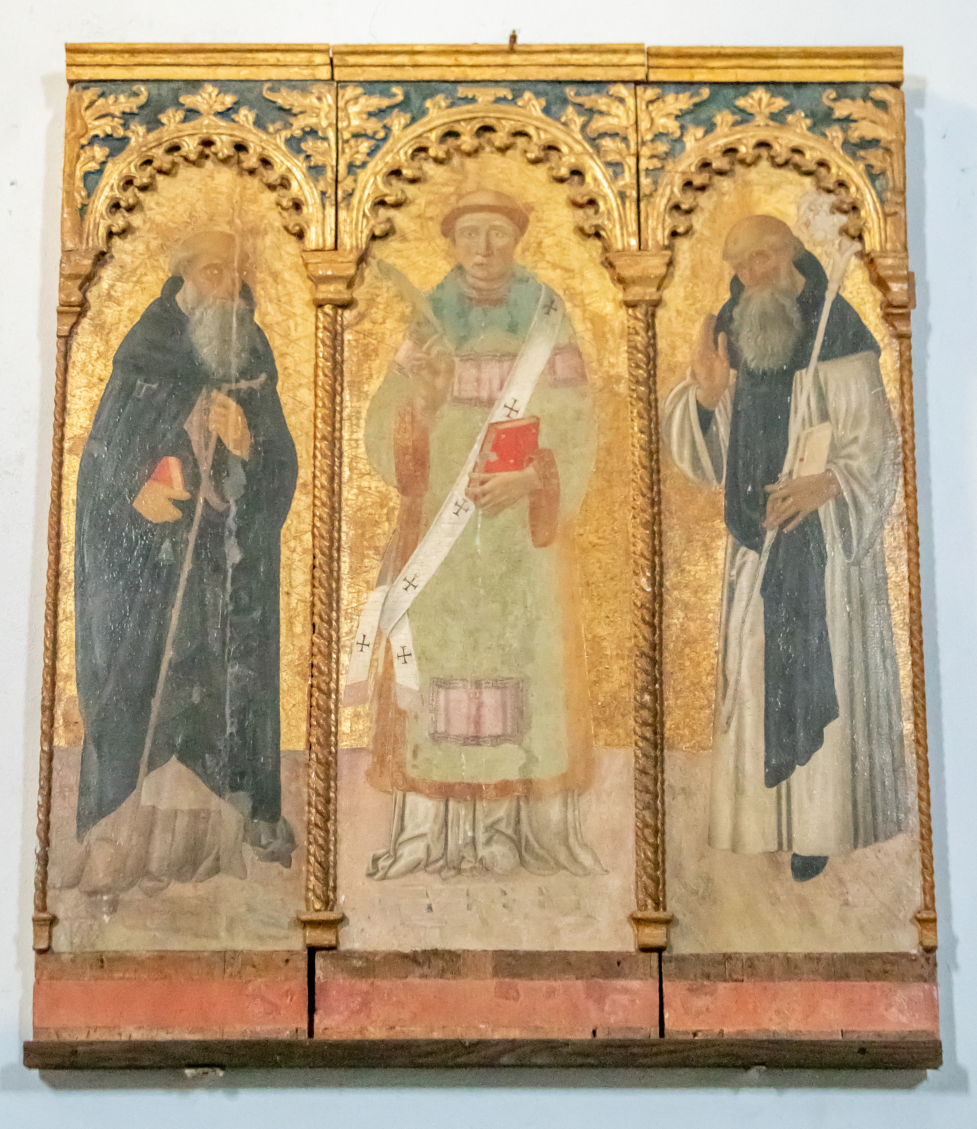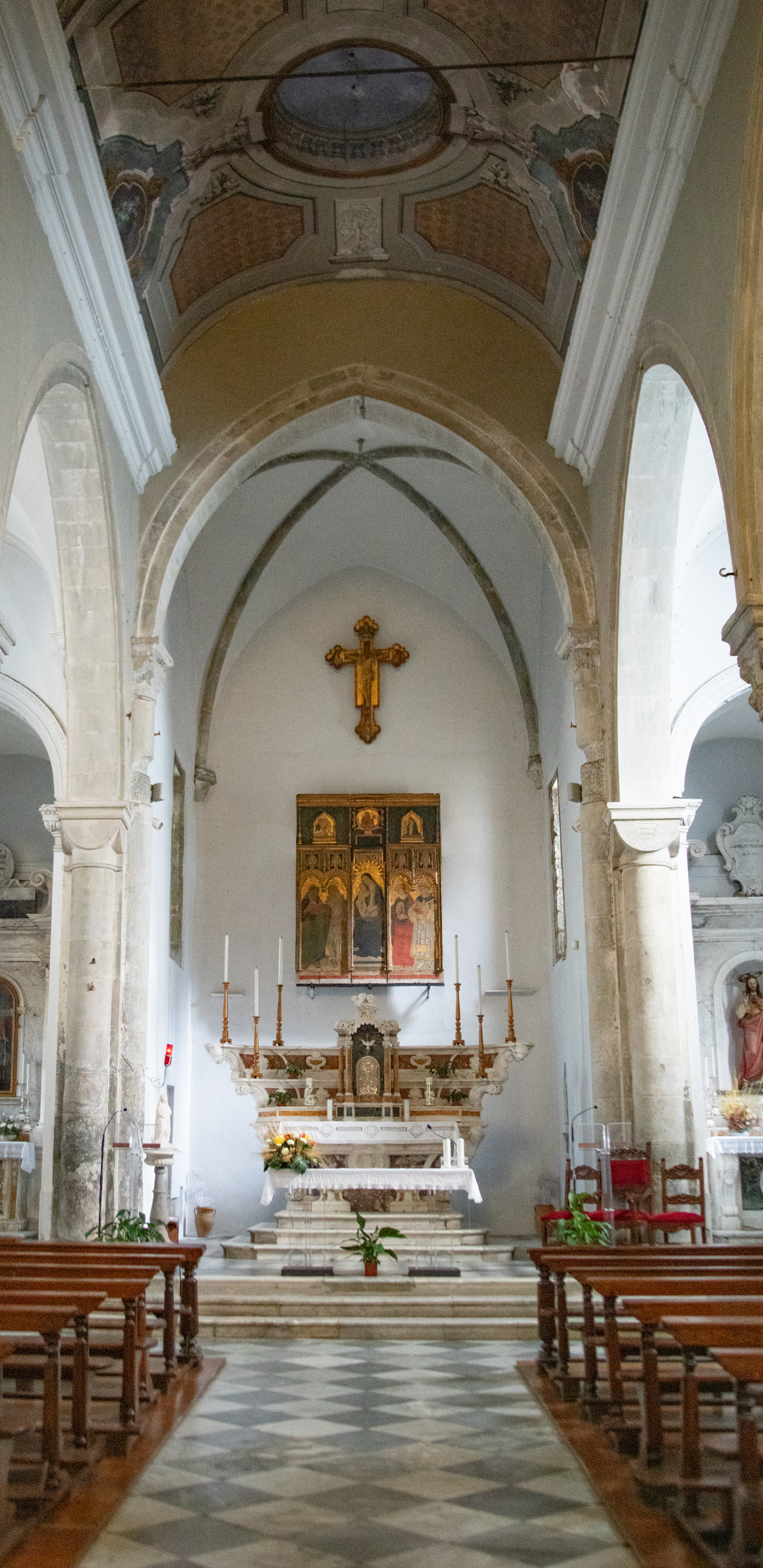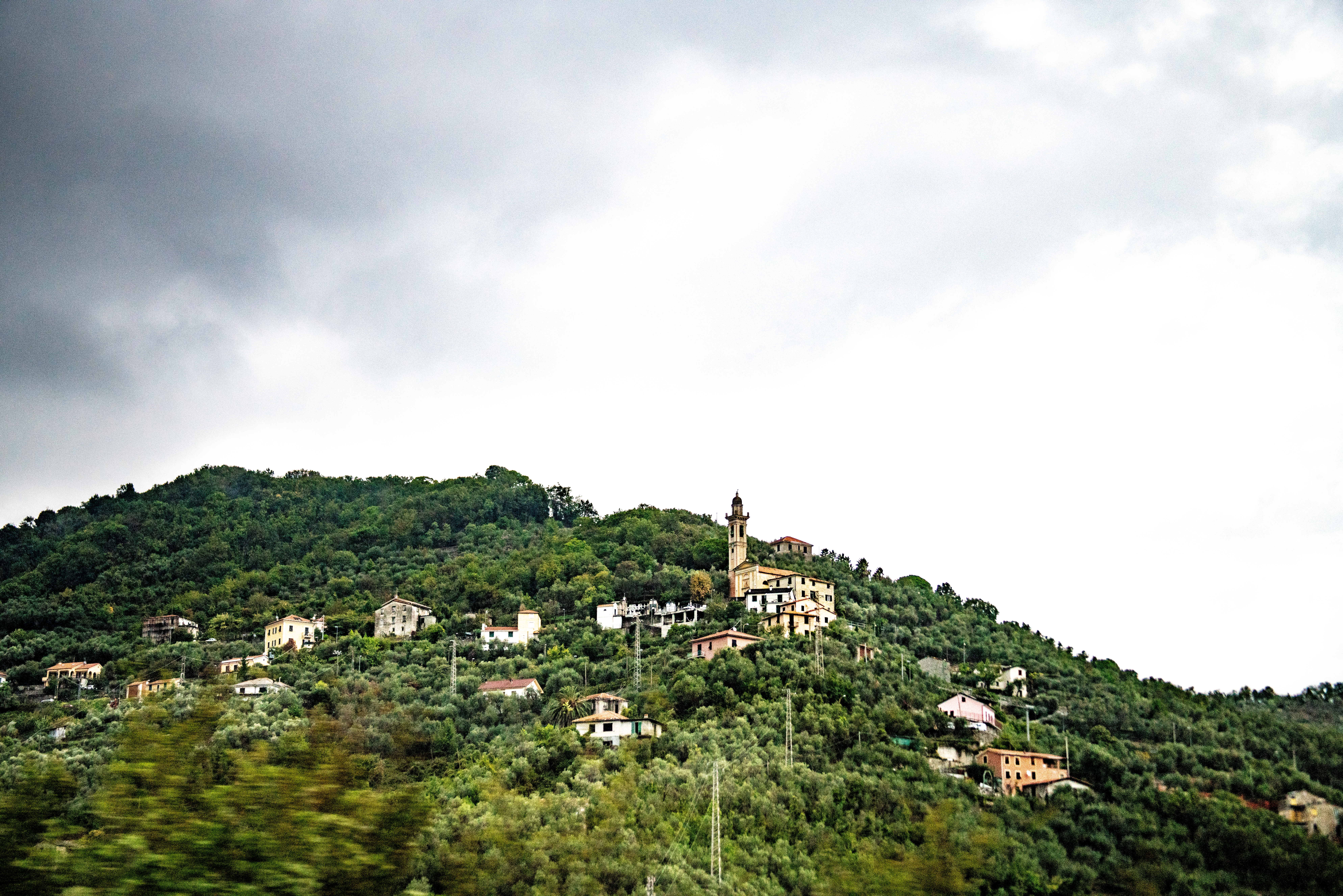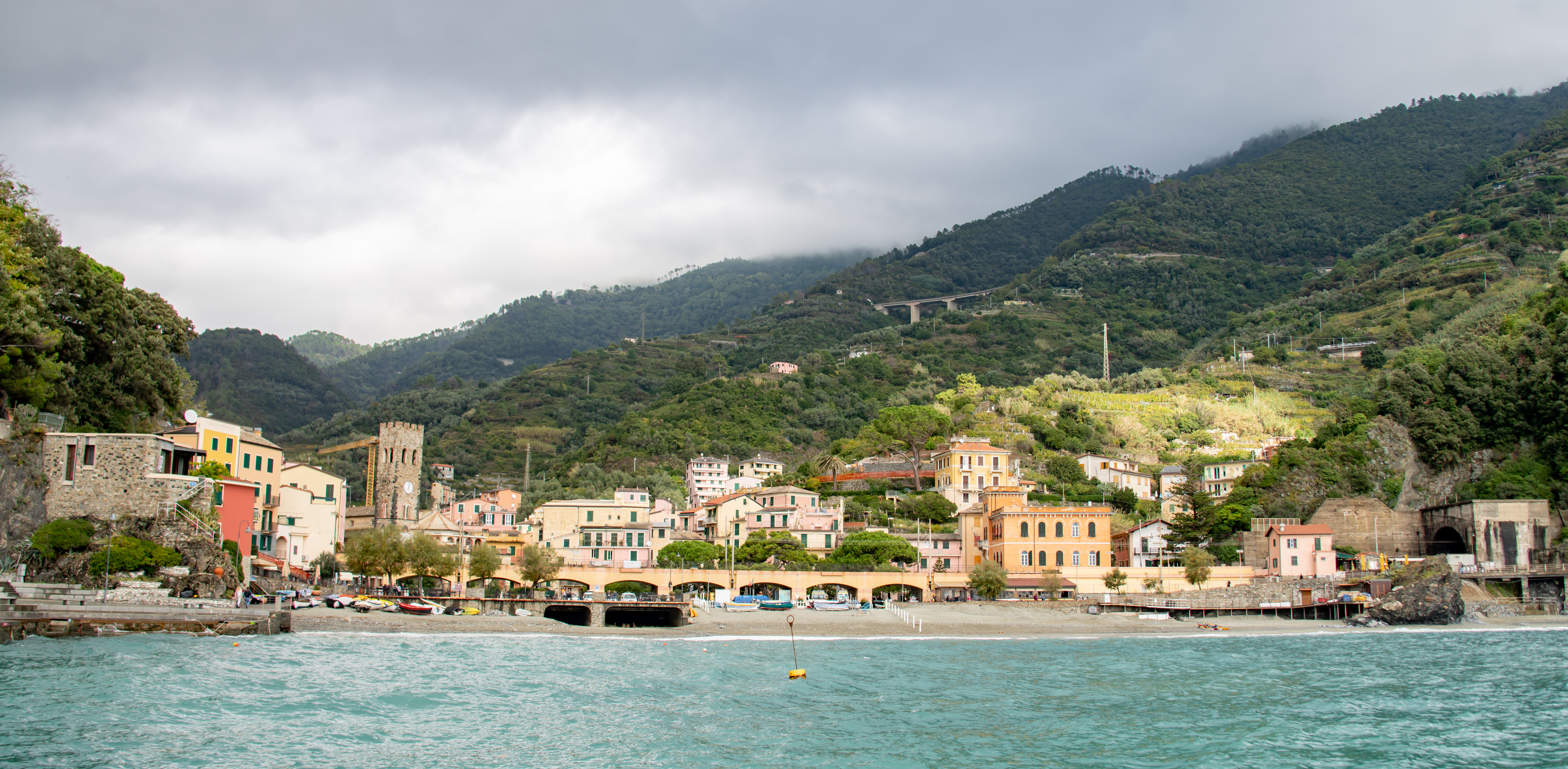 We started out at Monterosso al Mare, which has an old town and new town which are separated by a small reef/rock formation. You can go between the two through a tunnel or take a more scenic route by climbing over the rock formation (there’s a path and a restaurant at the top, so not a real climb). We had free time to walk around here. There is a large beach, although we definitely did not have beach weather. It was raining, sometimes heavily. It still was nice walking around the town and I managed to get good pictures. We went into the local church, St John the Baptist Church, which was built between 1244-1307. It’s an example of Ligurian Gothic architecture (not sure what that is, but that’s apparently what it’s called) and has black and white marble stripes on the outside. I think it looks like Beetlejuice, but it certainly is striking. The tower is a completely different style, which makes some sense since it was erected in the 15th century. We managed to avoid the heaviest rain during lunch (pure luck).