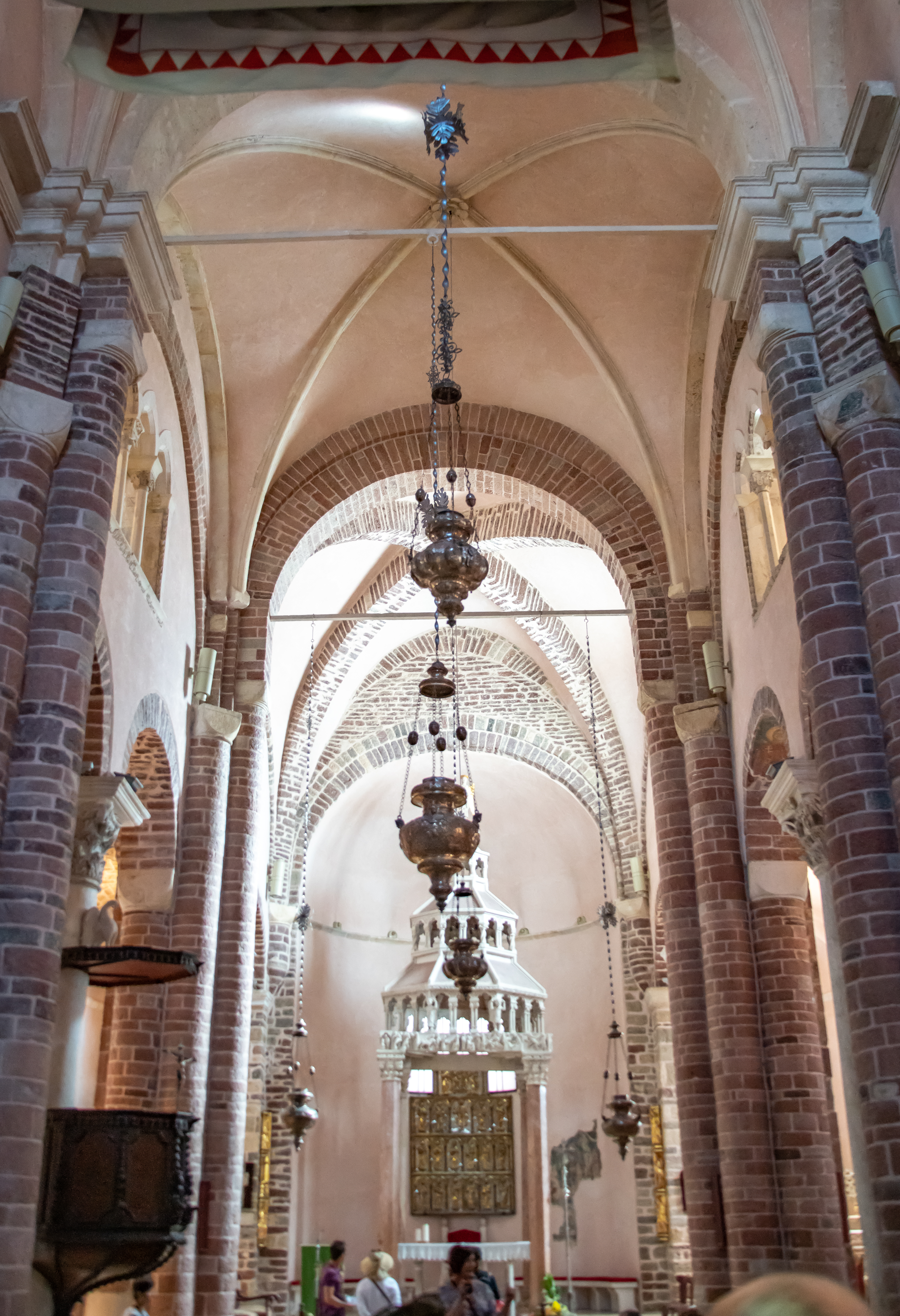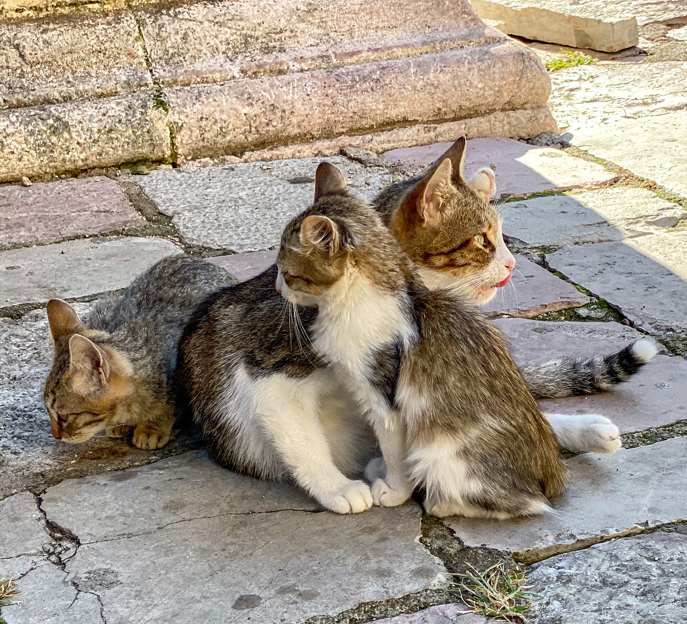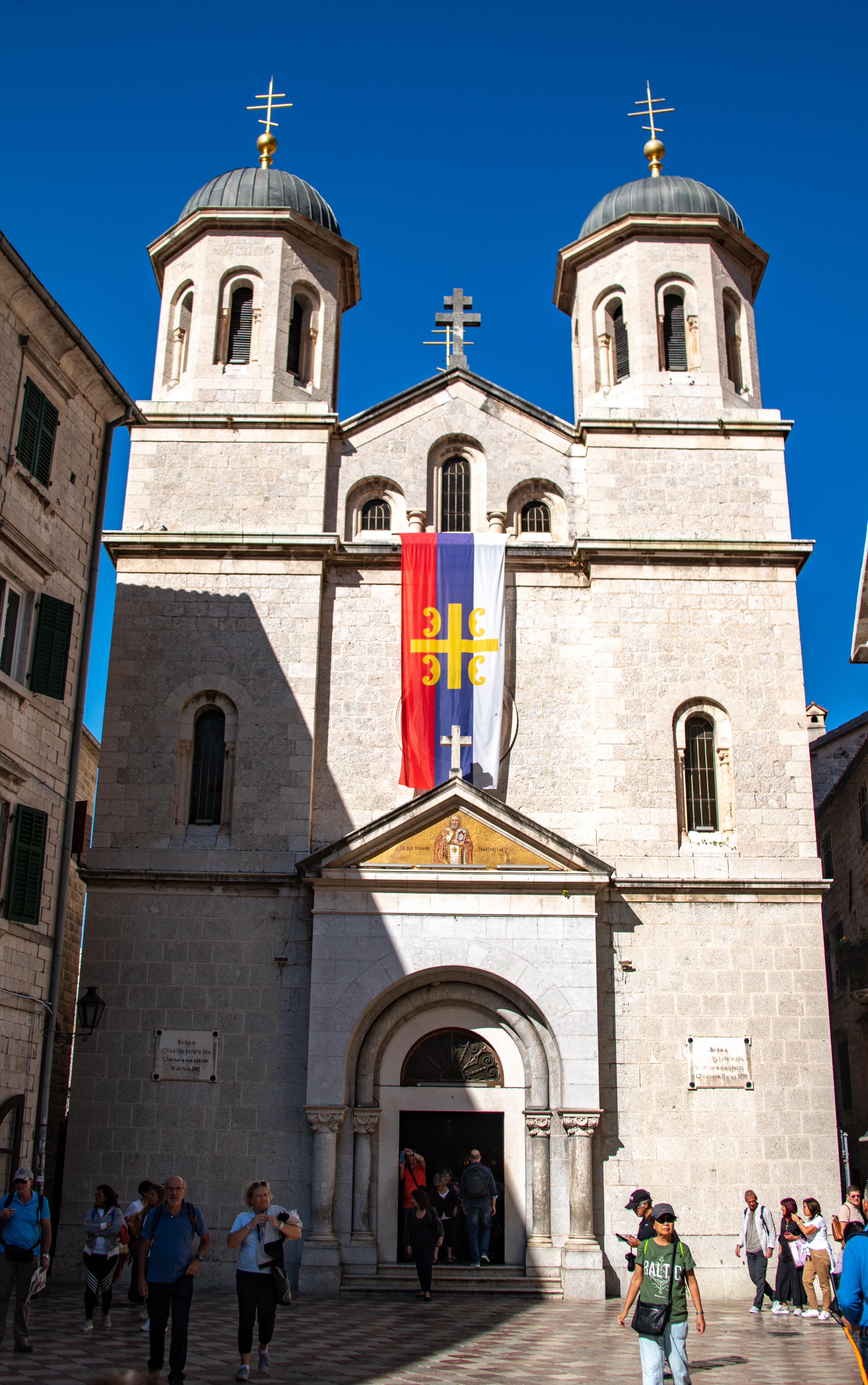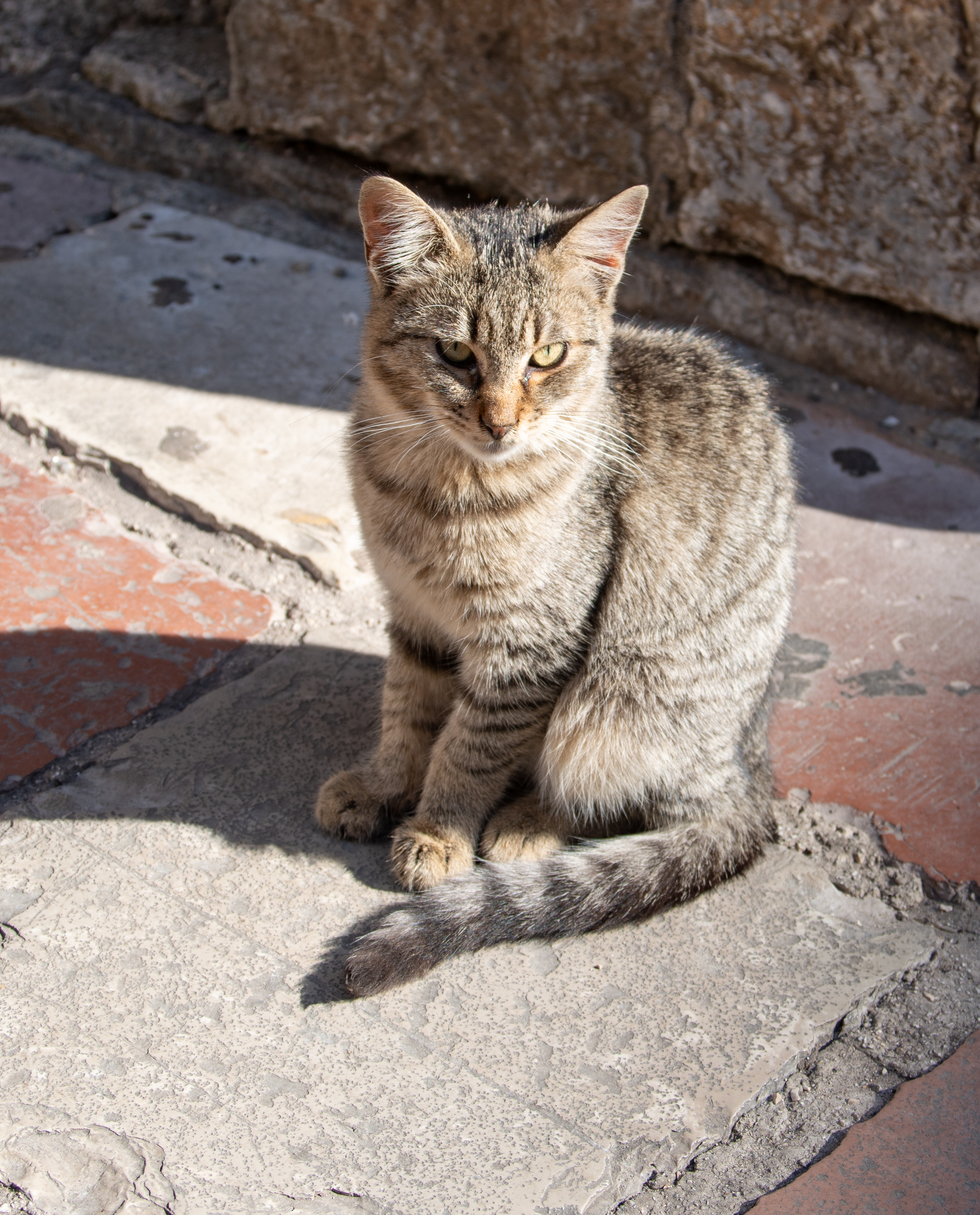 We then went back to Kotor, a port on the Bay of Kotor that has been settled since Roman times. The town is known for its fortifications. It has had some degree of fortification since the Emperor Justinian built a fortress in 535. This town went through a similar series of ruling peoples like Budva (as they are very close together). When they were under Venetian rule, a significant fortification was built around the city, much of it still standing today including 3 miles of the city wall. Kotor is considered to have one of the best-preserved medieval old towns in the Adriatic. We visited the Cathedral of Saint Tryphon, which was consecrated in 1166, although it was damaged in earthquakes in 1667 and 1979. One important thing to know about Kotor is that it is known for cats. We definitely took advantage of that!