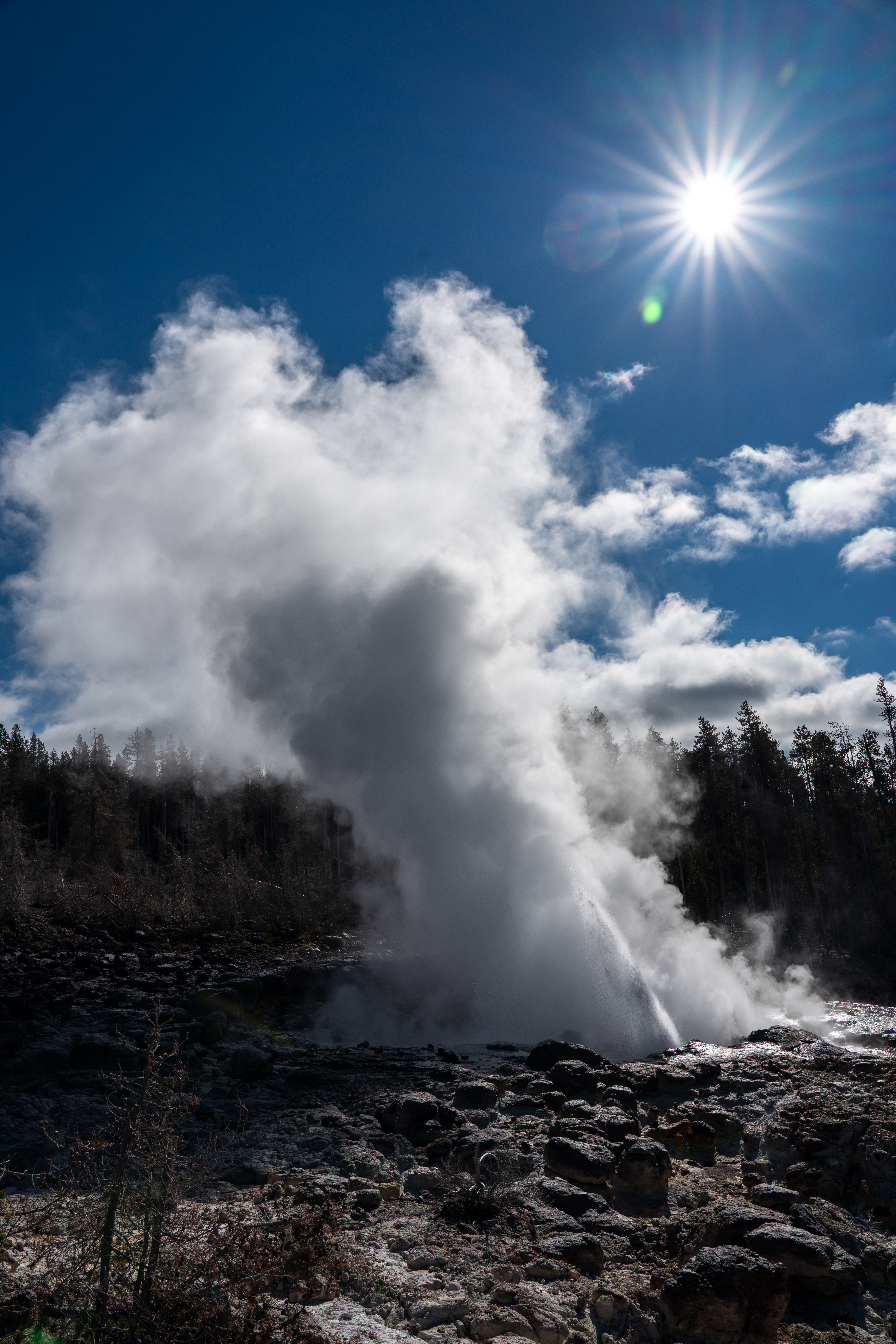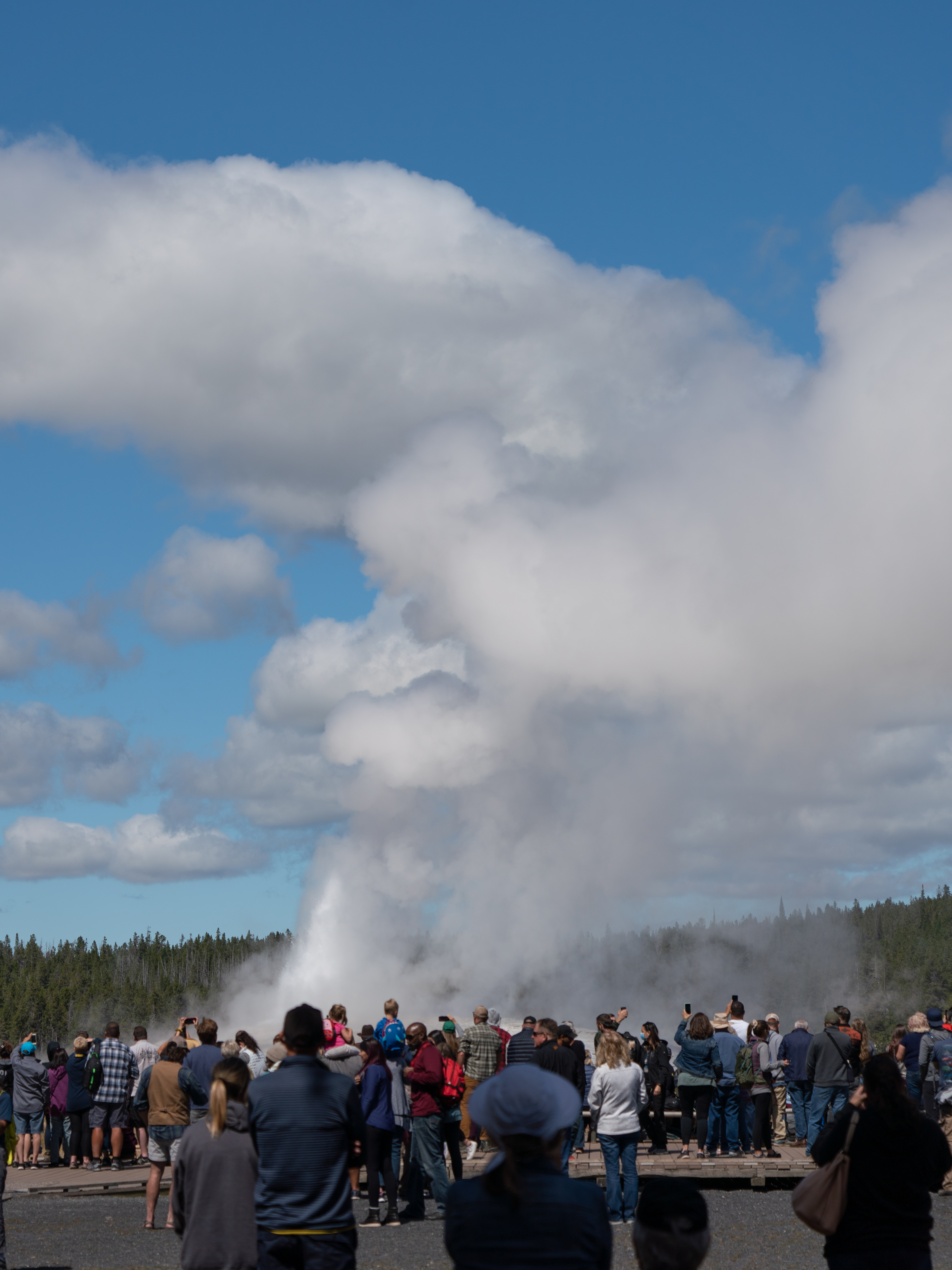 We decided to walk back to Daisy Geyser and try to catch it. The predicted times are all +/- various timeframes. Daisy was +/- 30 minutes. We waited out the +30…all of it, but we were there. While we waited, we could see, in the distance, Old Faithful, Grand, and, we think, Beehive. Grand was amazing and Beehive was impressive, too.