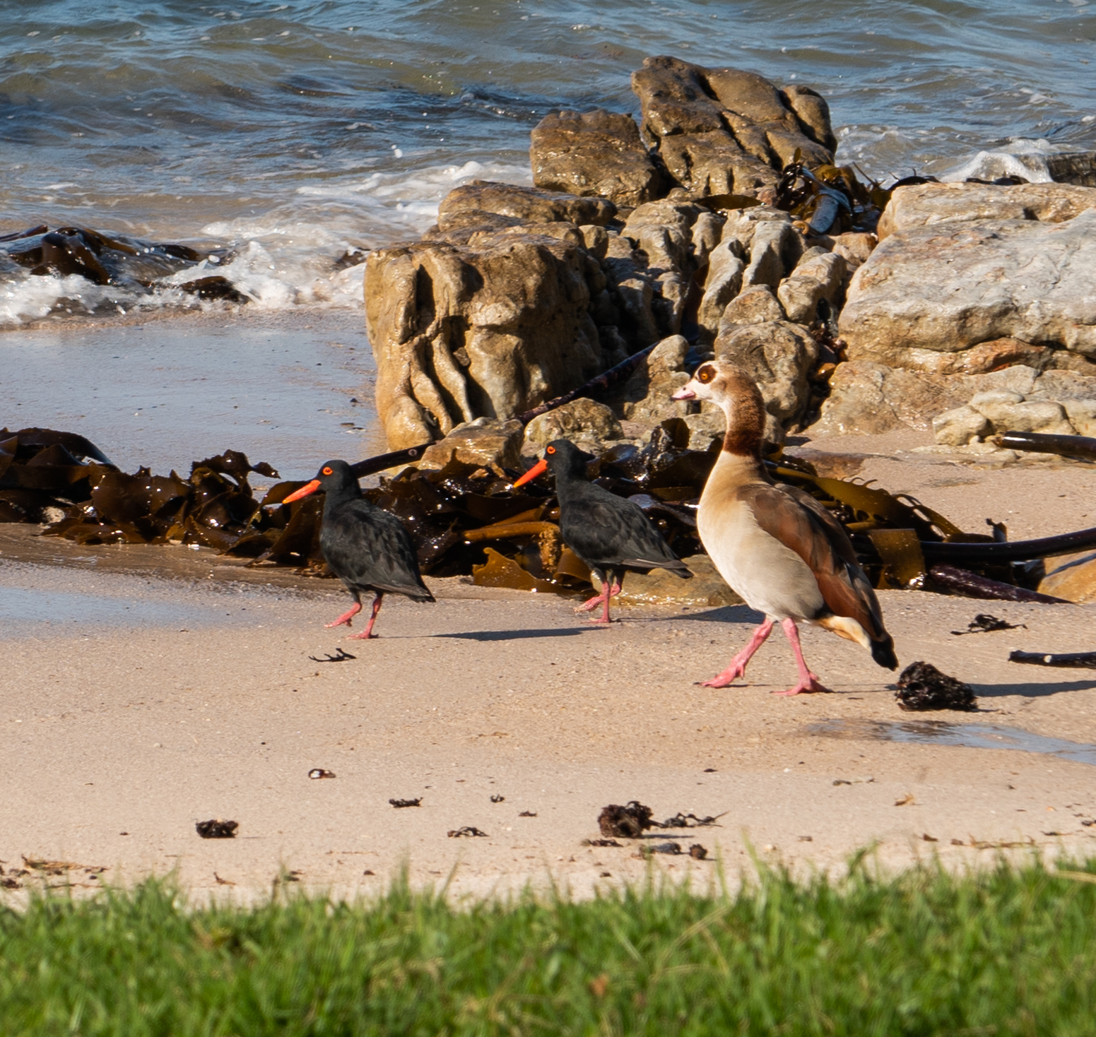 Red billed oystercatchers and an Egyptian goose