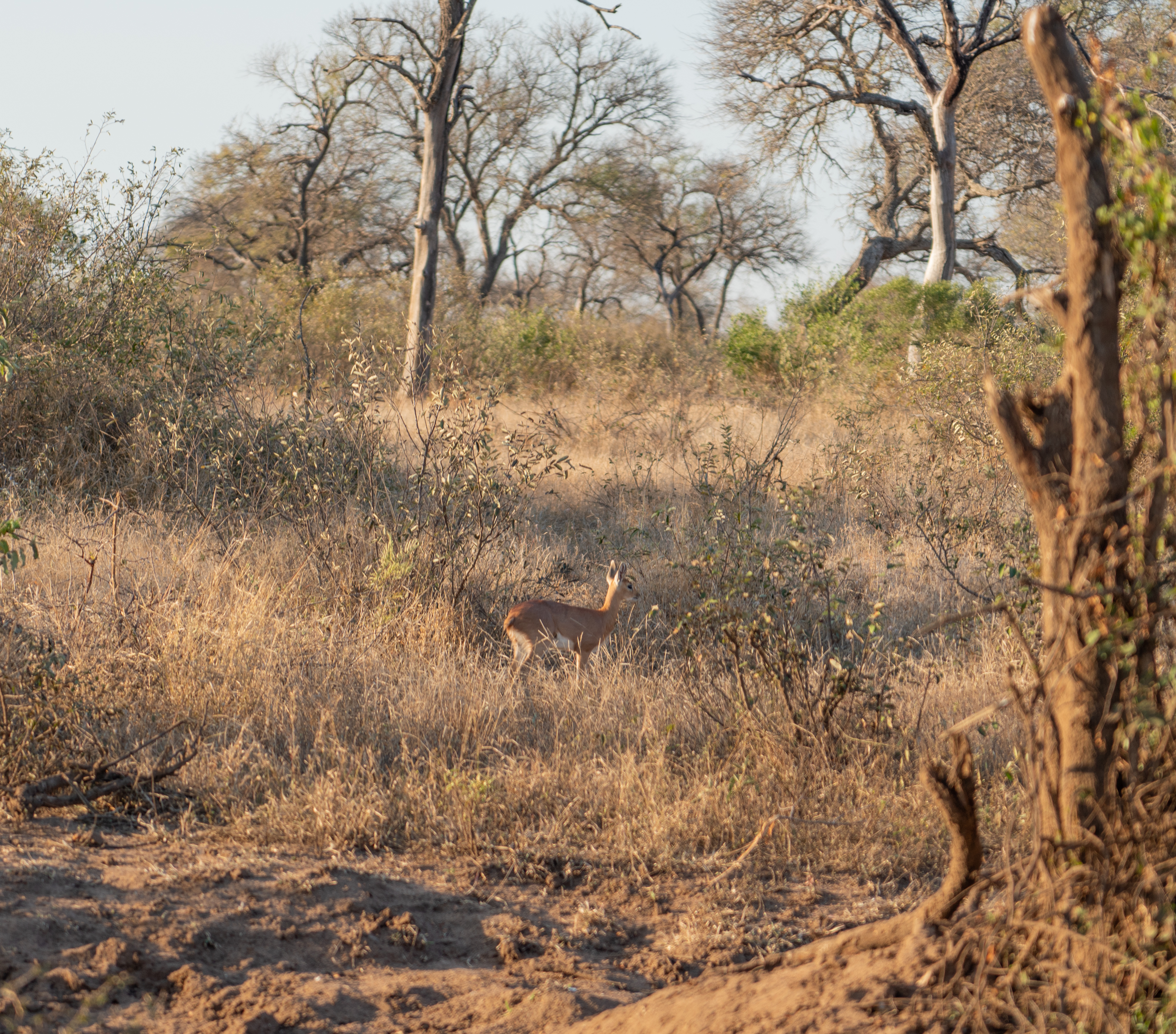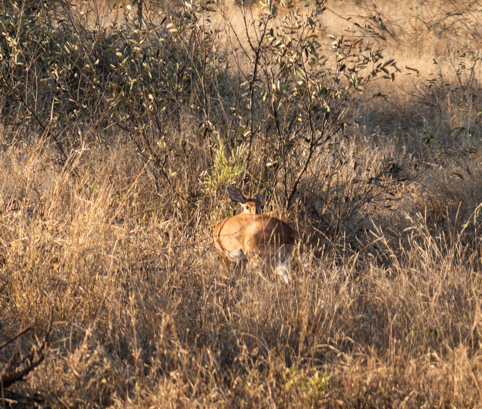 A steenbok attempted to hide from us in the grasses. These are 16-24 inch tall deer-like animals. If hiding in the grasses does not work, they run in a zig-zag pattern to avoid predators.