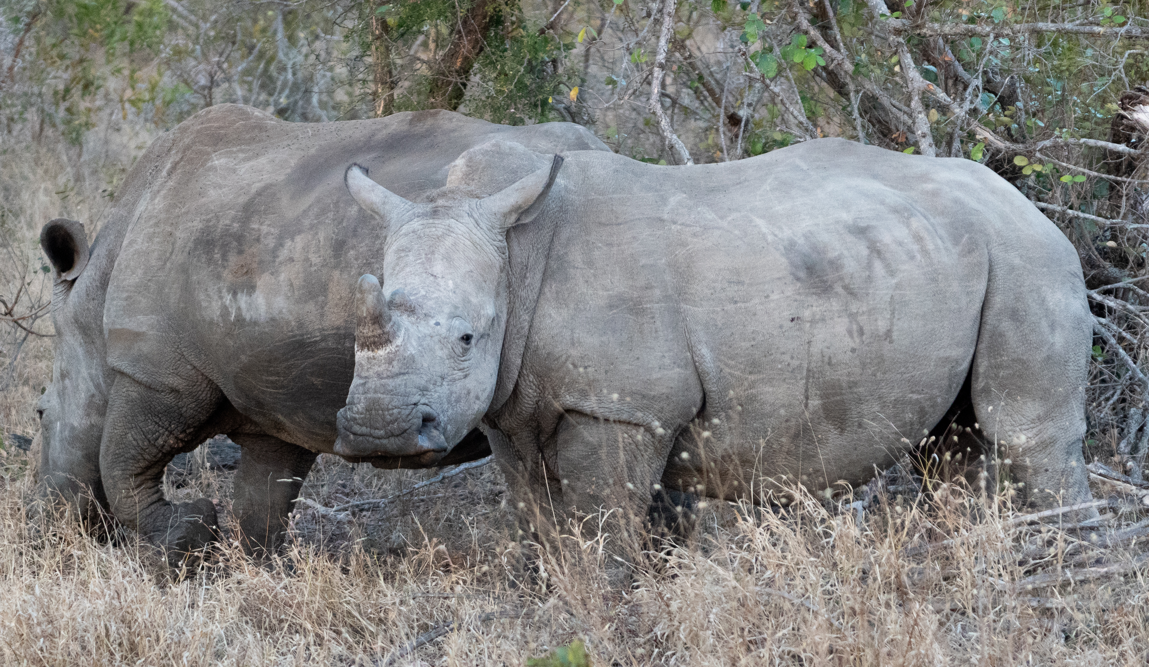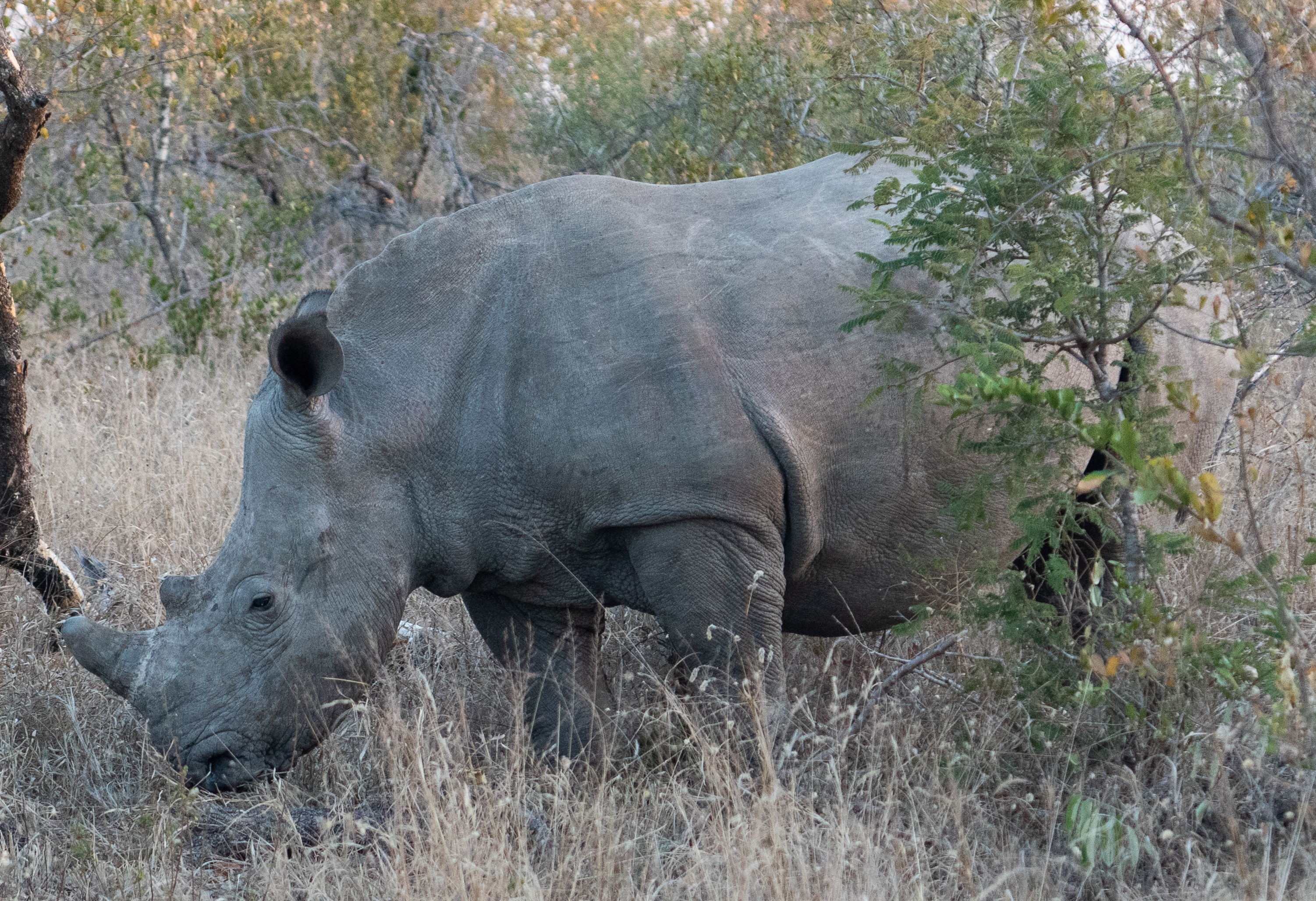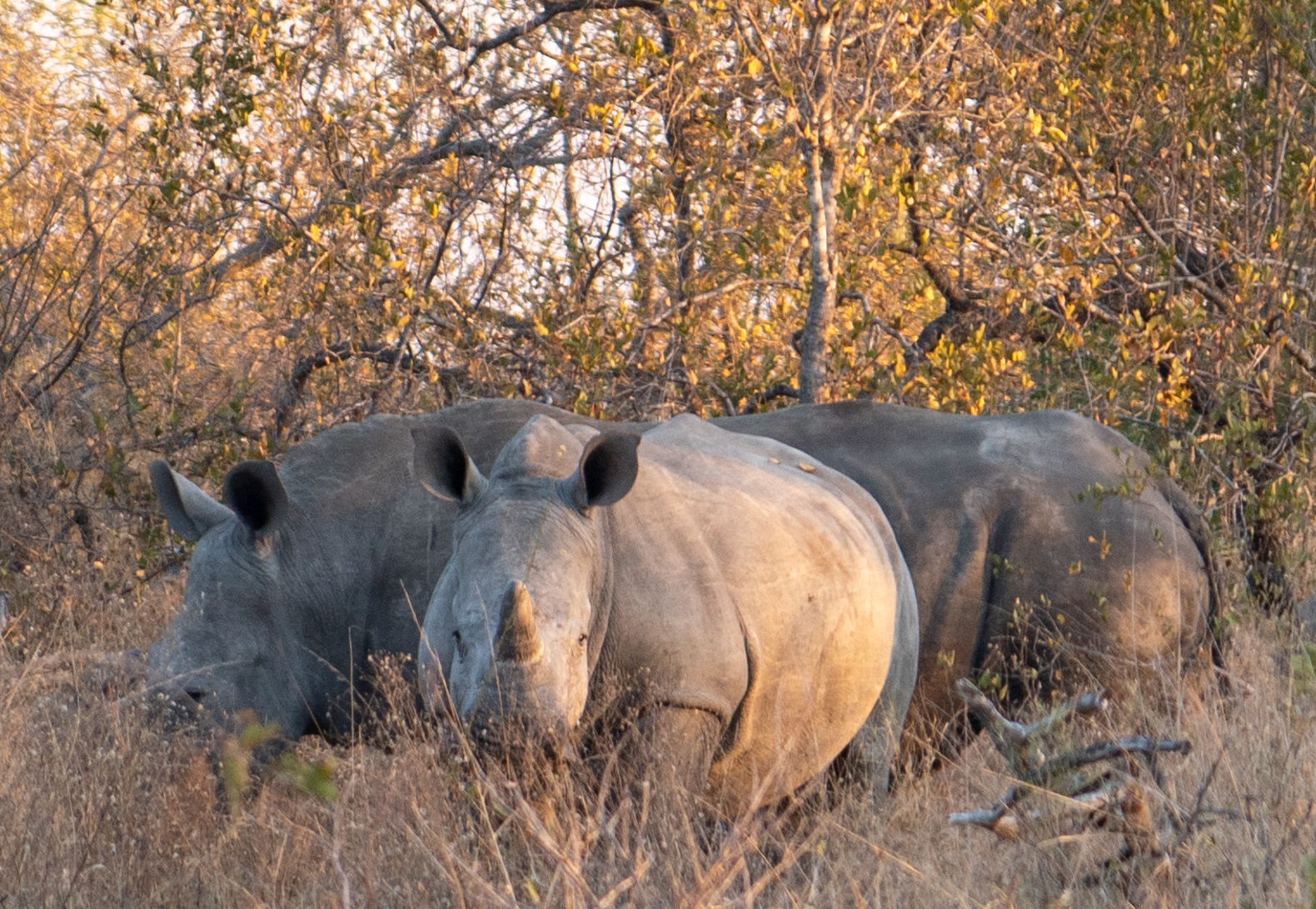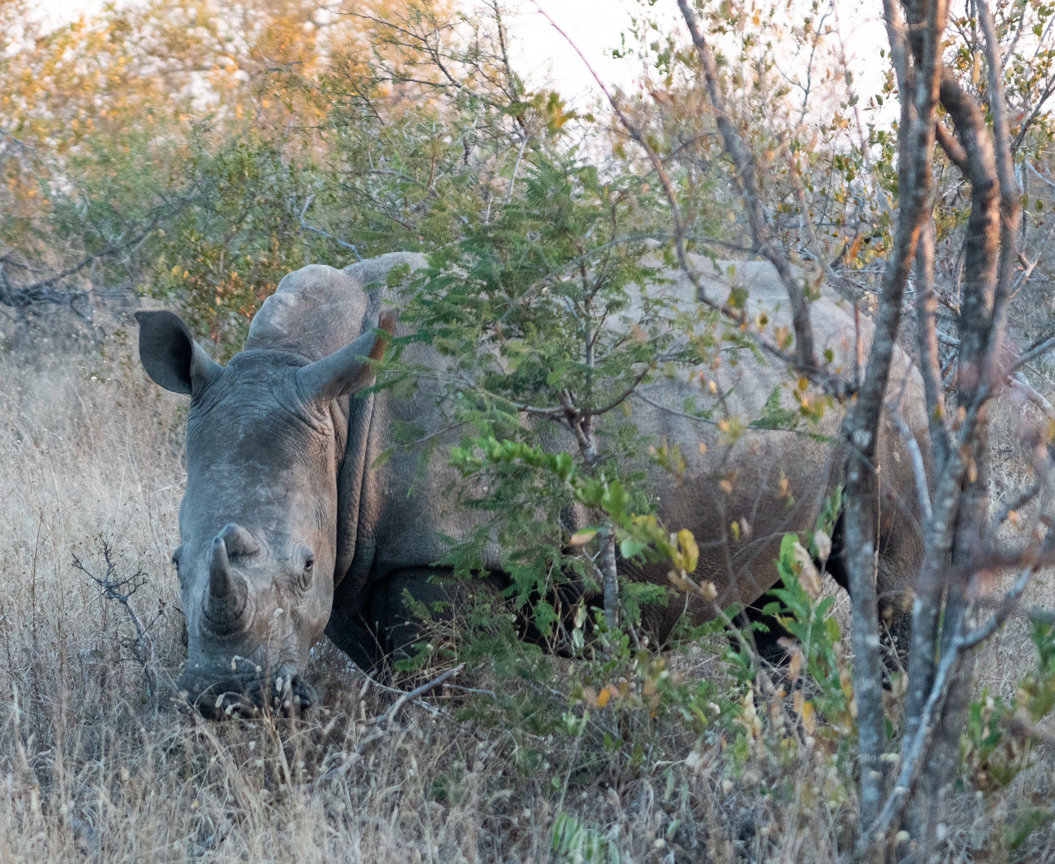 Our huge find of the day was a group of southern white rhinoceros. Groups of rhinos are called crashes. White rhinos were endangered, but have largely recovered. They are continually threatened by poachers. The rhinos at this reserve are de-horned to discourage poachers, since that is usually what they are killed for. A couple in this group we saw had not been de-horned yet.
