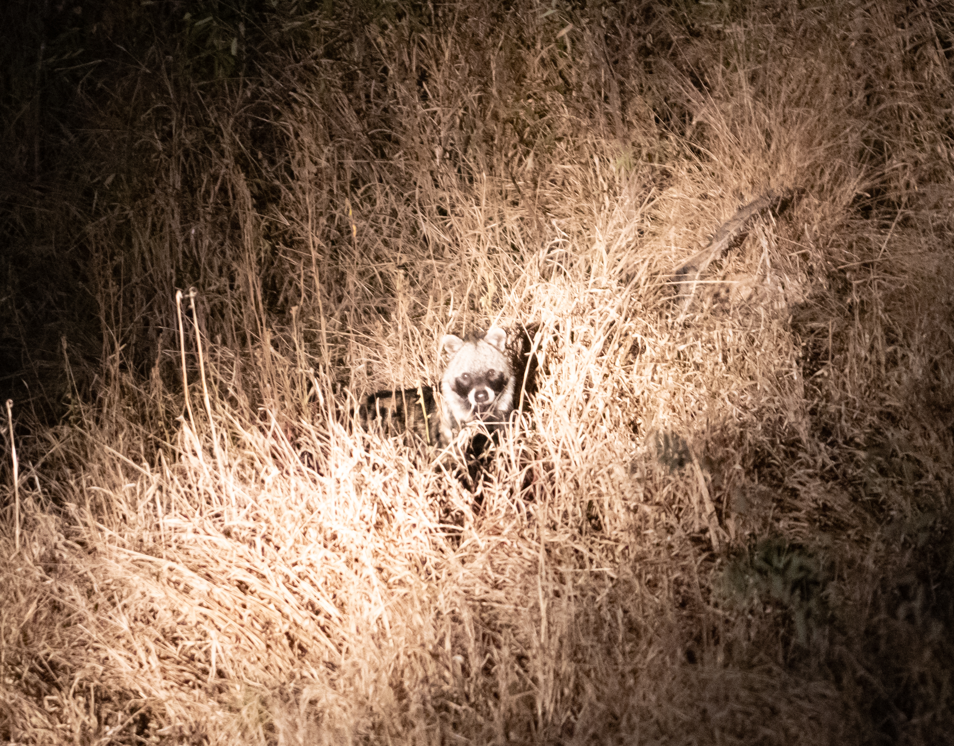 In the dark we found an African civet. This is a small mammal with a masked face, like a raccoon. It is nocturnal and carnivorous.