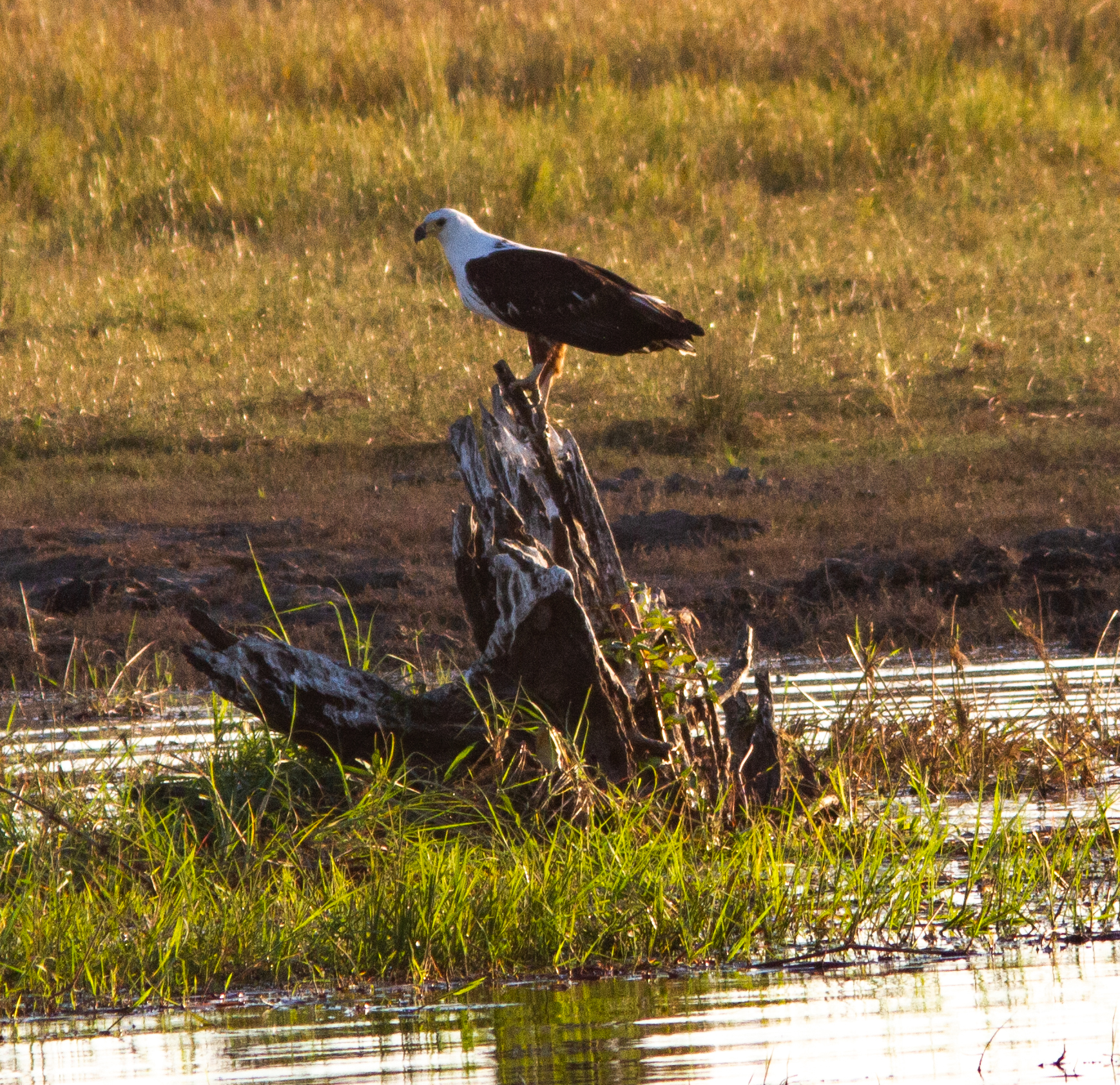 African Fish-Eagle: These are large eagles with white heads, chests and tails and dark brown bodies. They are pretty common around water.