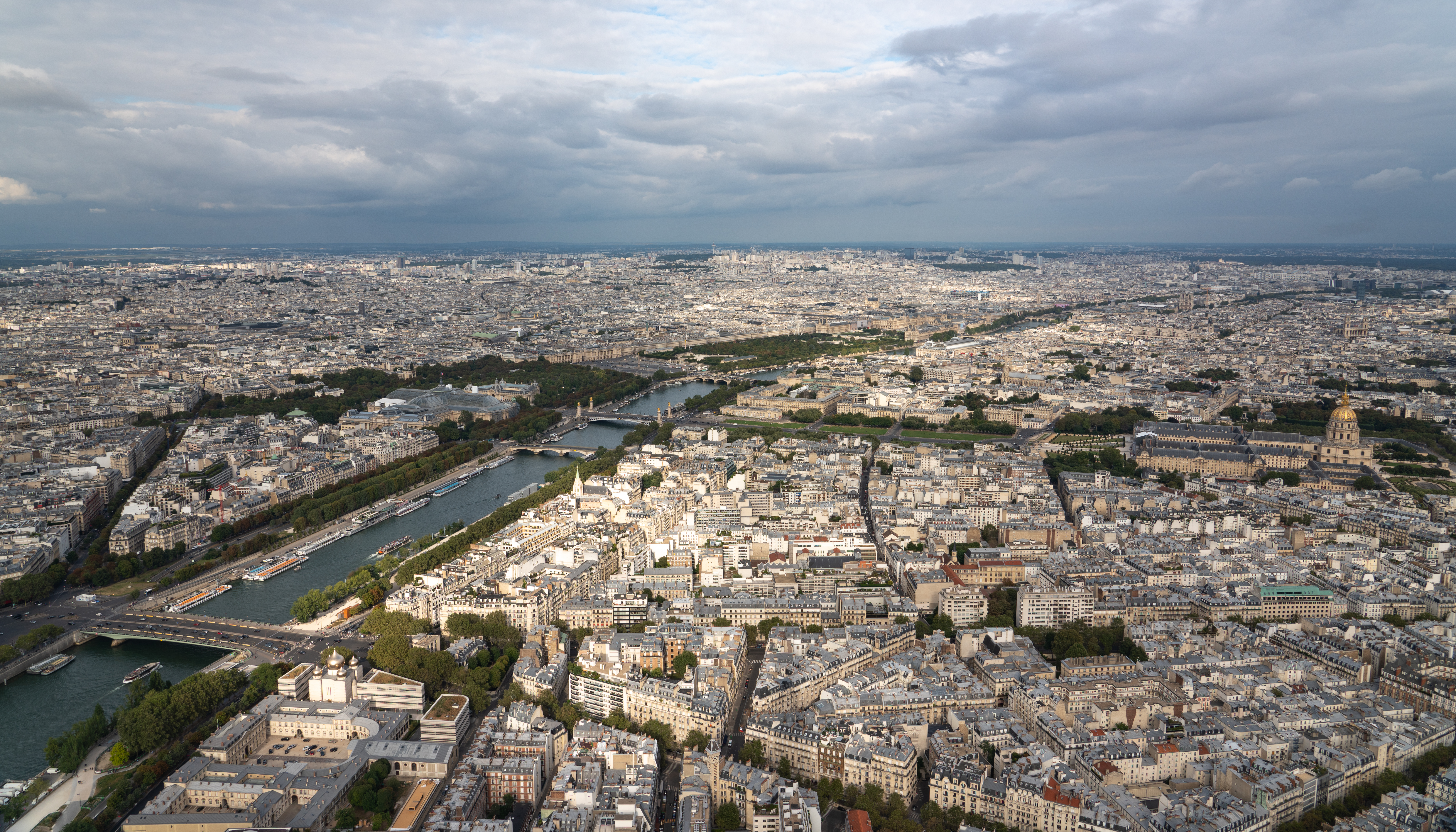 View from the top. The green in the middle above the Seine is the Tuileries Gardens and at the upper right end of that is the Louvre.