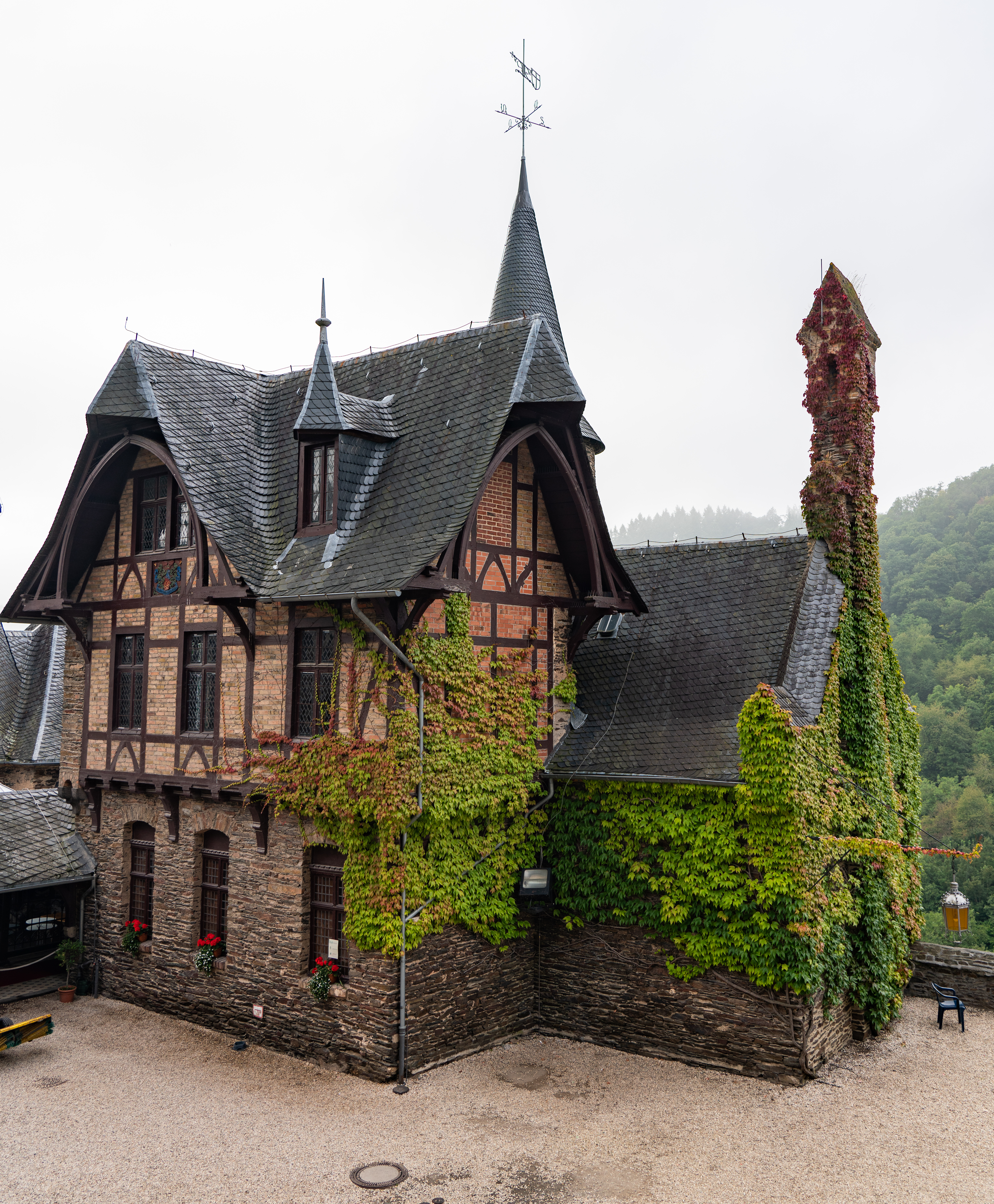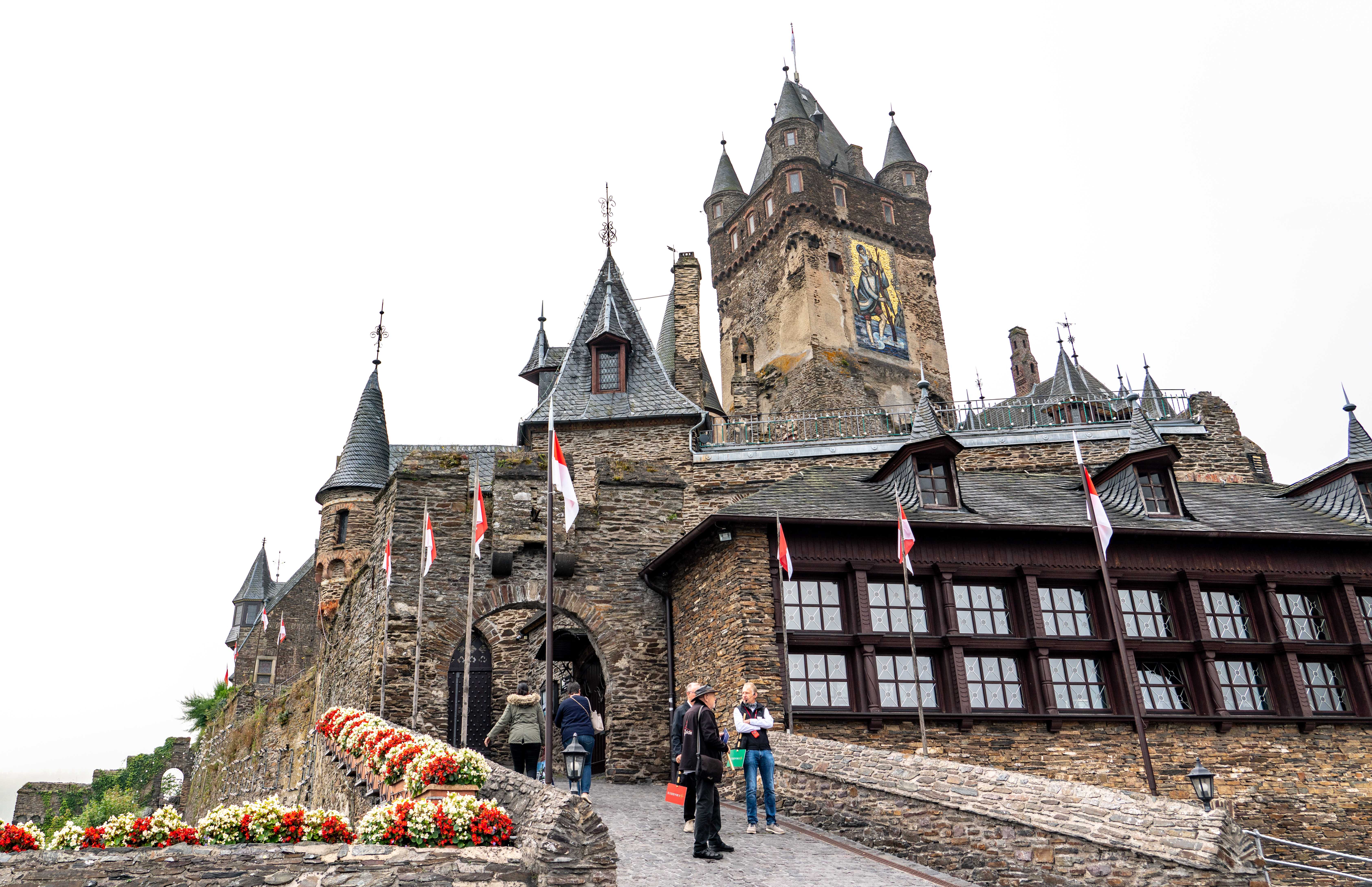 This morning we went to Reichsburg Castle. This castle was built around 1100 in the town of Cochem on the Moselle River. It became an imperial castle in 1151. Like many castles, it has been damaged and rebuilt over the centuries. The current building is primarily from the late 19th century, although some of the original medieval structure does remain.