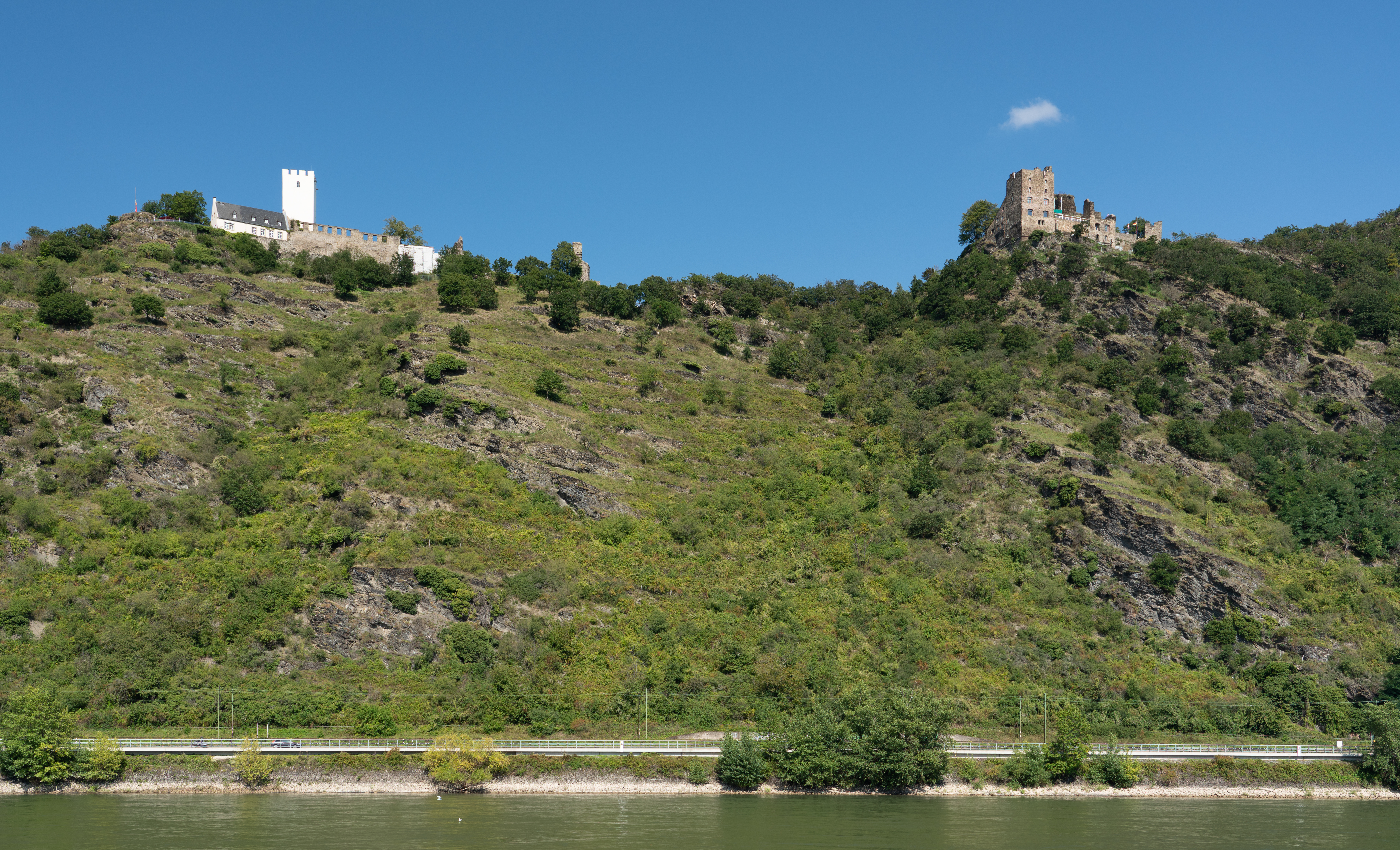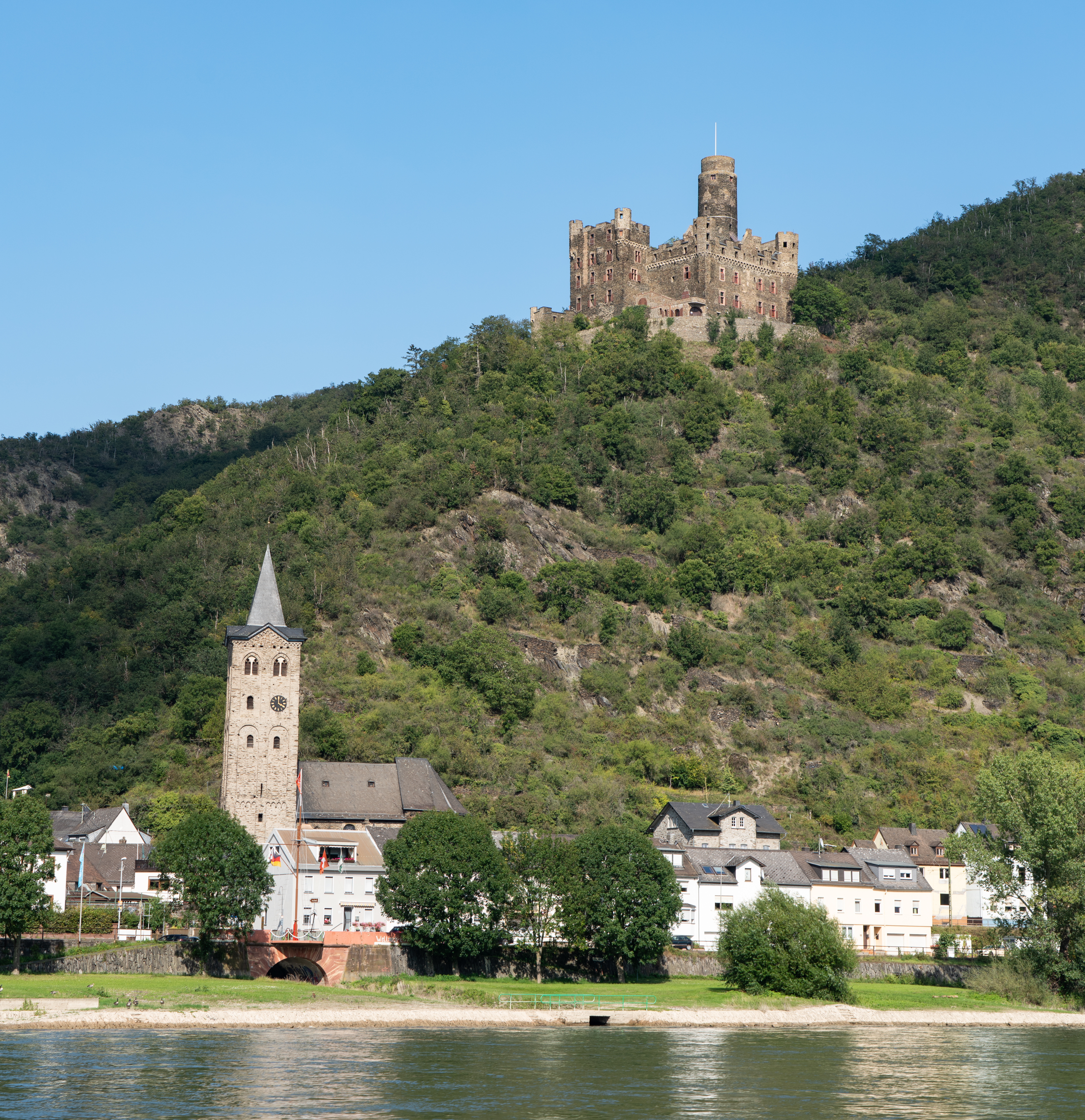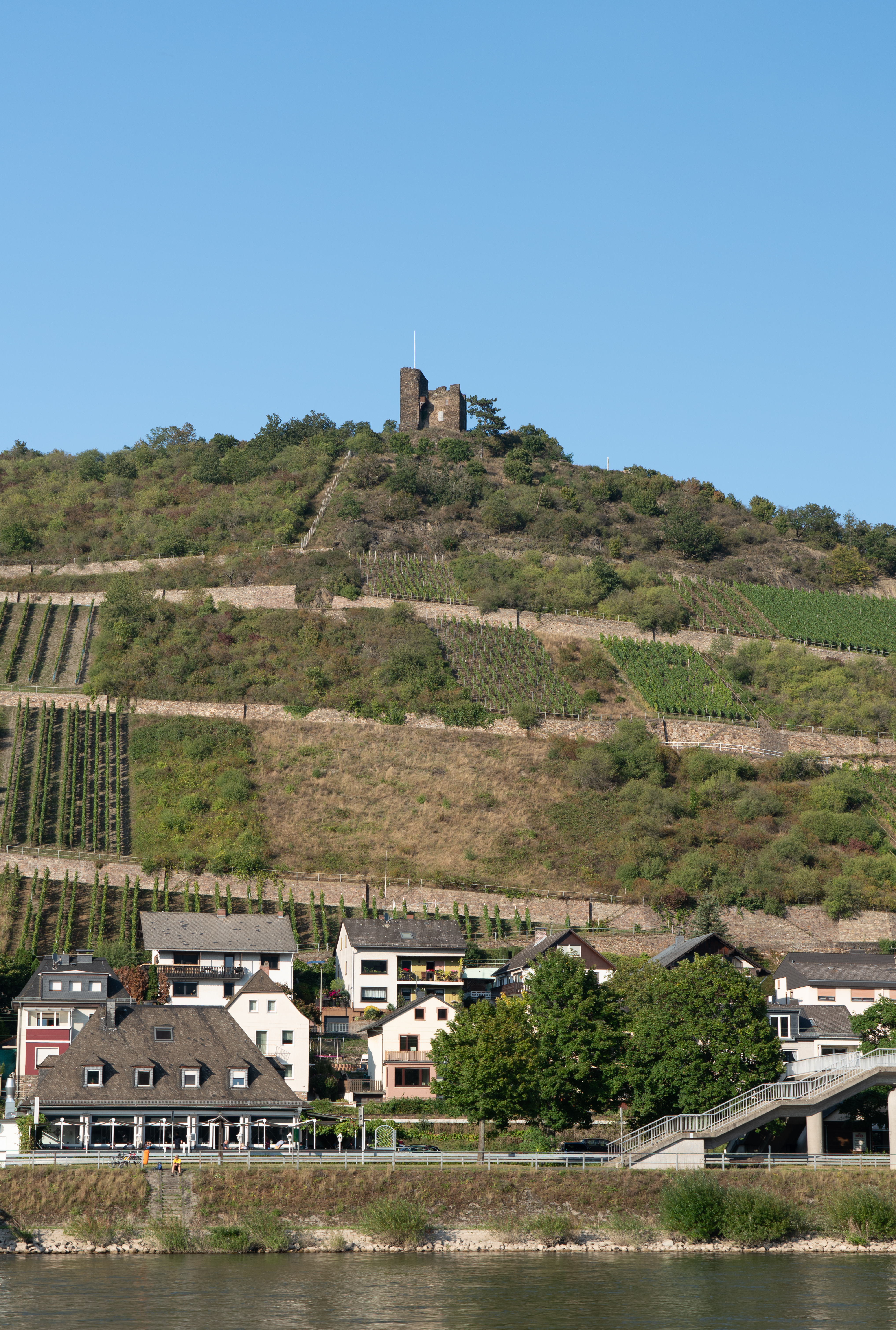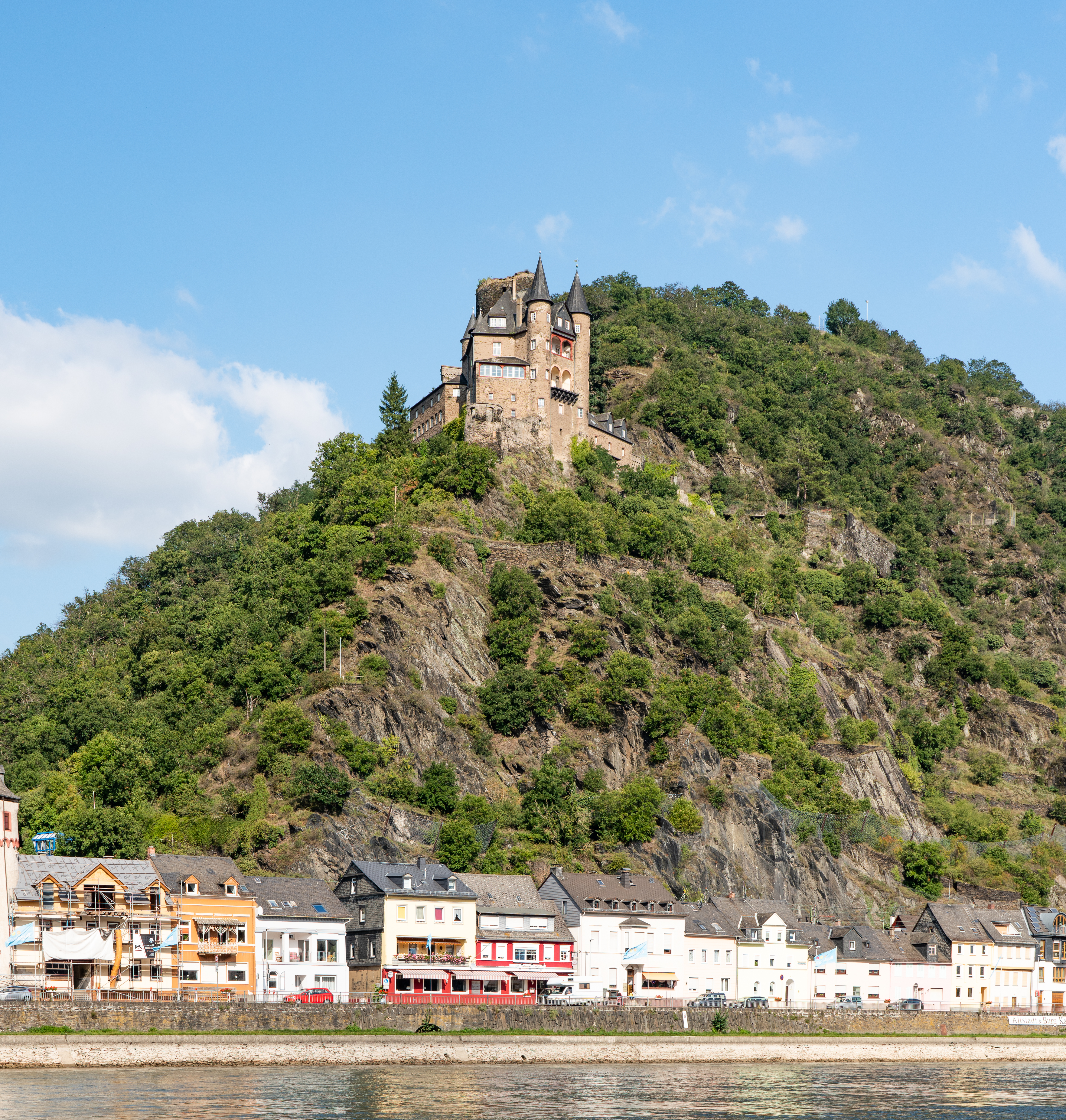 Katz Castle (cat castle) is above the town of St Goarshausen and it was first built around 1371. It was damaged by Napoleon and rebuilt in the late 19th century. It is privately owned. The Counts of Katzenelnbogen, who first built this castle, were reportedly the first to plant Riesling grapes.