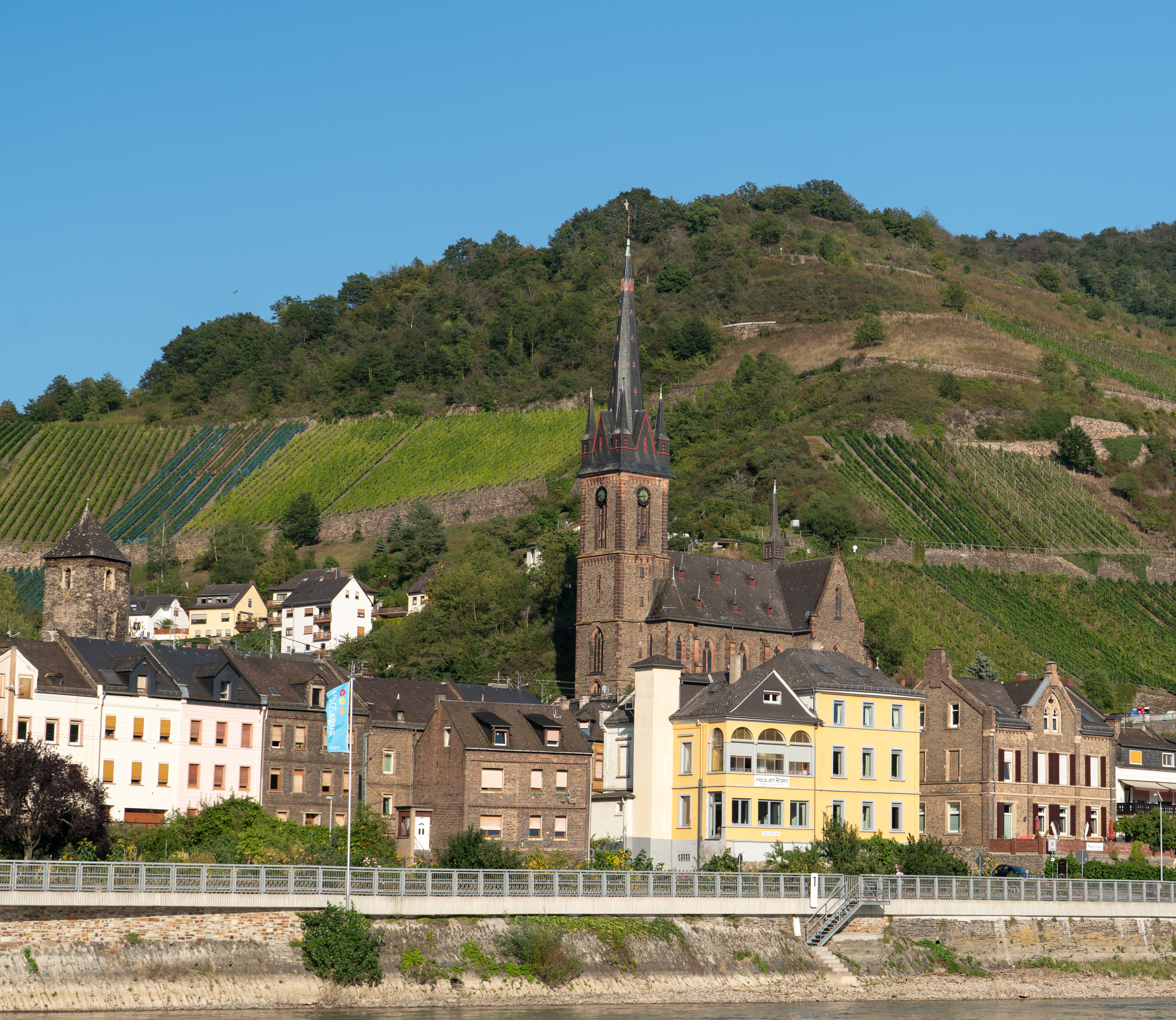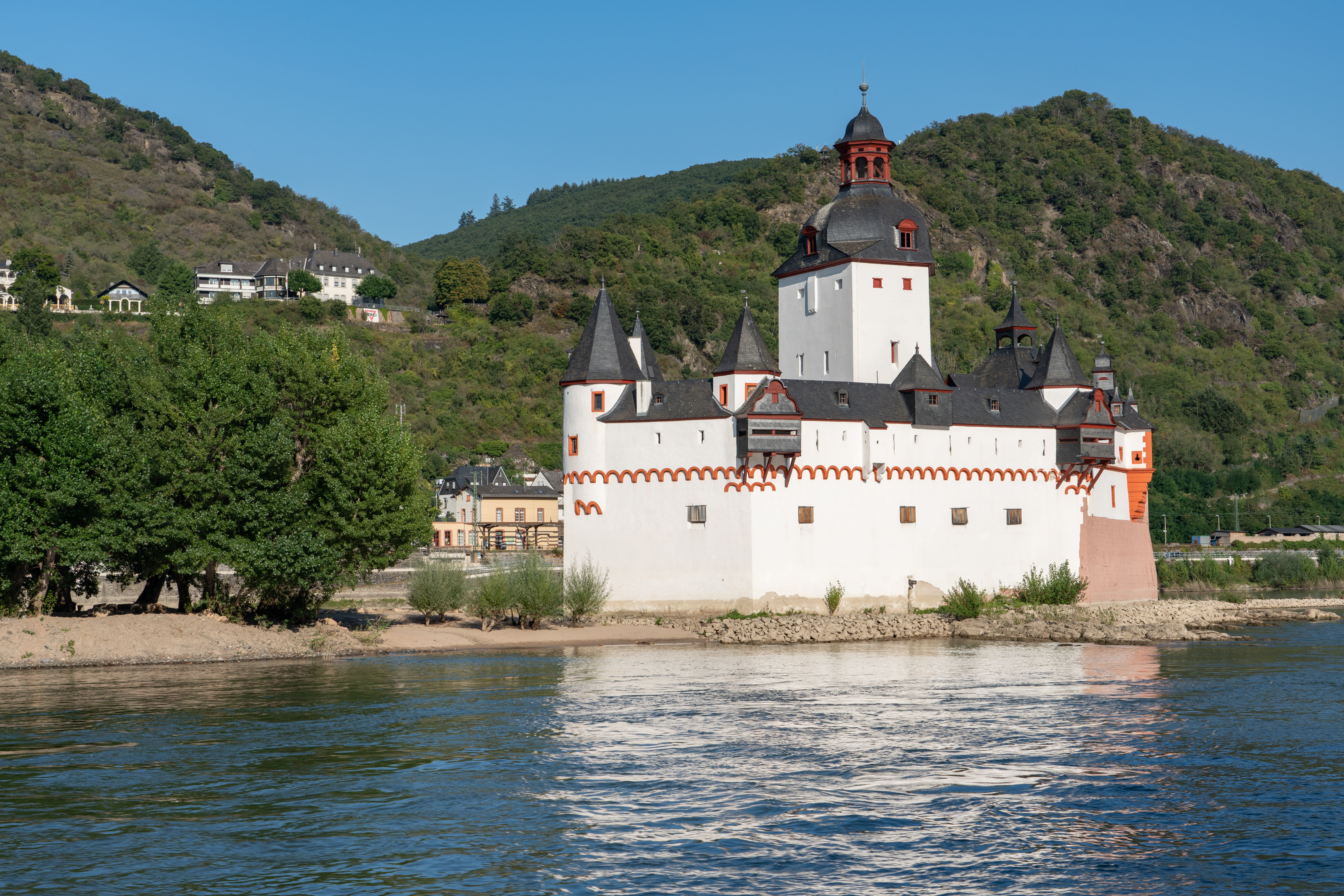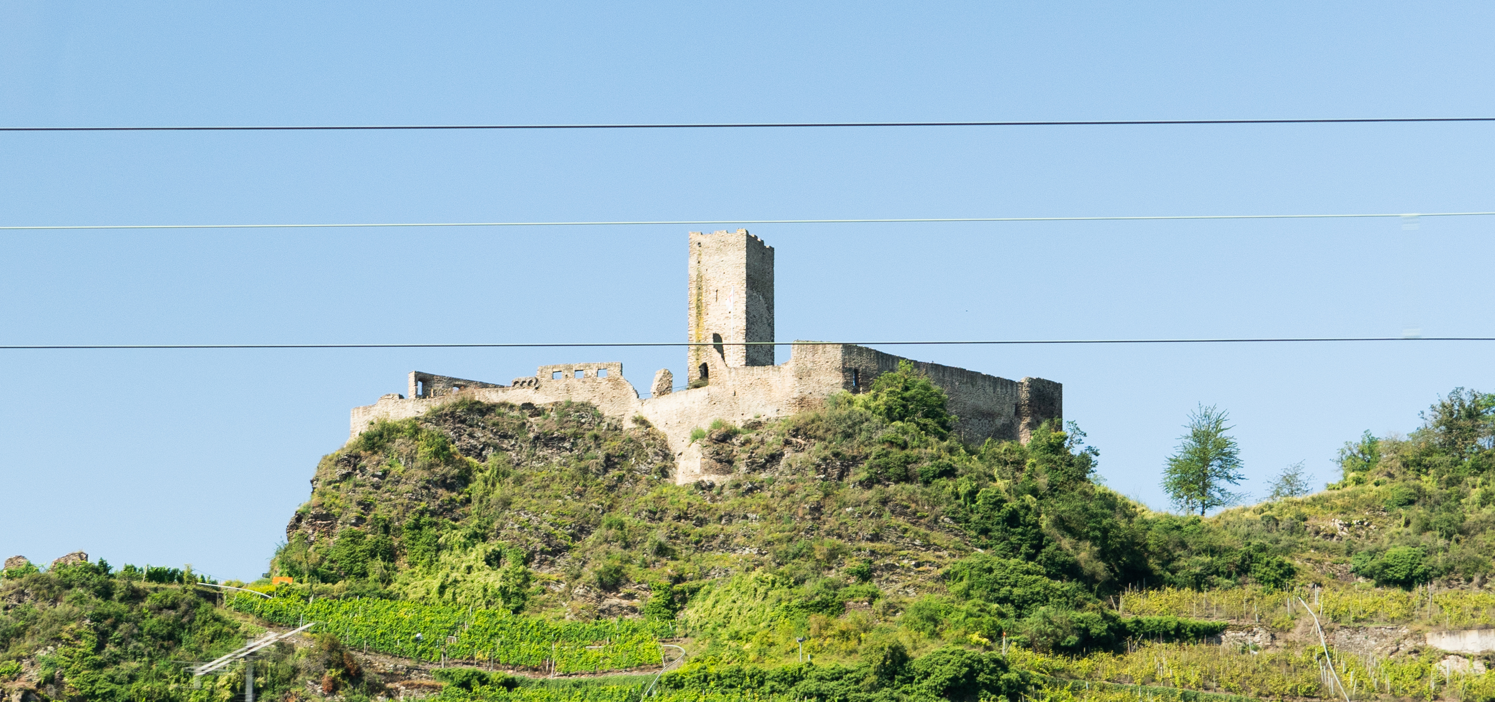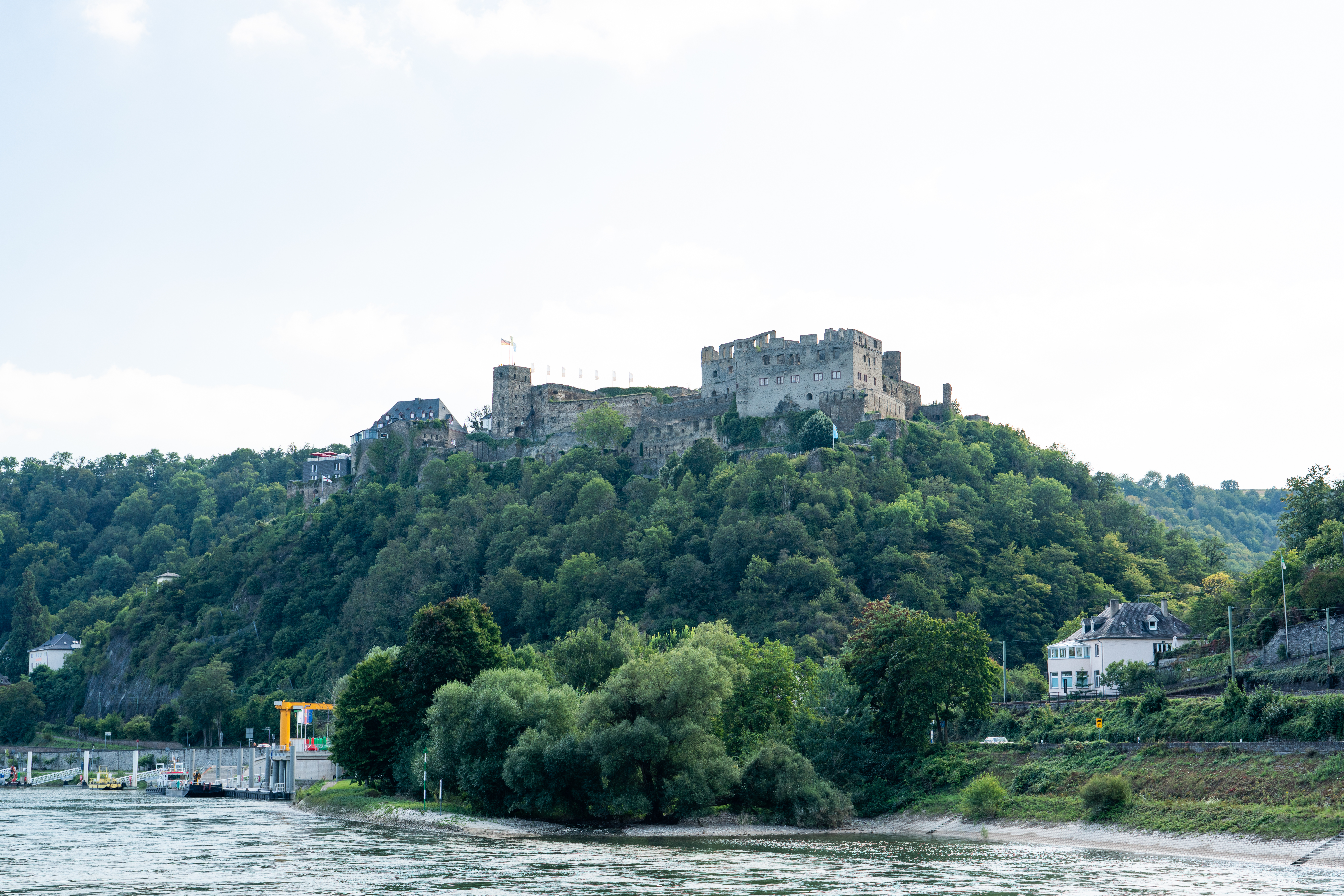 Katz Castle (cat castle) is above the town of St Goarshausen and it was first built around 1371. It was damaged by Napoleon and rebuilt in the late 19th century. It is privately owned. The Counts of Katzenelnbogen, who first built this castle, were reportedly the first to plant Riesling grapes.