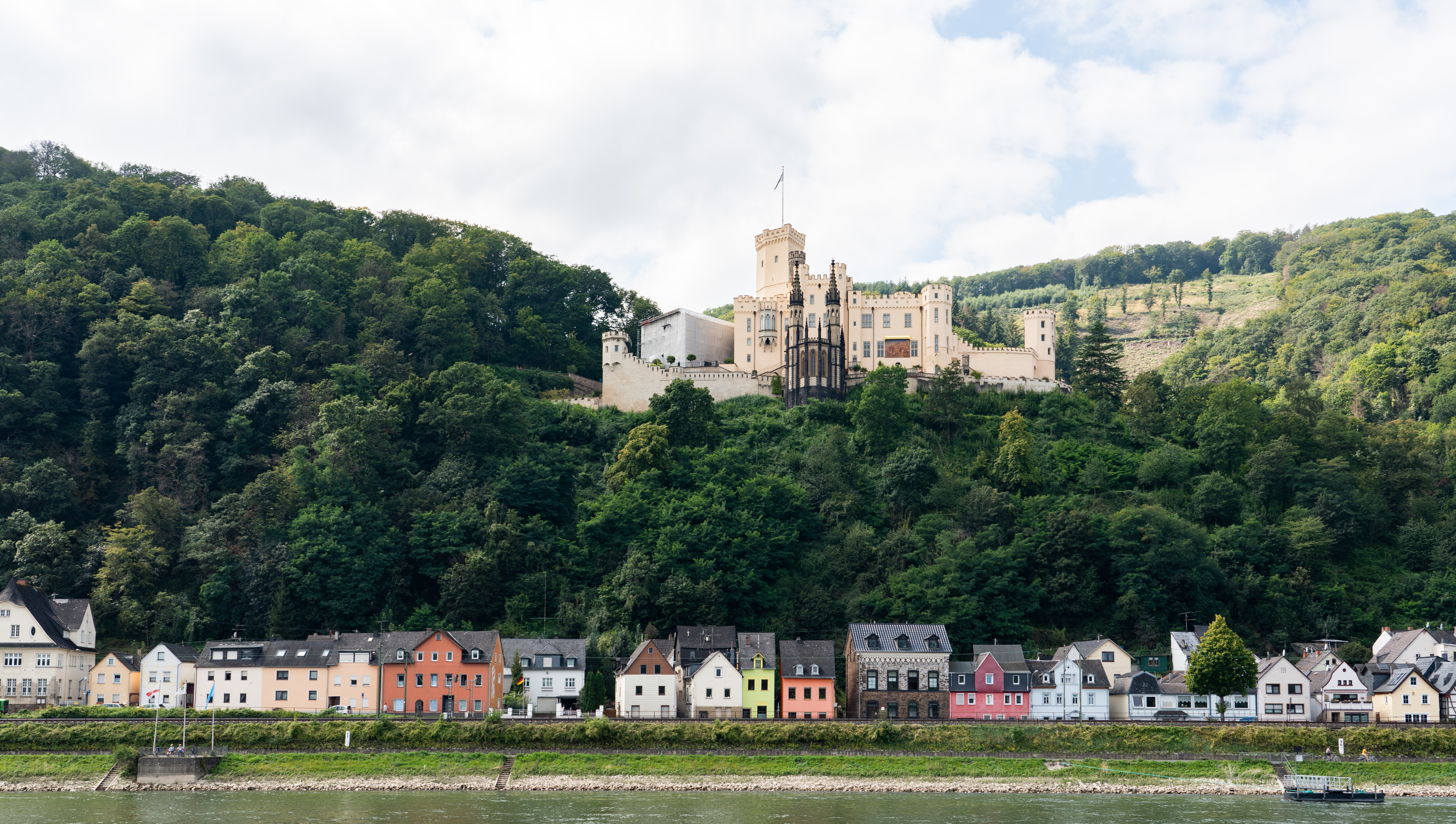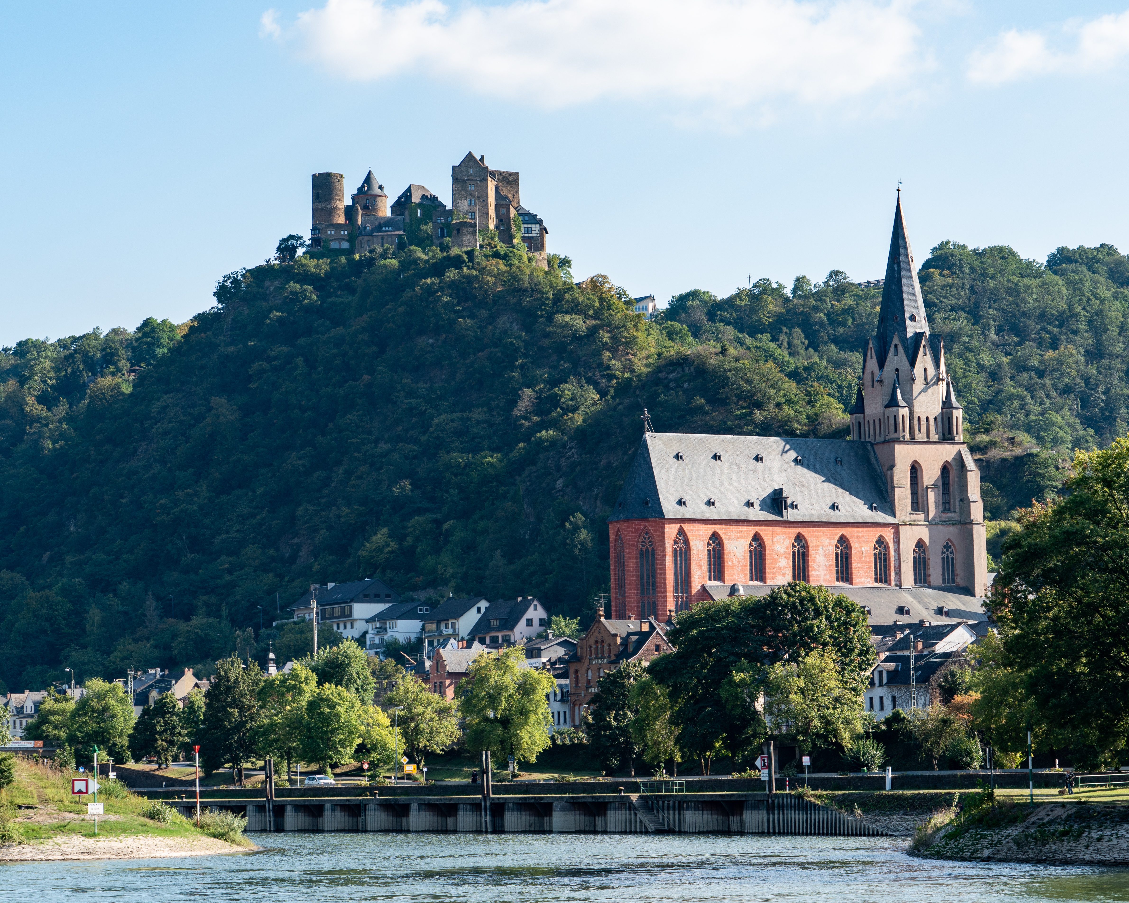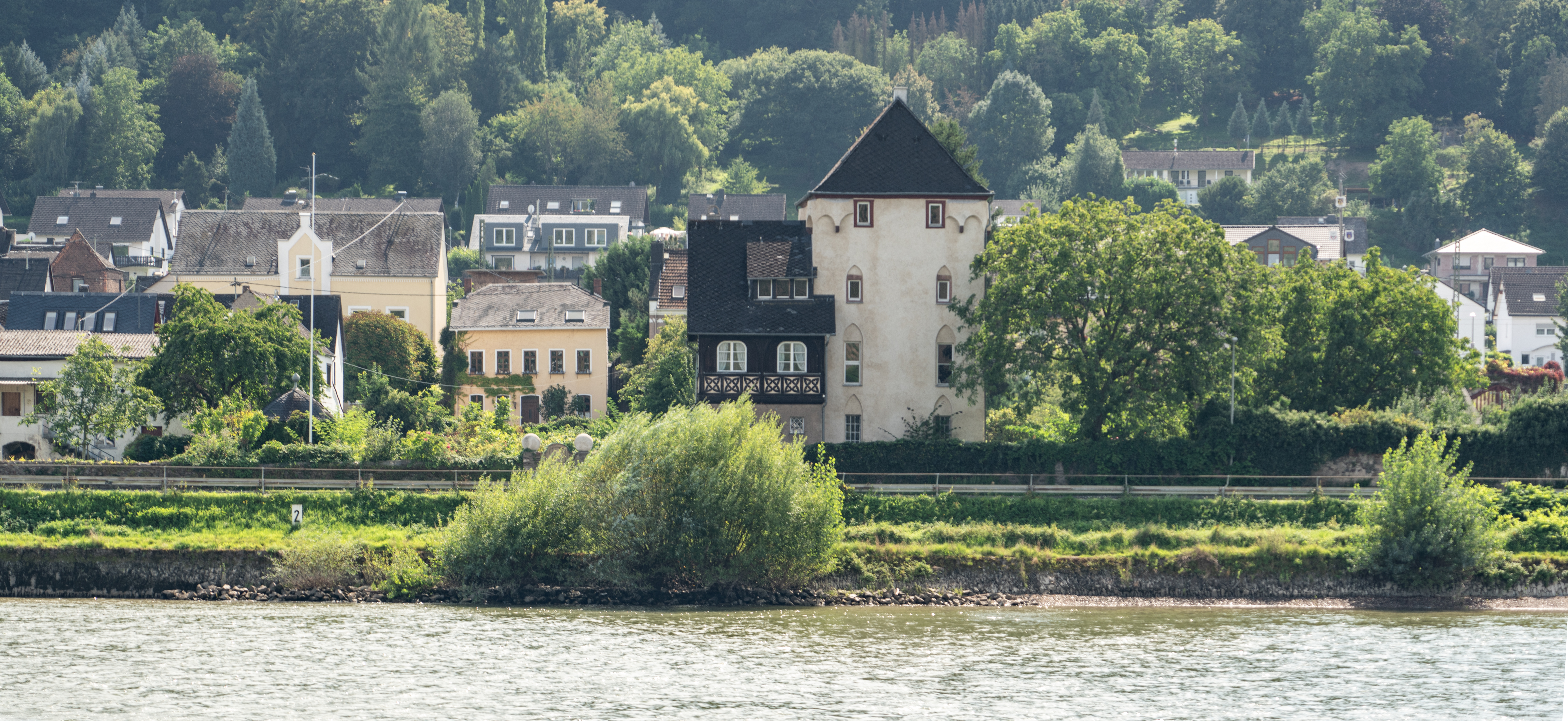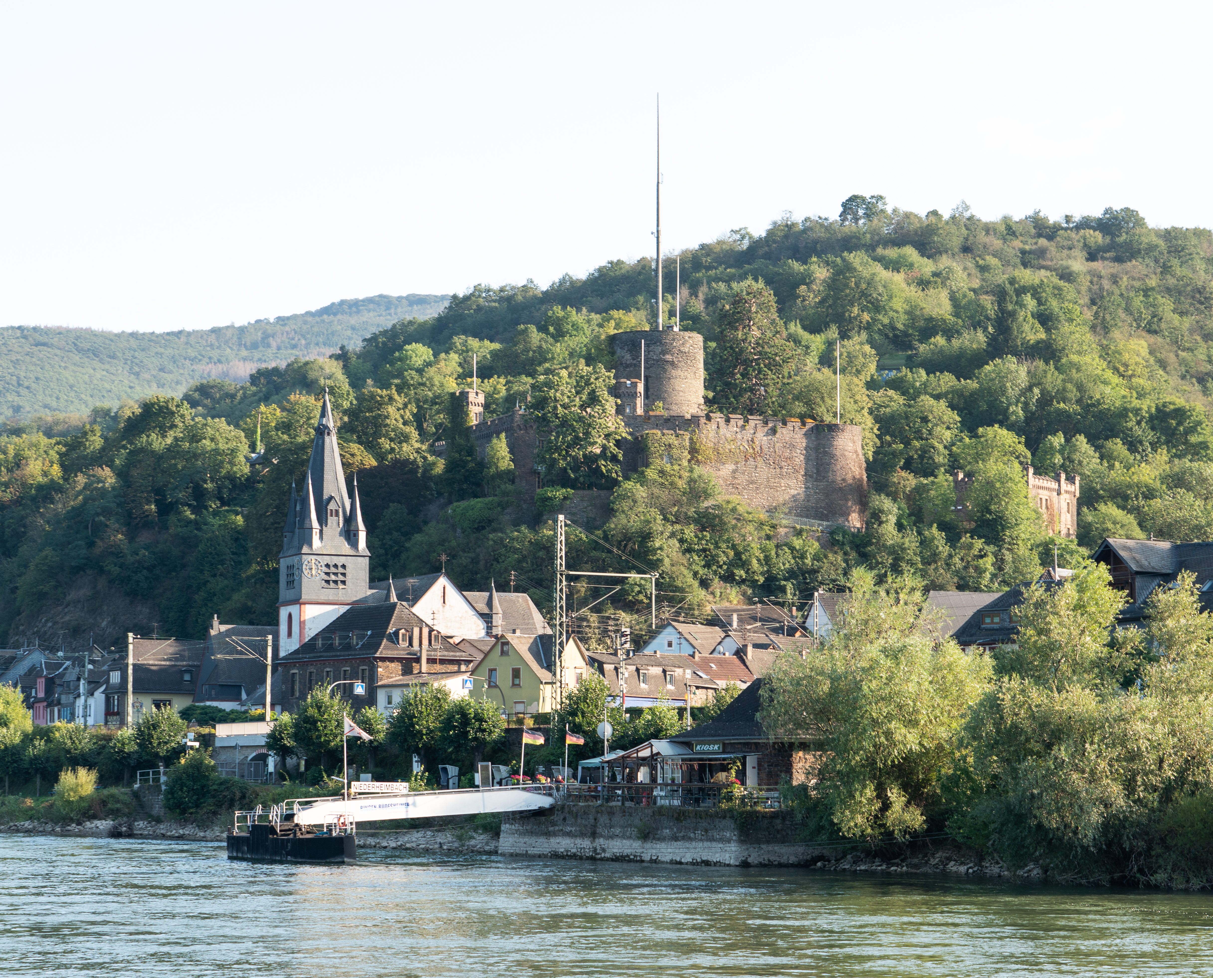 Osterspai Castle (dark and light brown building in the center) was built in 1302. It is directly on the banks of the Rhine in the town of Osterspai. You can still see remnants of the corner towers that were built in the 14th century. All that remains of the more modern portion is a residential half-timber building that was added about 1900.