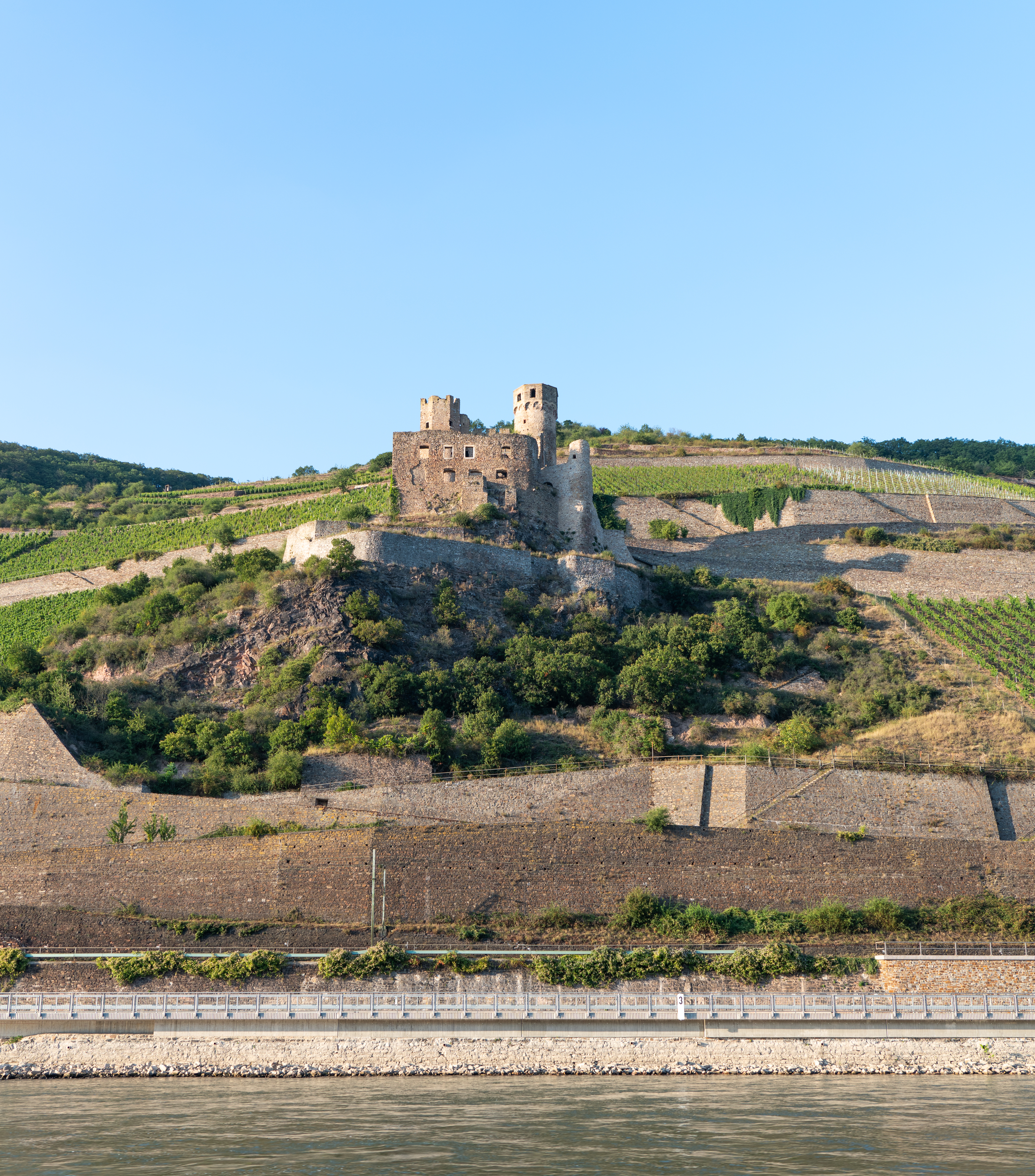 Ehrenfels Castle is near Rüdesheim am Rhein. It was built (or likely re-built) around 1212 and was demolished in 1689. It was used to collect tolls in conduction with the Mouse Tower, which is below it.