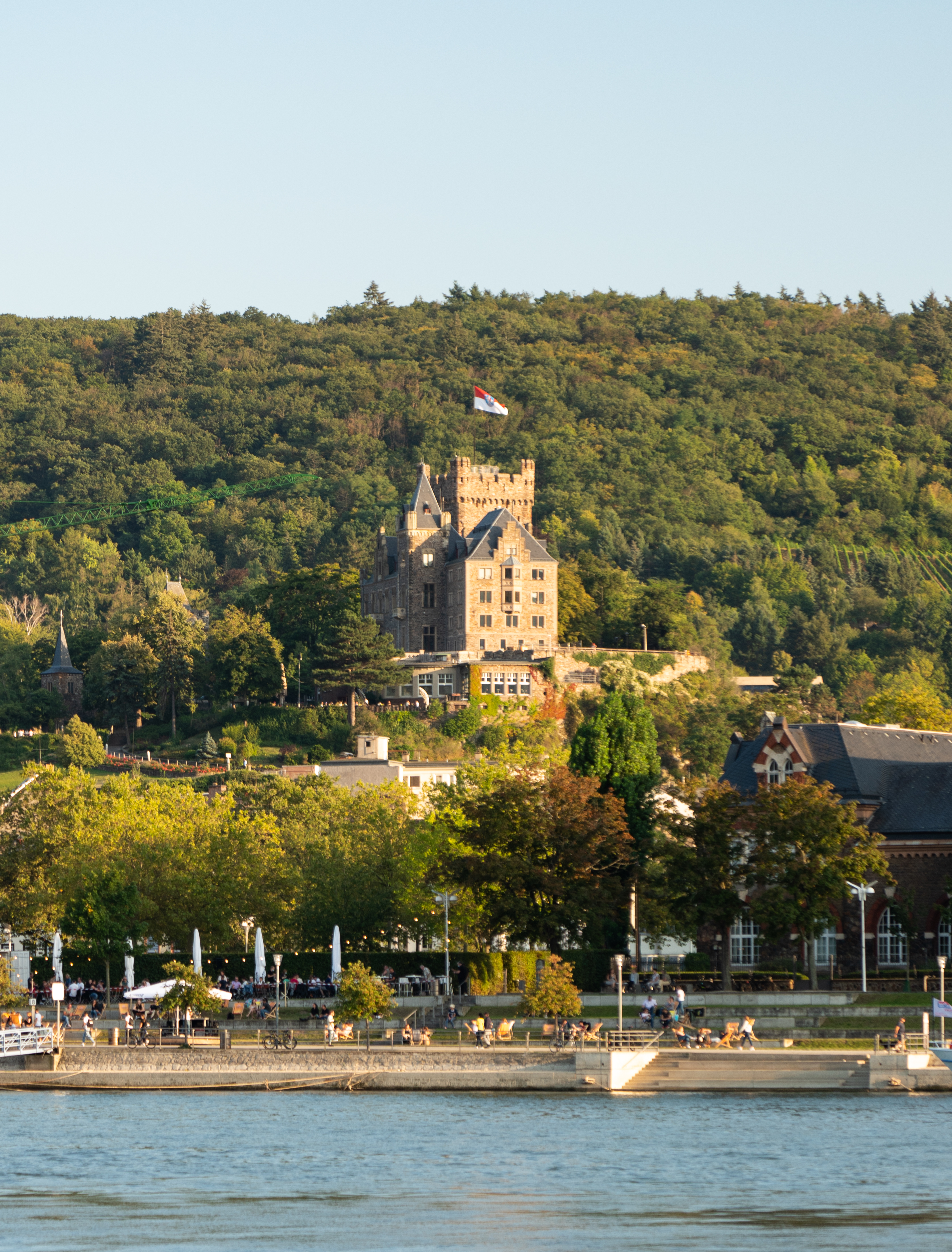 Klopp Castle dates back to the 13th century, but was built on the site of previous castles. This castle also was part of the toll network with Mouse Tower and Ehrenfels Castle. The current building is from a rebuild in the 19th century, but there are remnants of the medieval castle in the moat, southern wall, and part of a pathway.