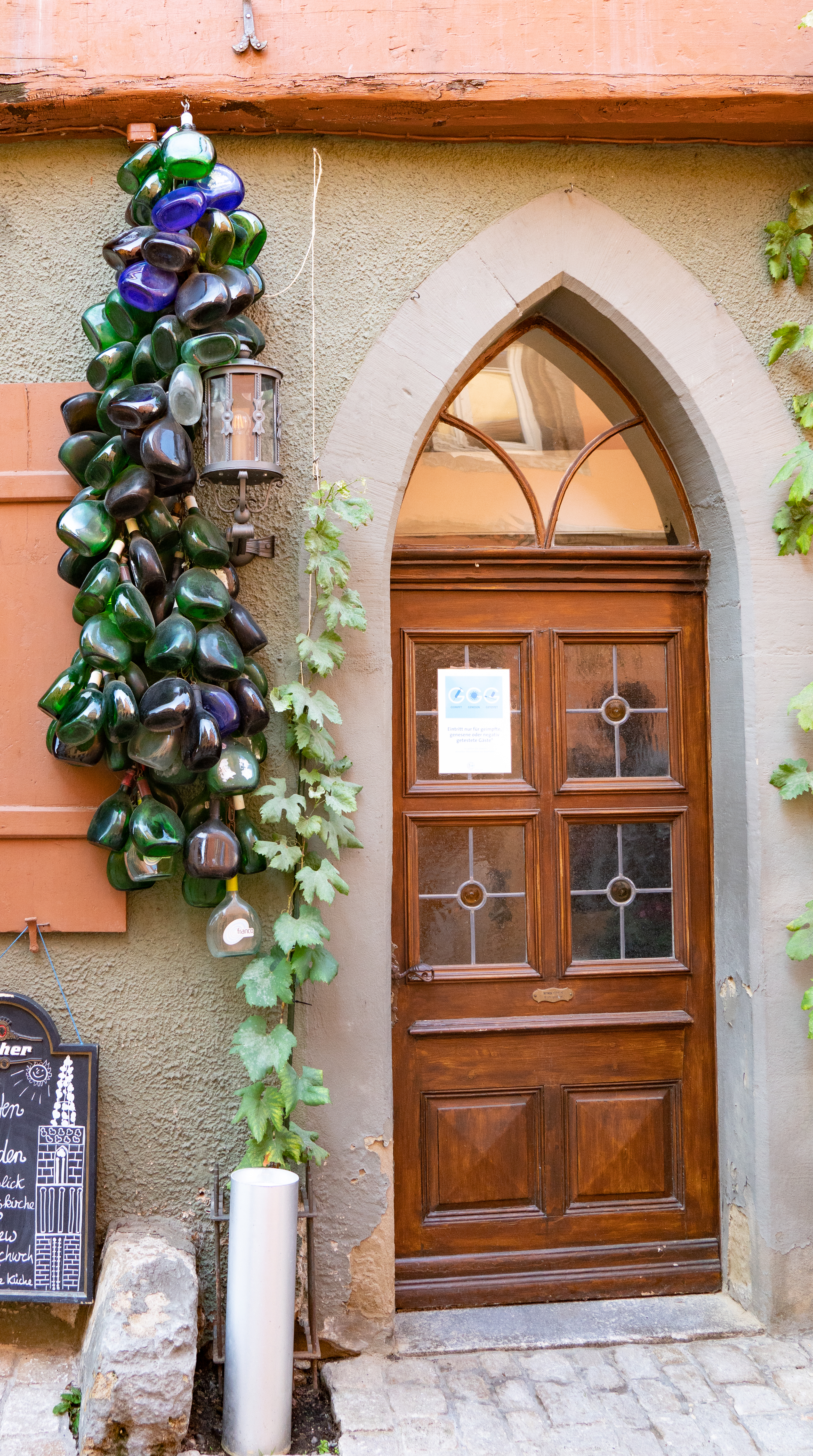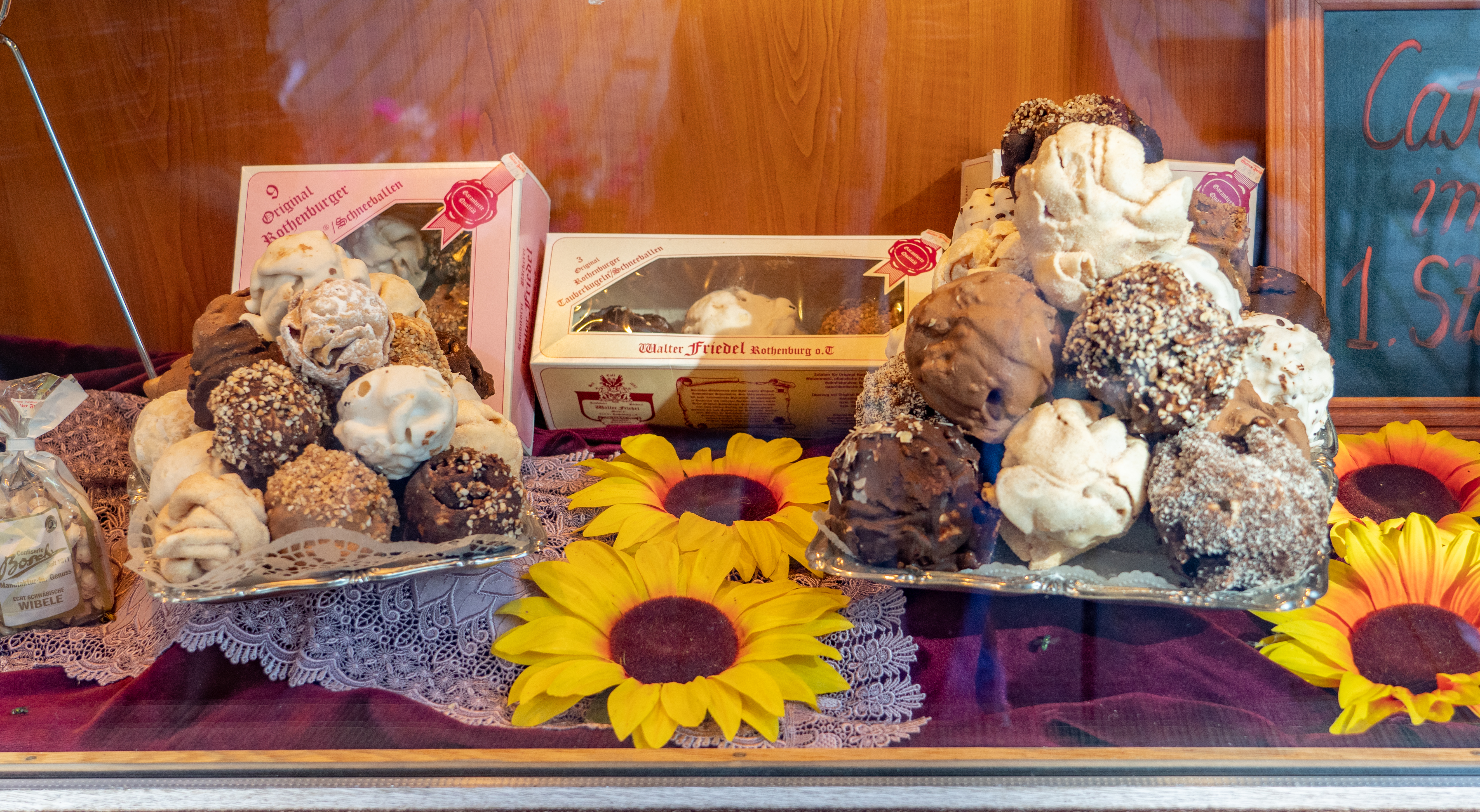 There are a couple of things that are unique to Rothenburg and the surrounding area of Franconia. There is a pastry snack, called a schneeball (snowball), that was developed here about 300 years ago. It is made from strips of short cut pastry that are formed into a loose ball, deep fried, and then coated with sugar or chocolate. I was going to get one, but our guide said they are very, very dry and have a shelf life of 8-10 weeks, being just as dry on day 1 as on week 10. Not so enticing.
