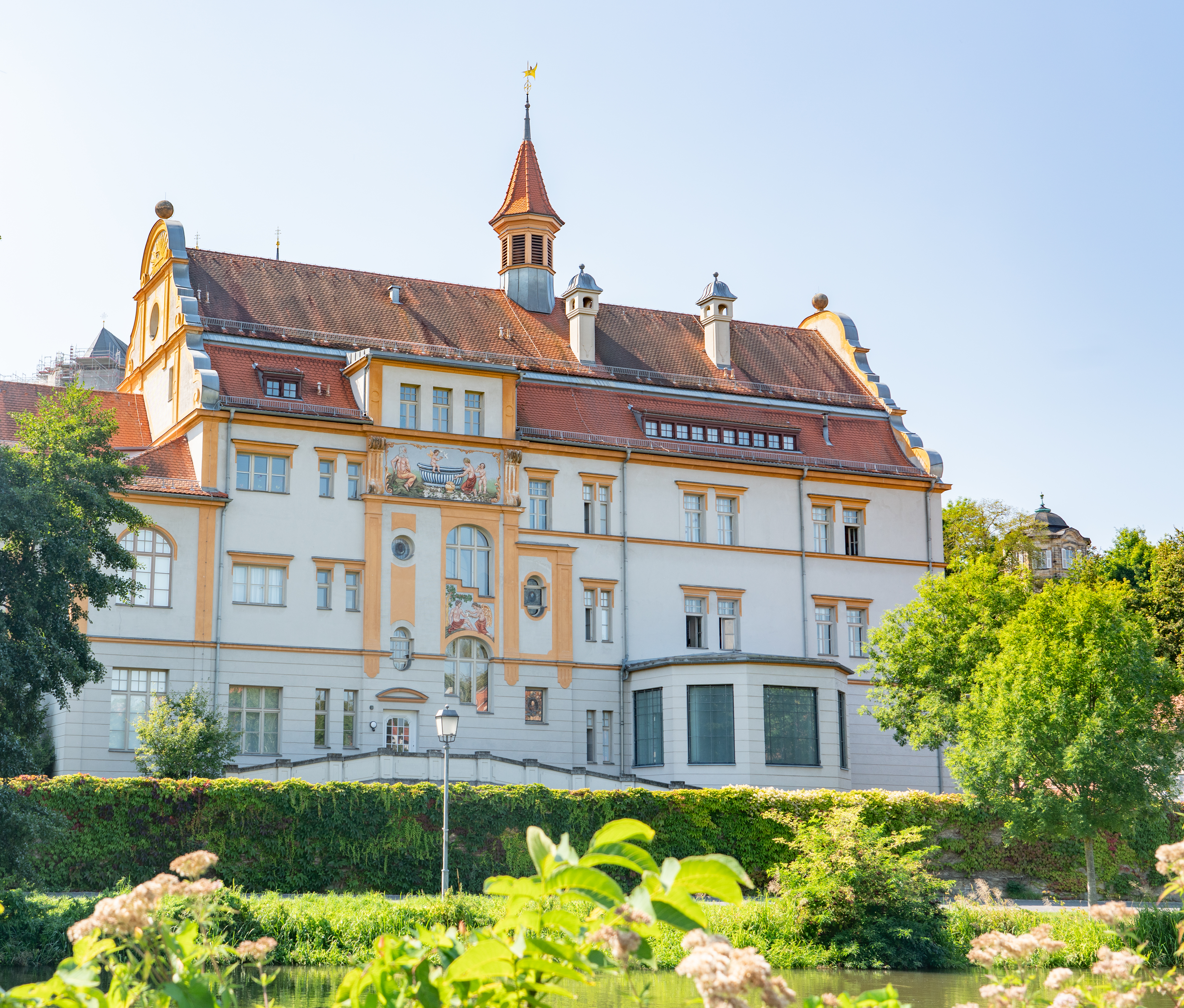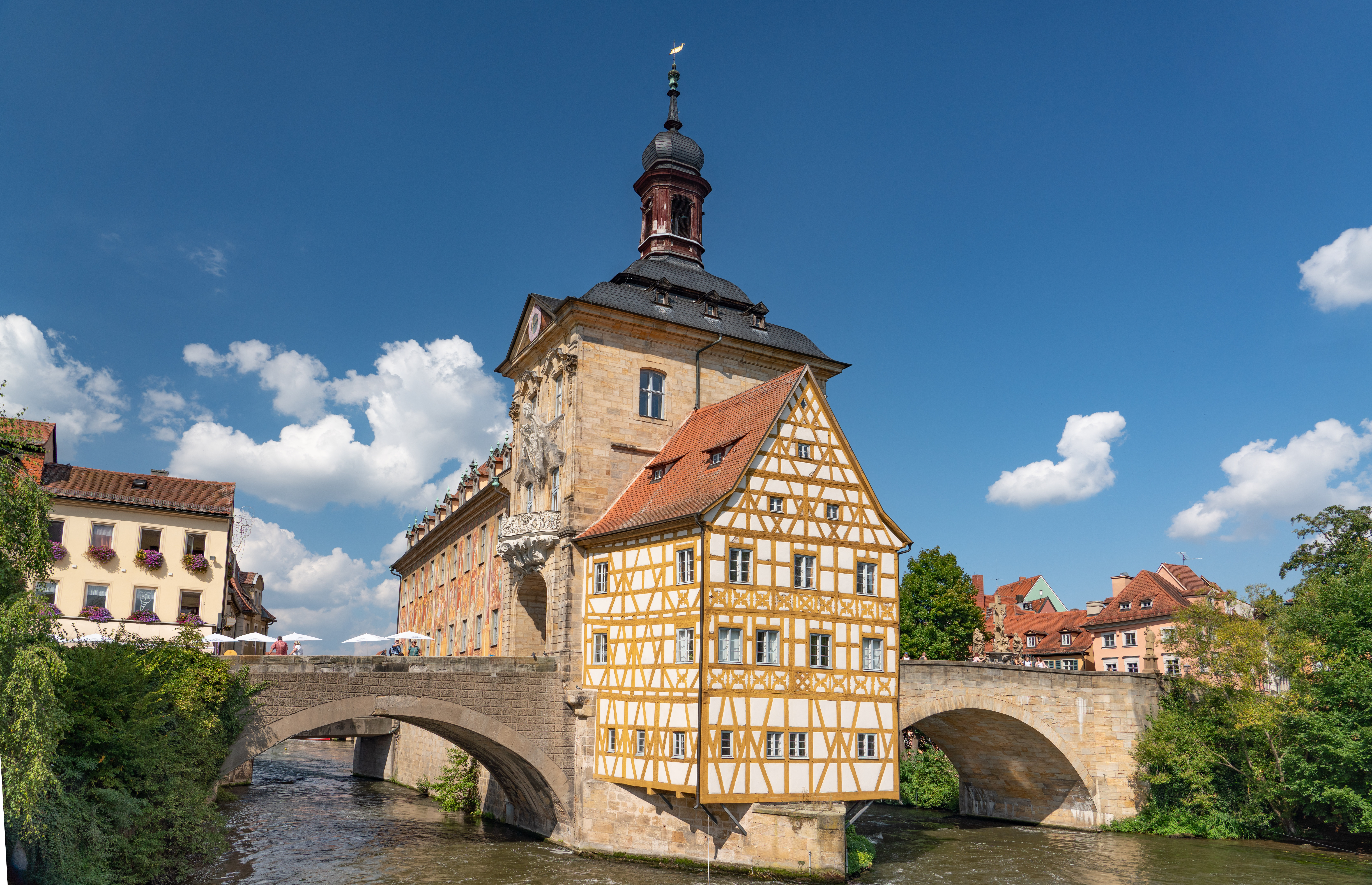 The Bamburg town hall is built in the river because the bishop of Bamburg did not want to give up any of his land for a town hall to be built. The townspeople took stakes, put them into the river, and created an artificial island where they could build the town hall. It dates back to at least 1387.