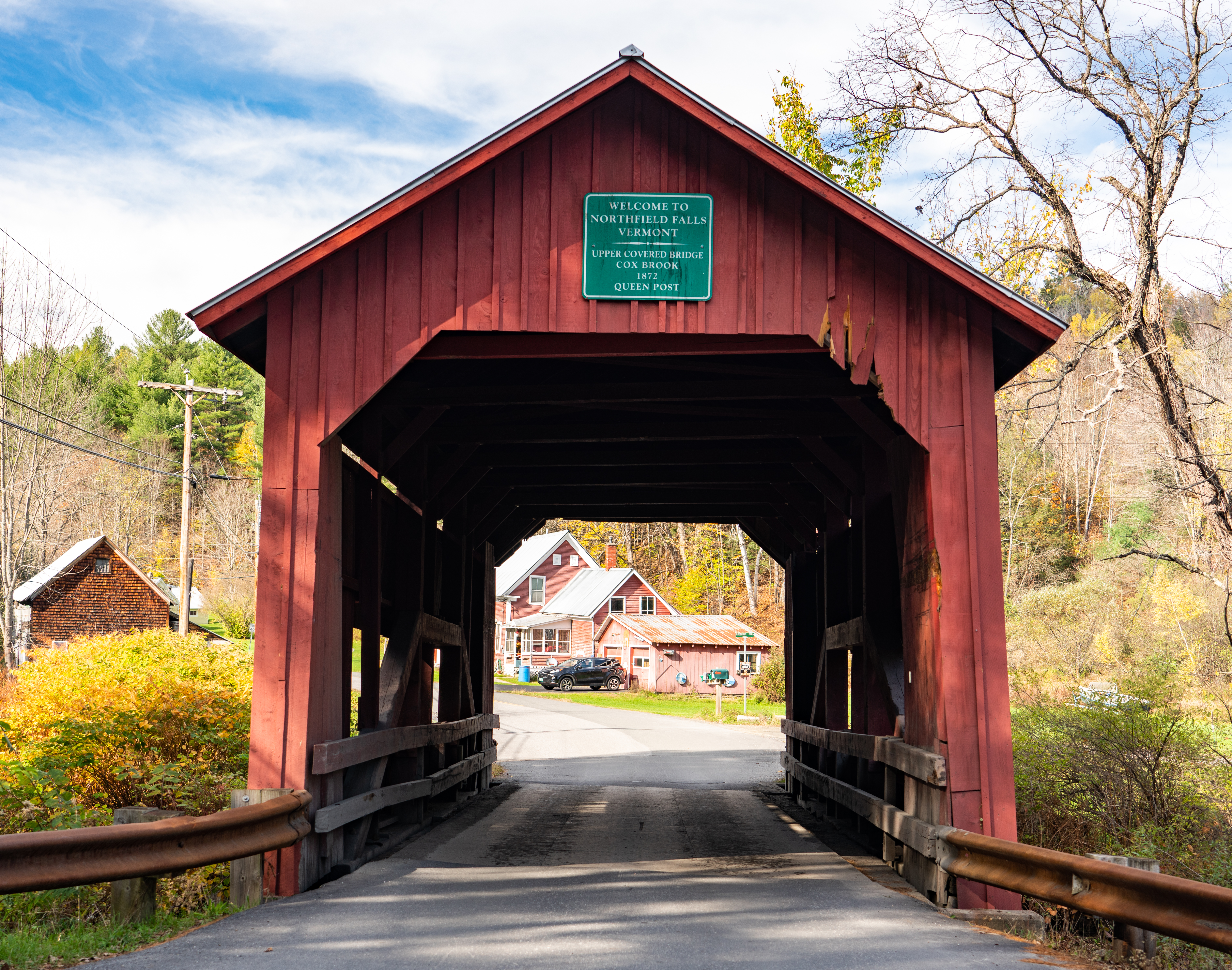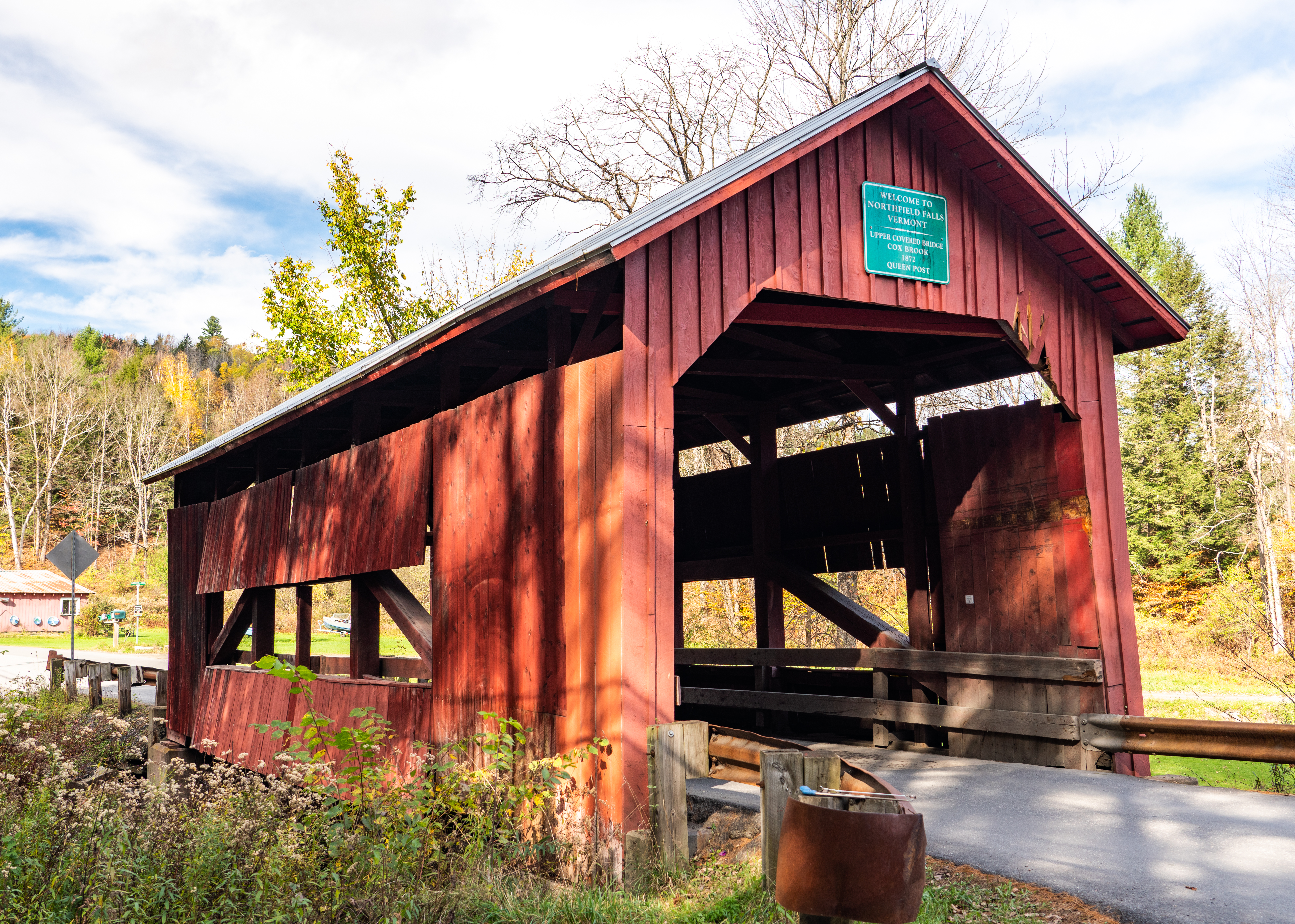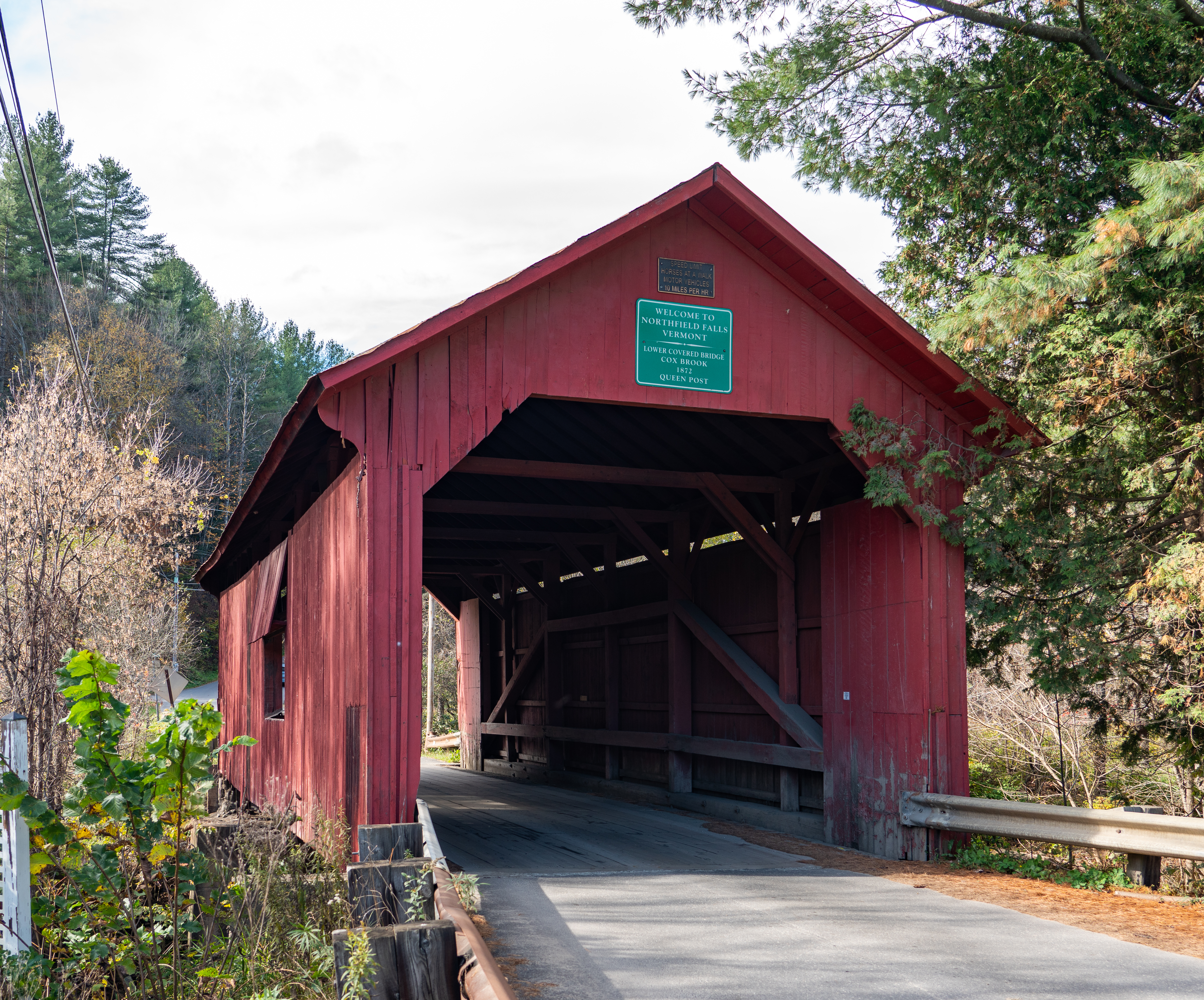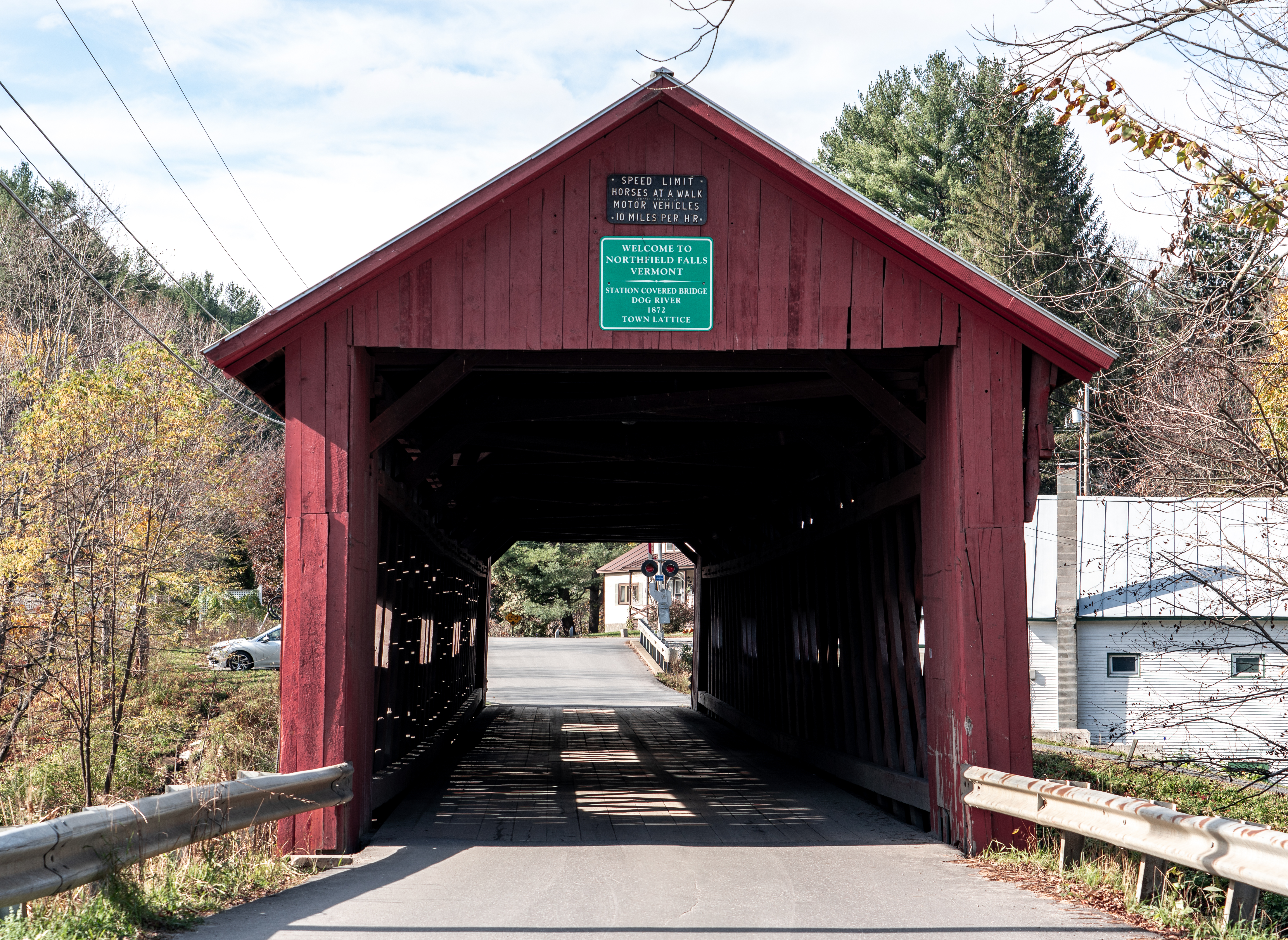 Northfield Falls Covered Bridge (AKA: Station Covered Bridge) is in Northfield Falls and spans the Dog River. It was built in 1872. The Lower Cox Brook Covered Bridge is visible from this bridge. These are the only 2 covered bridges that are within sight of each other in Vermont.
