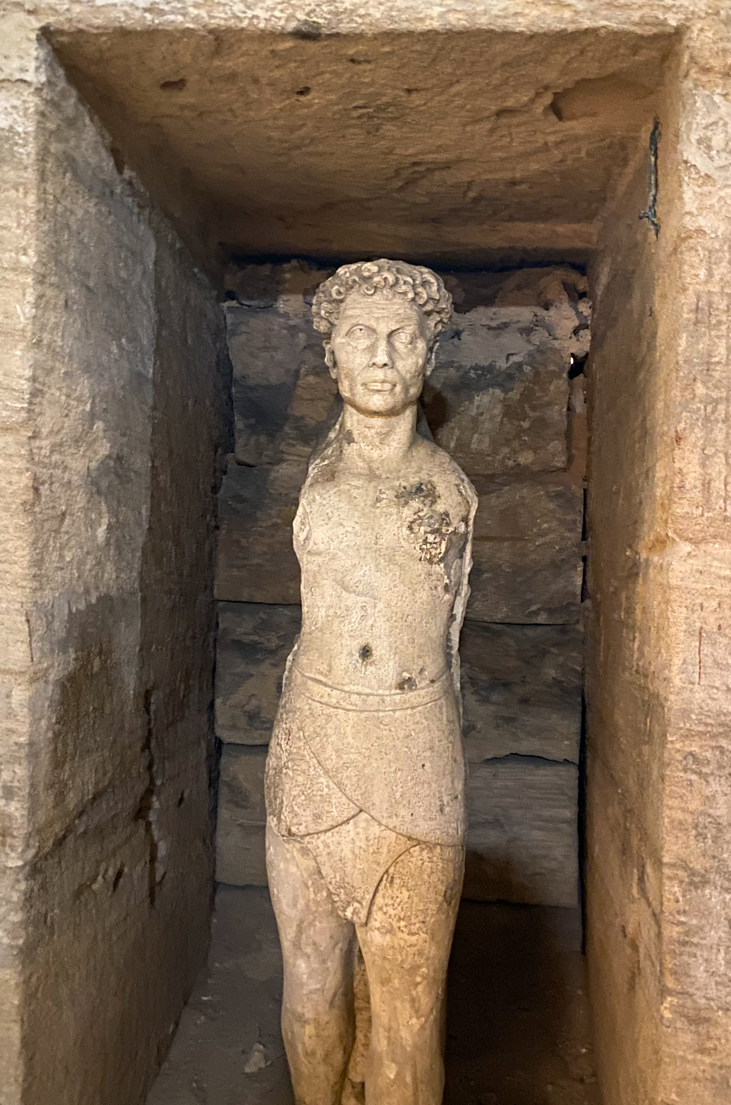 statue of the patriarch at the entrance to the tomb, his wife faces him