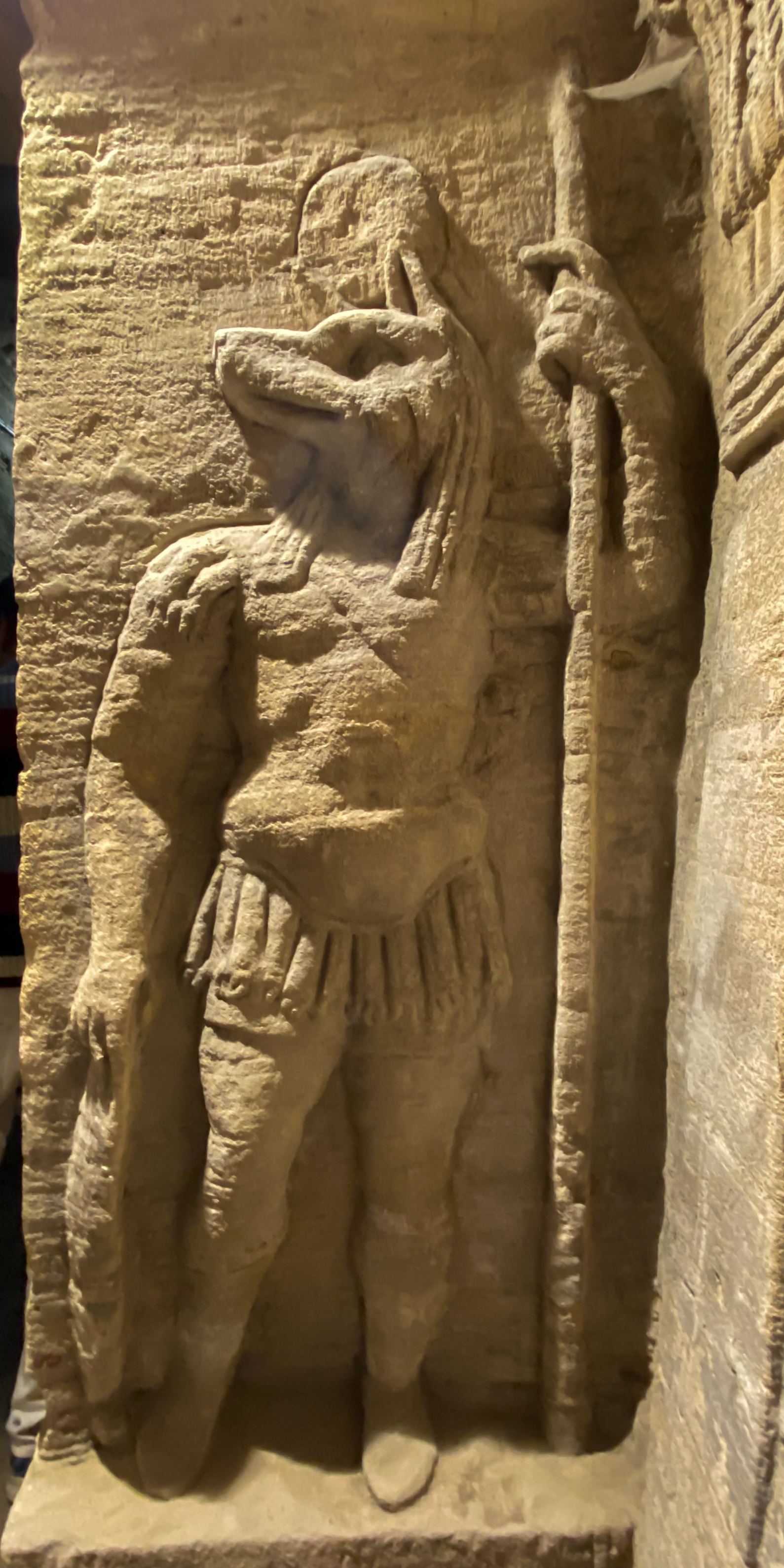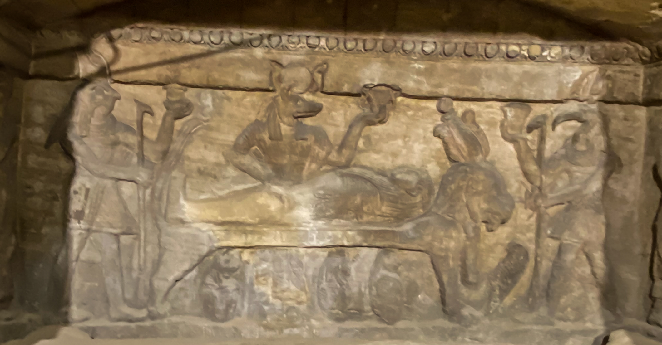 Another sarcophagus: this shows Anubis mummifying the body which is lying on a lion bed.