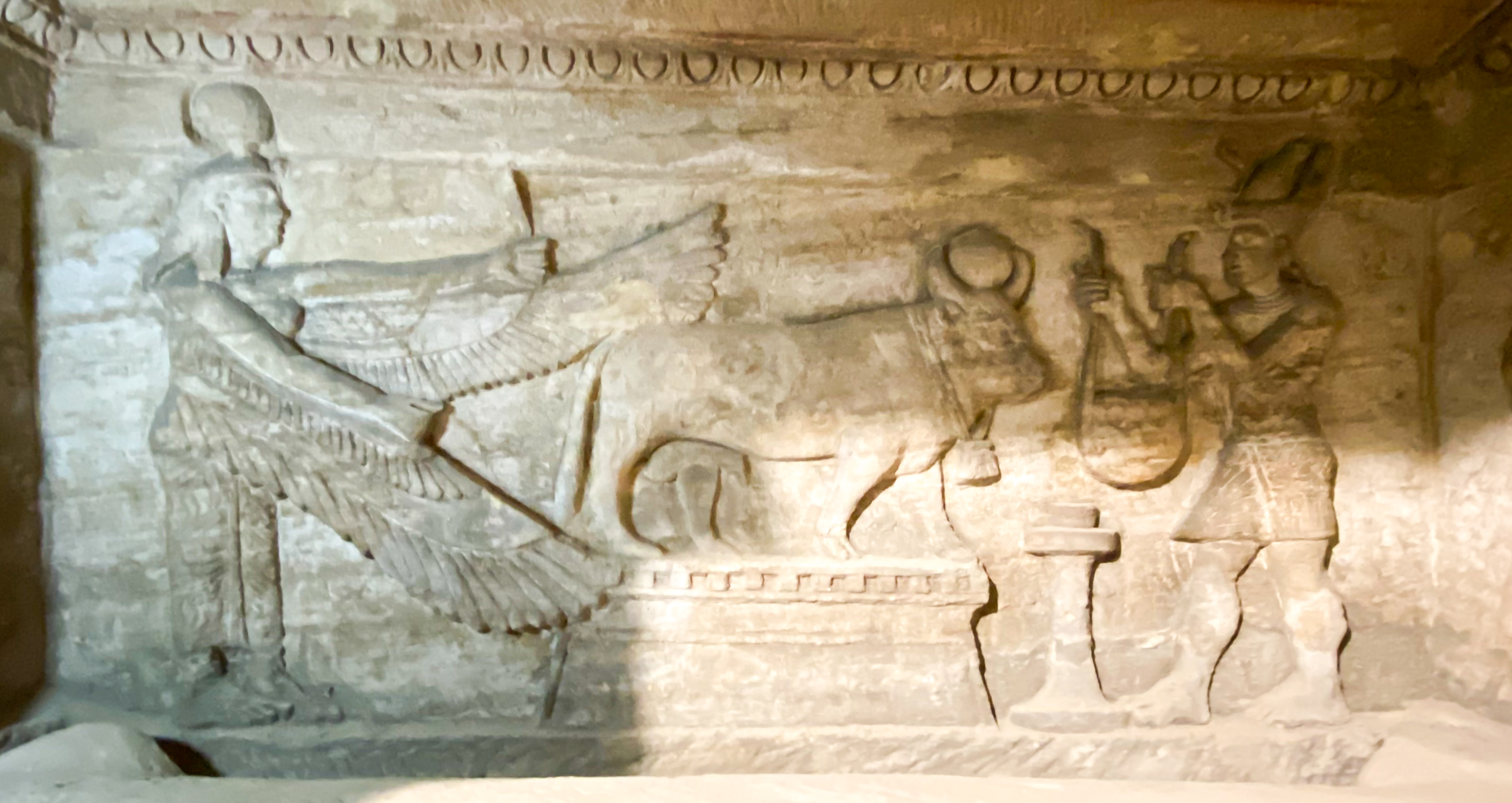 The main tomb chamber is in the bottom and has intricate carvings that combine Roman, Greek, and Egyptian symbology.