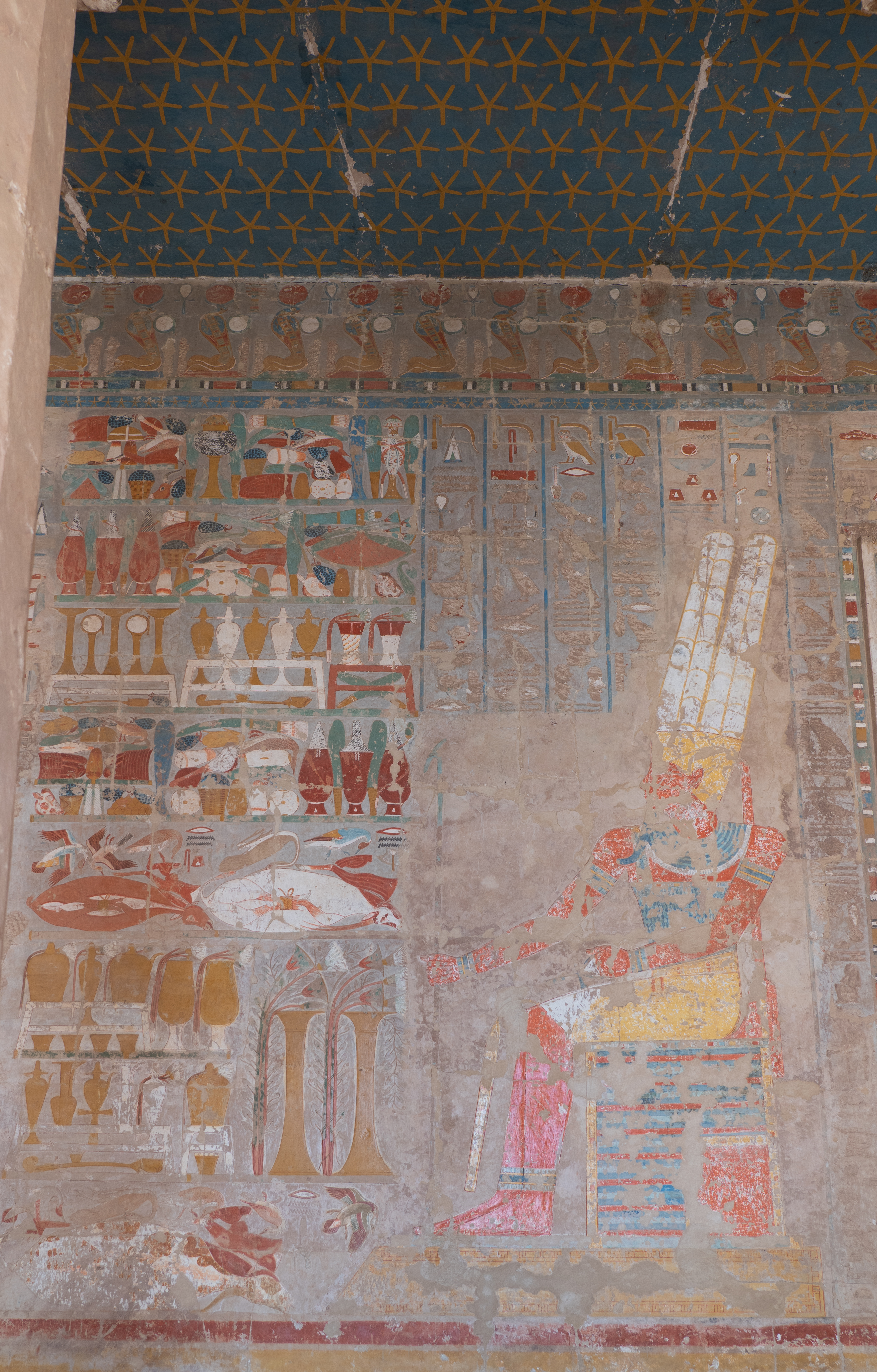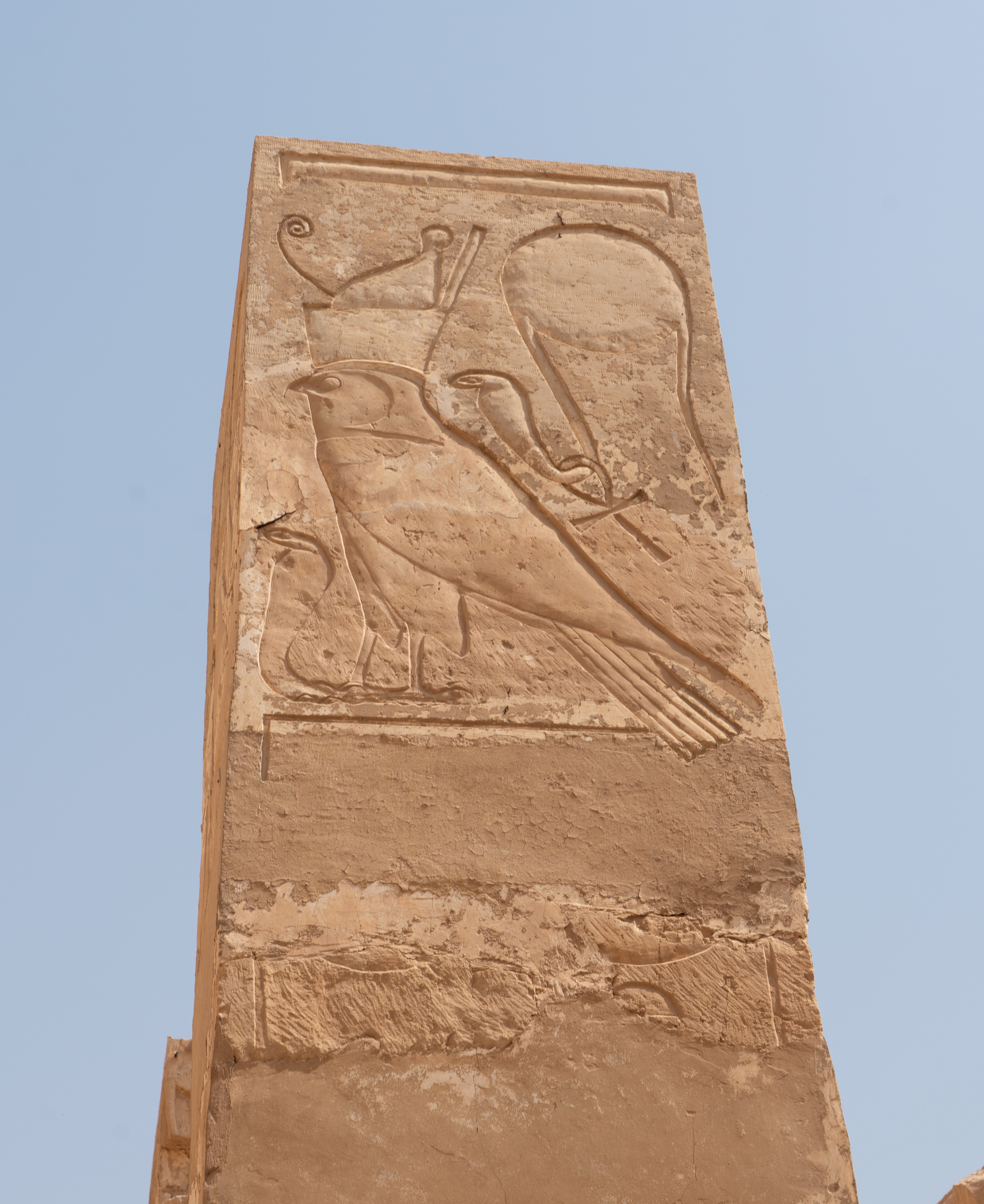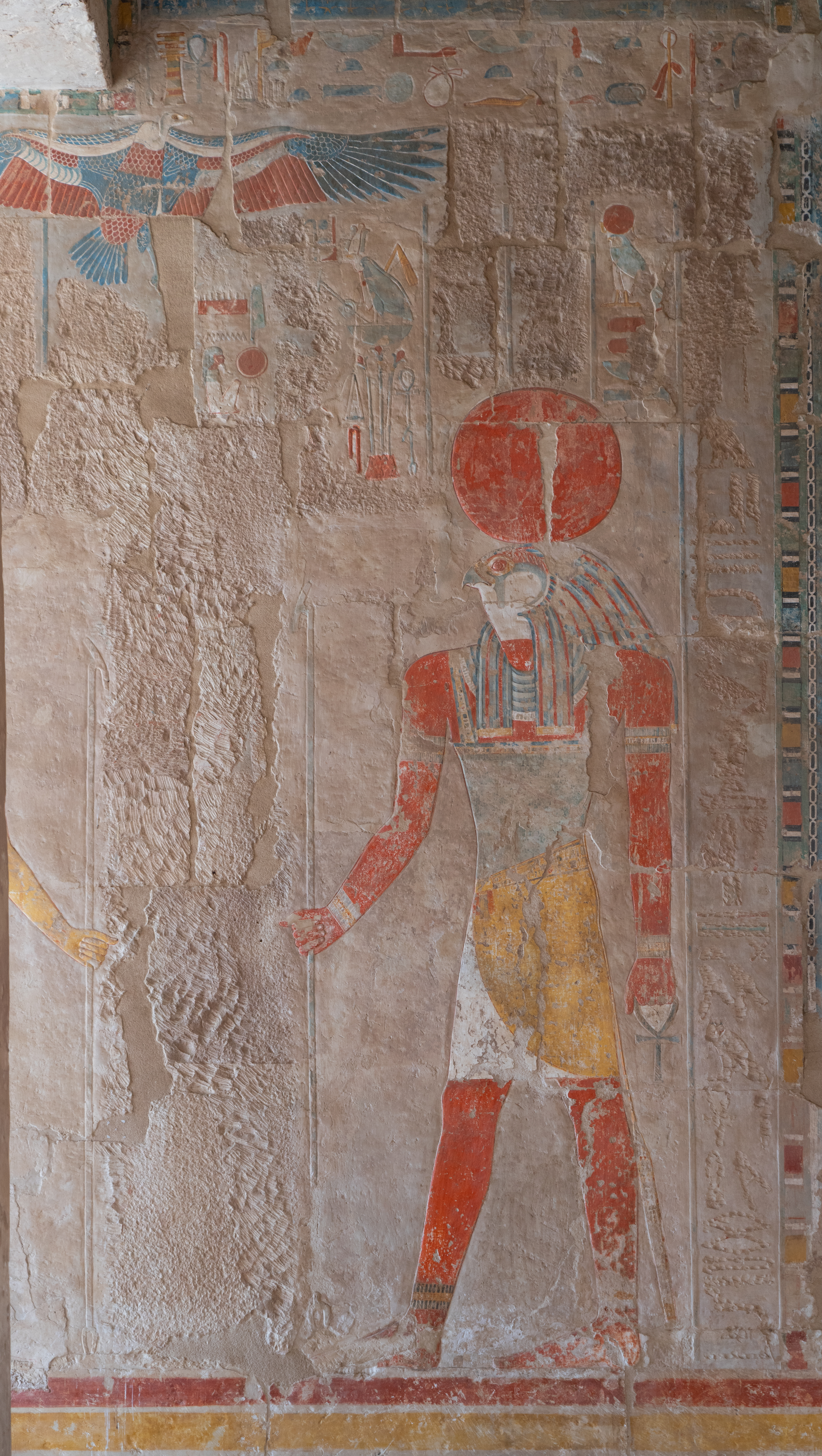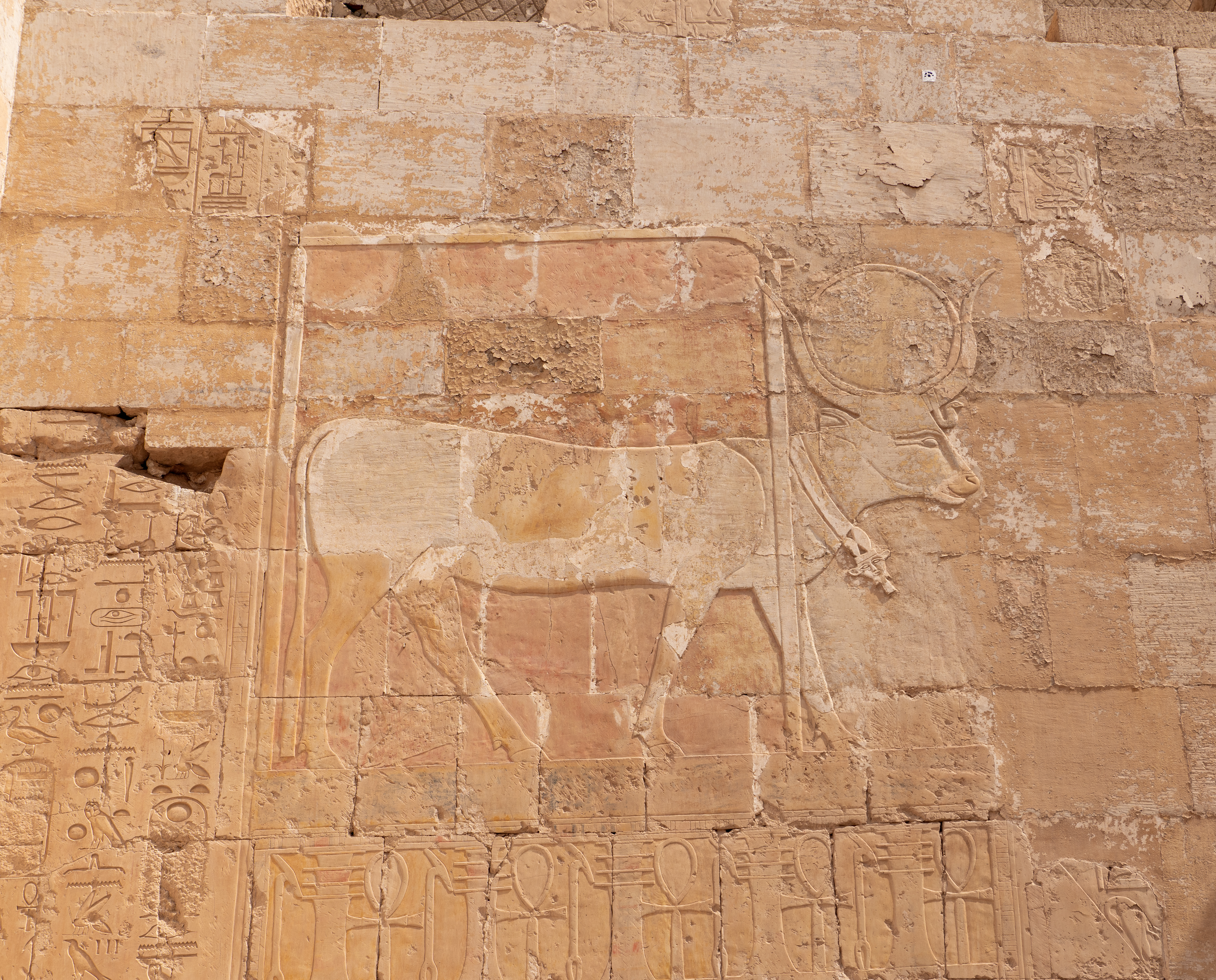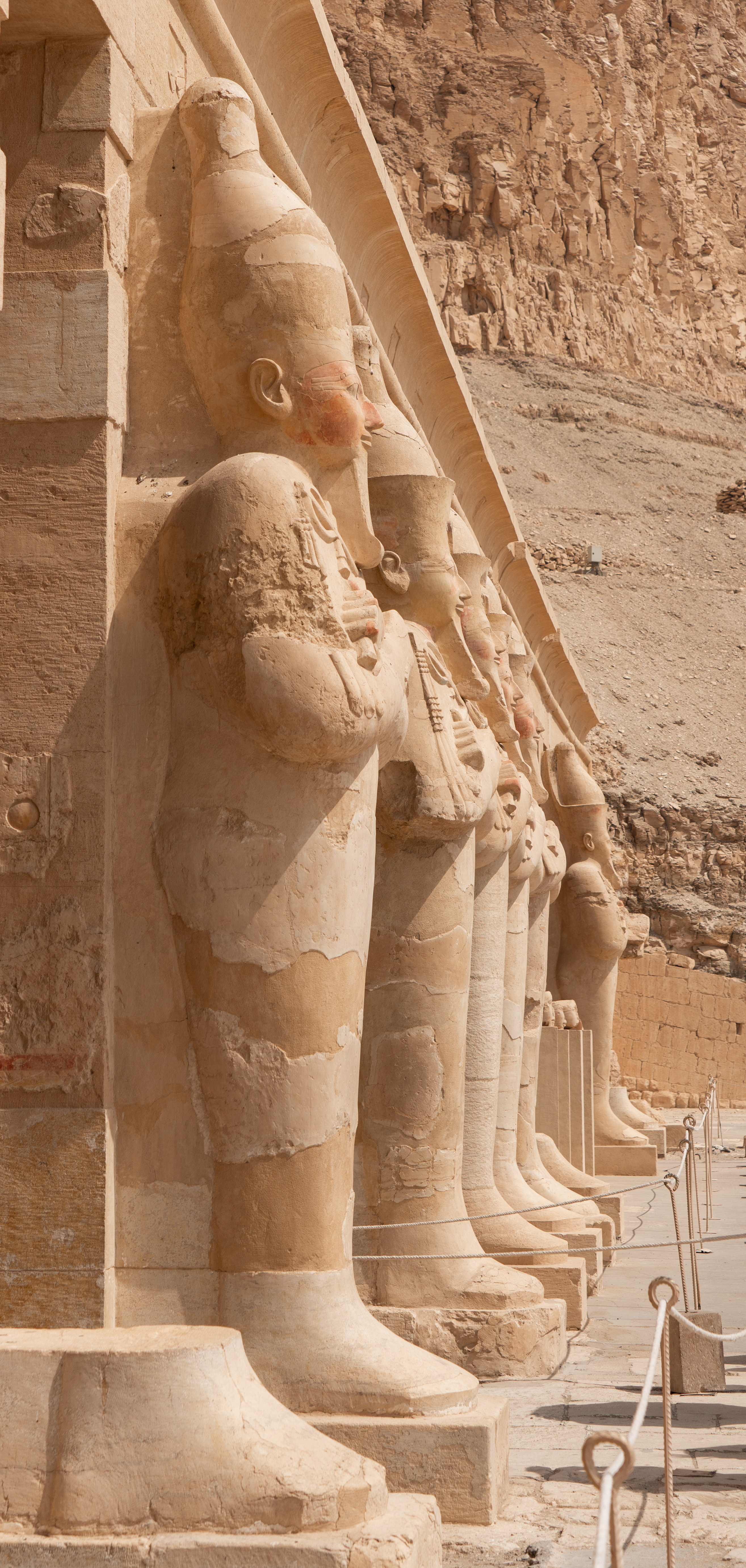 Next we went to the Mortuary Temple of Hatshepsut. This temple is in good condition because it had been buried in sand for centuries. Hatshepsut was a ruling queen in the 18th dynasty. ruling from 1479-1458 BC. She was the 2nd historically confirmed female pharaoh. She was the principal wife of Thutmose II and initially ruled as regent to Thutmose III, as son of Thutmose II by another wife and the heir to the throne. Thutmose III inherited the throne at age 2 and Hatshepsut asserted her right to the throne as daughter of Thutmose I and his primary wife. (Her husband Thutmose II was the son of Thutmose II and a secondary wife.) Our egyptologist says she was murdered by Thutmose III, who tired of her being in control when he was the heir of Thutmose II. It is unclear how she died and she may have been murdered by her husband so that he could gain the throne. It is very clear, however, that an effort was made to erase her from history shortly after her death. Her name and images was defaced from temples and other buildings.