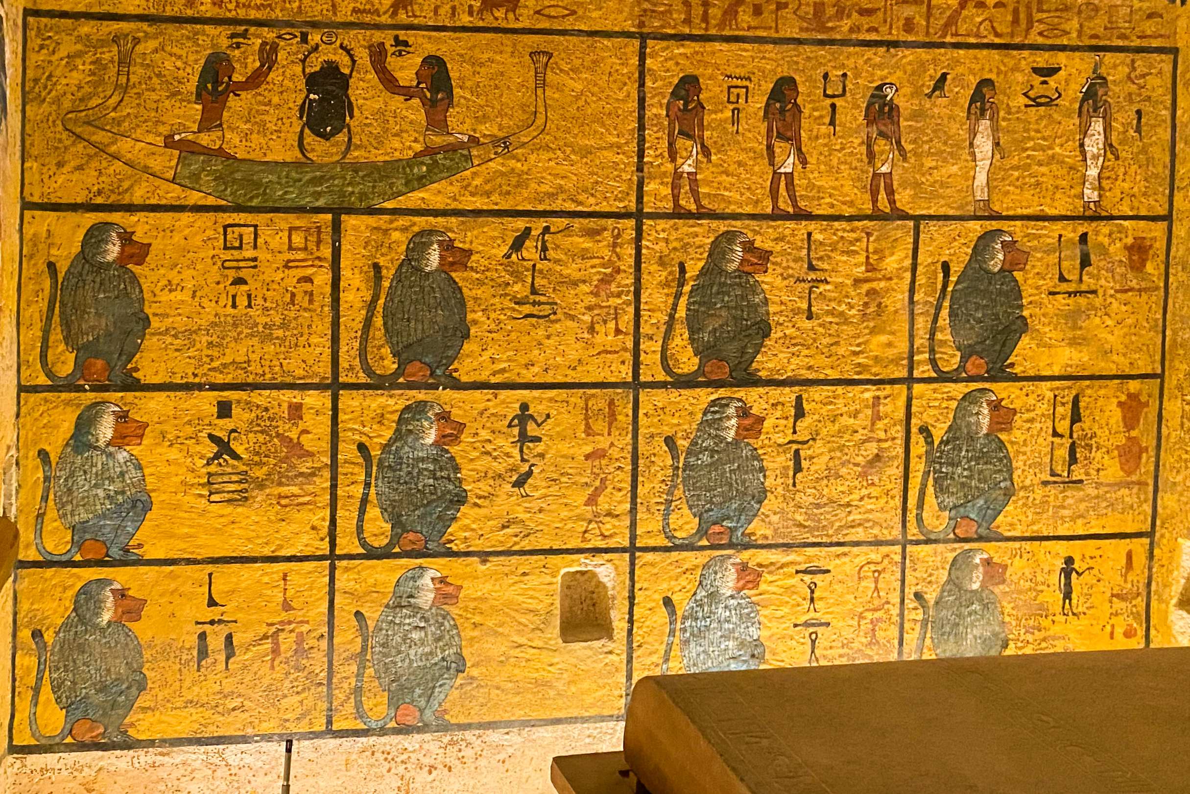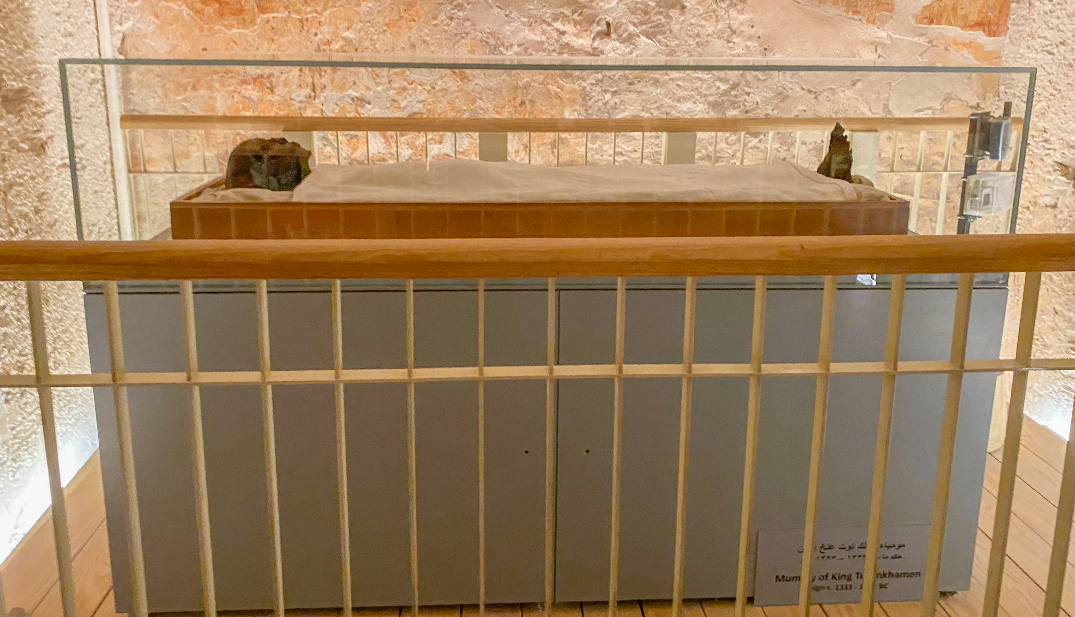 It takes an extra entrance fee to go into King Tut’s tomb, but they do not appear to limit the number of people entering it. His tomb is very small, with only 2 small rooms. This is likely because he died unexpectedly at a young age. He was the last of his family line to rule and he lived from 1341-1323 BC. He reigned for about 11 years and left no heirs as his 2 daughters were stillborn. His intact tomb was discovered by British archaeologist Howard Carter in 1922. Its entrance had been covered by rubble from the building of a later tomb. While all of the artifacts have been removed, the mummy of King Tut was left in his tomb.