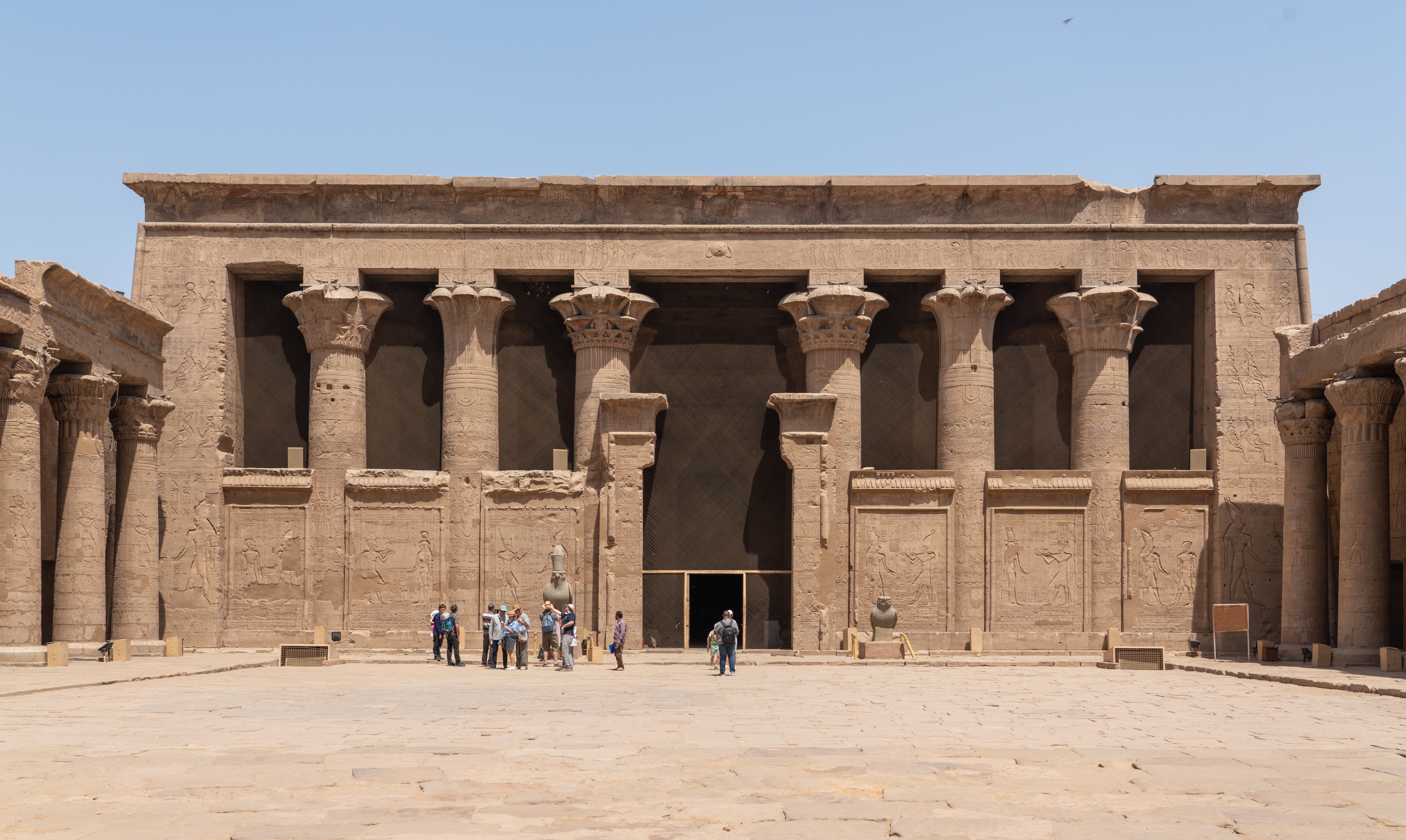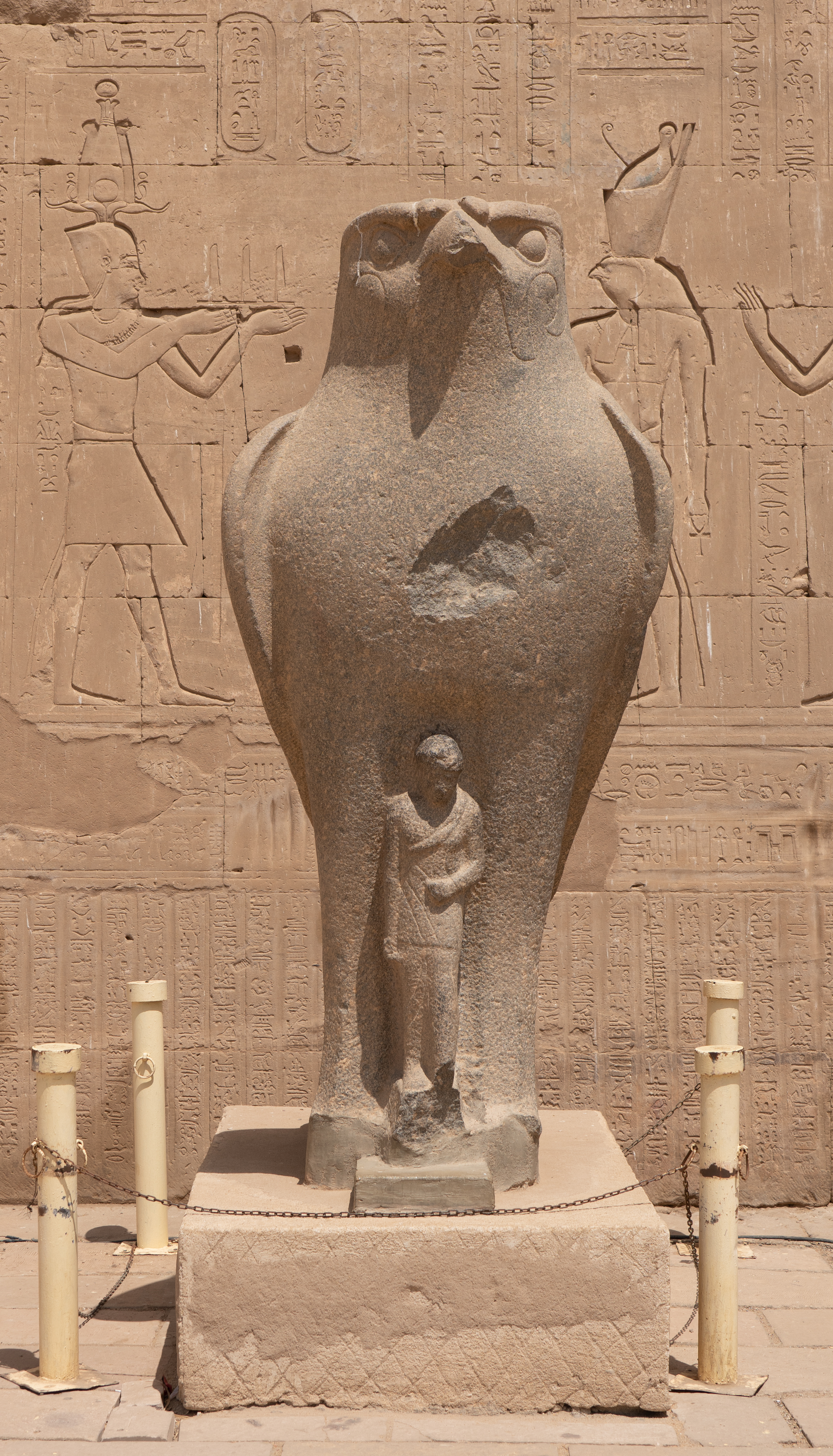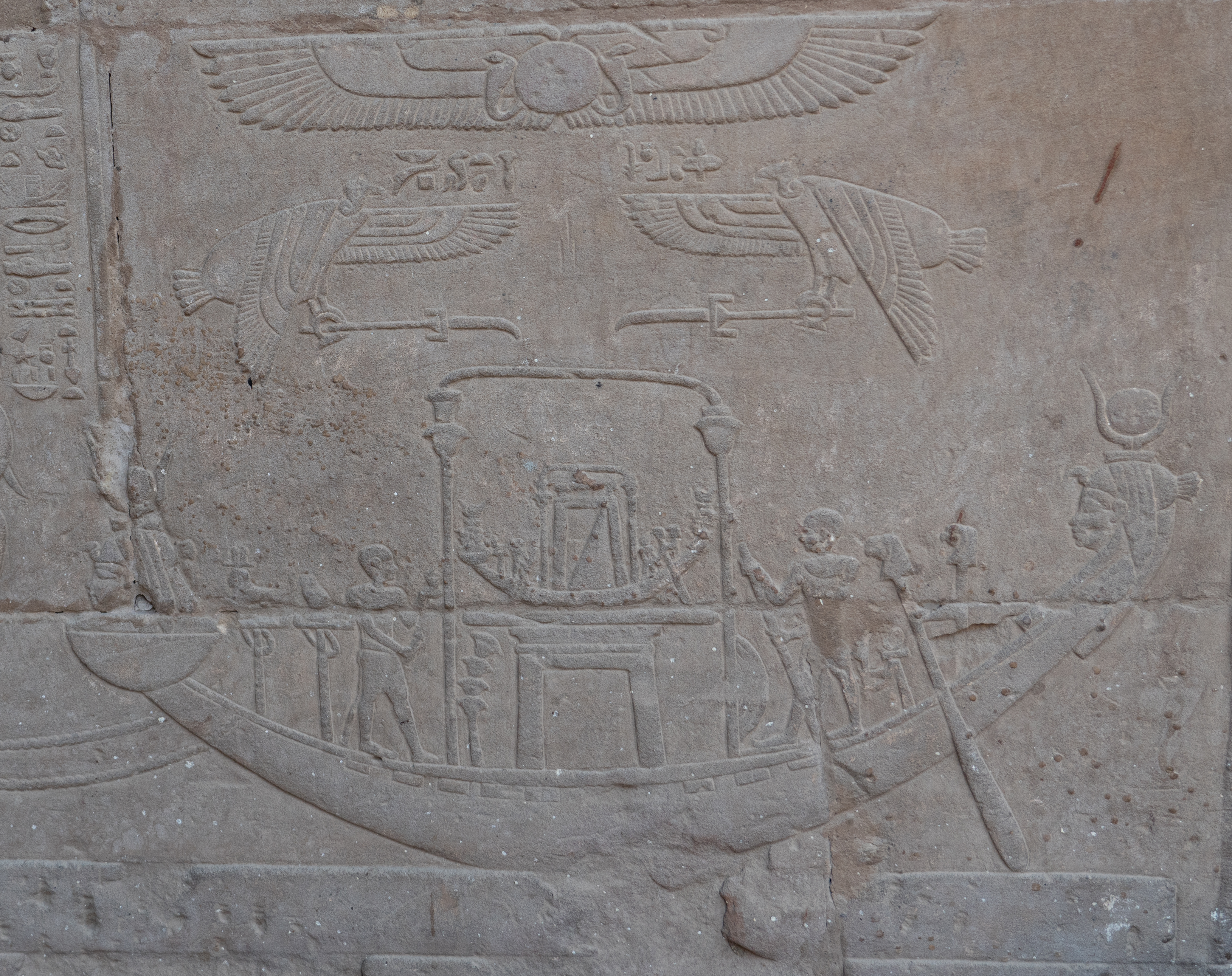 The Temple of Horus, also known as the Temple of Edfu, is a Ptolemaic temple that was built between 237-57 BC for the Egyptian god Horus. This temple is nearly intact. Horus is represented in hieroglyphics with a falcon. In Egyptian mythology he was the son of Isis and Osiris and was the god of the sky, with the sun being his right eye and the moon his left eye. His story is told in carvings and hieroglyphs throughout the temple. The god of the desert, Set, killed Horus’ father. Horus had many battles to avenge his father’s death. He eventually decided to exile Set instead of killing him, but in the process of these battles, Horus lost one of his eyes.