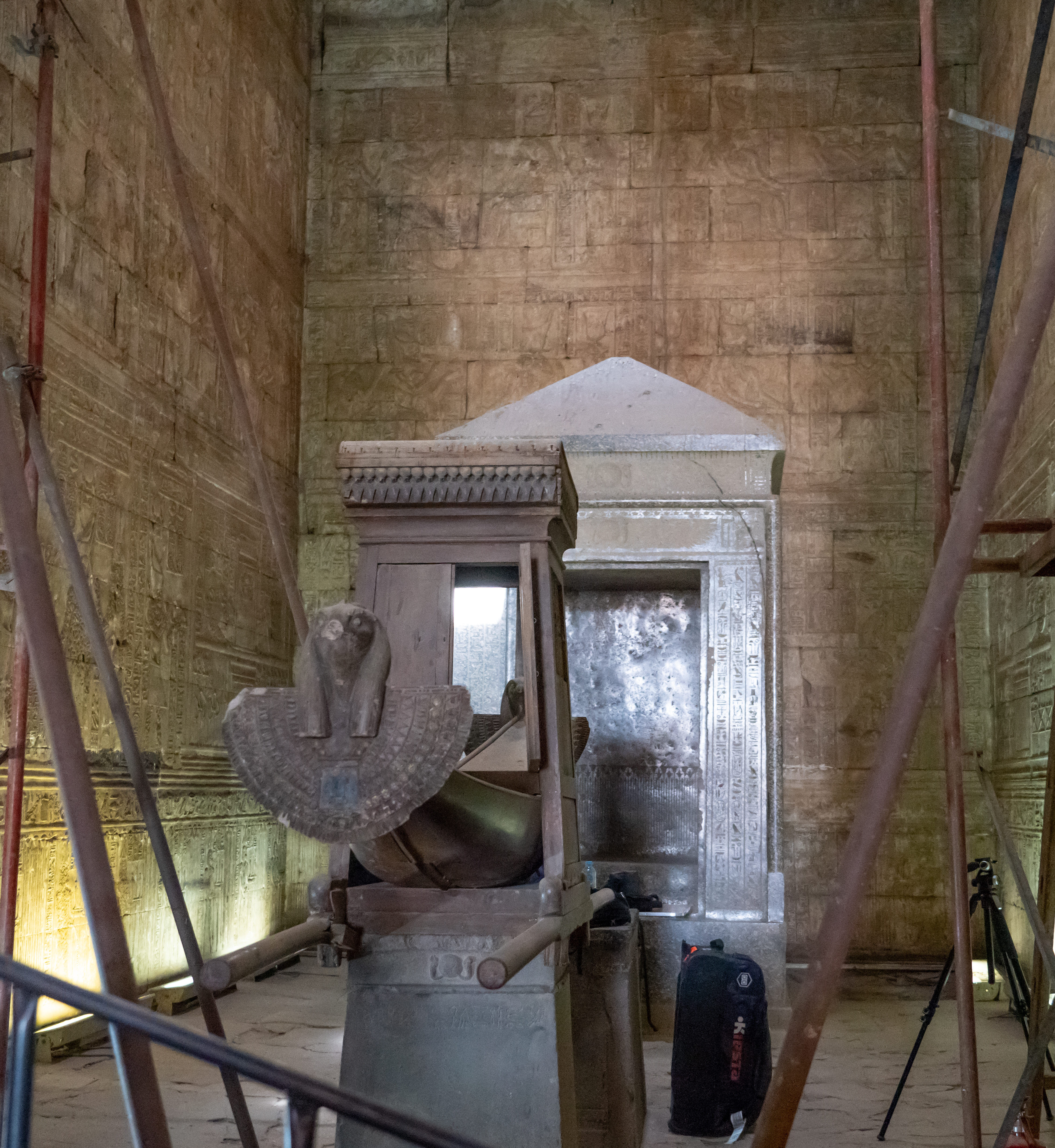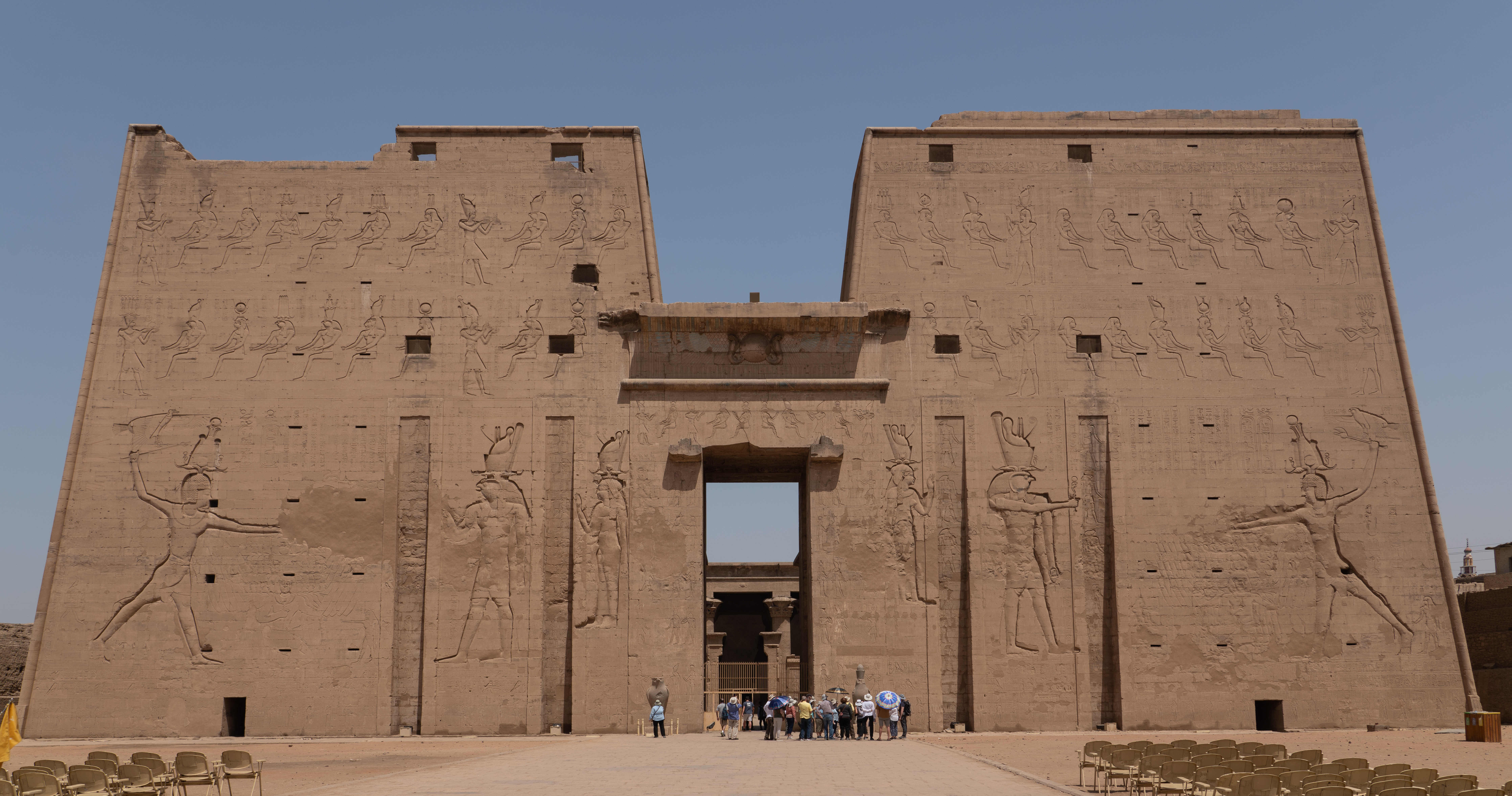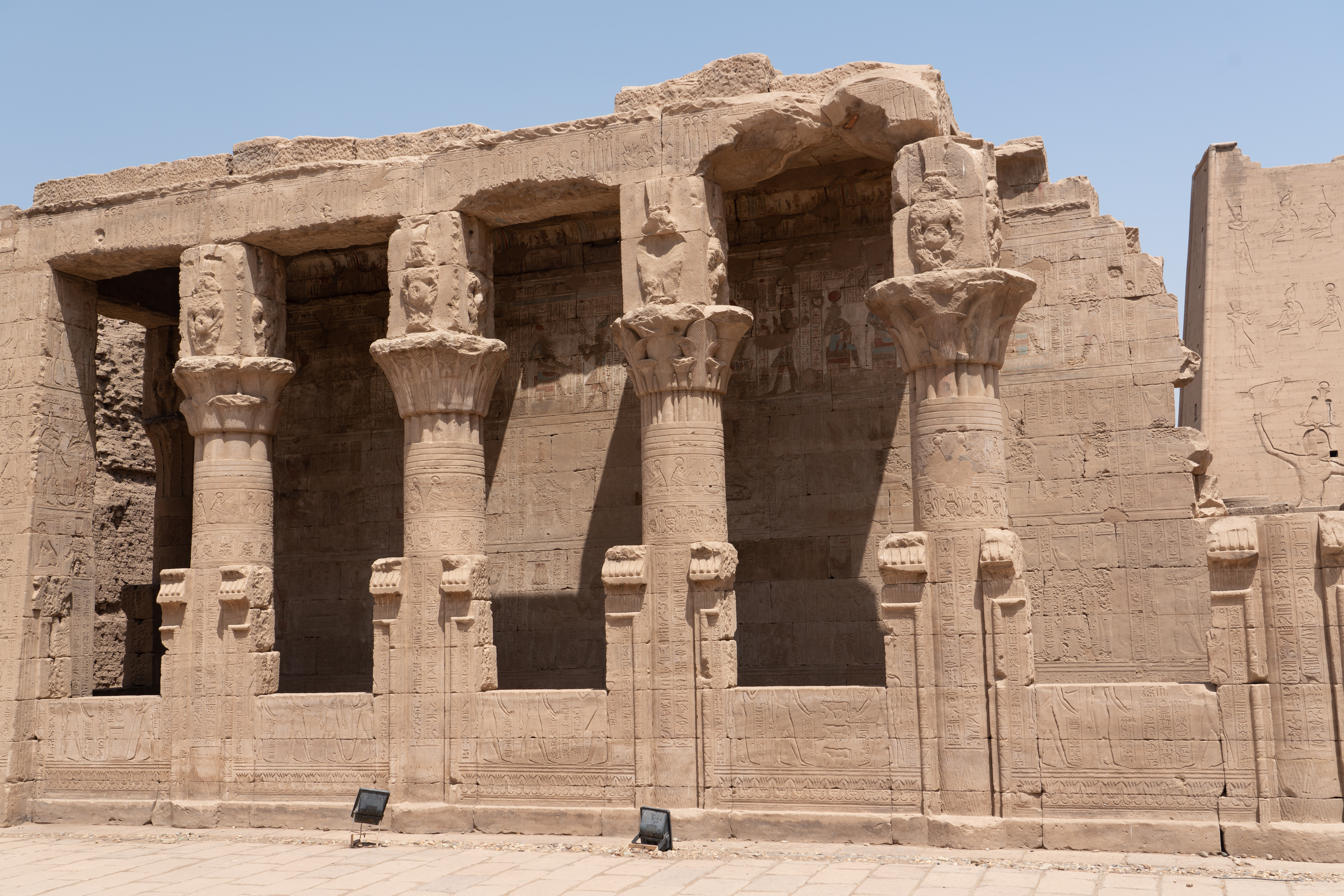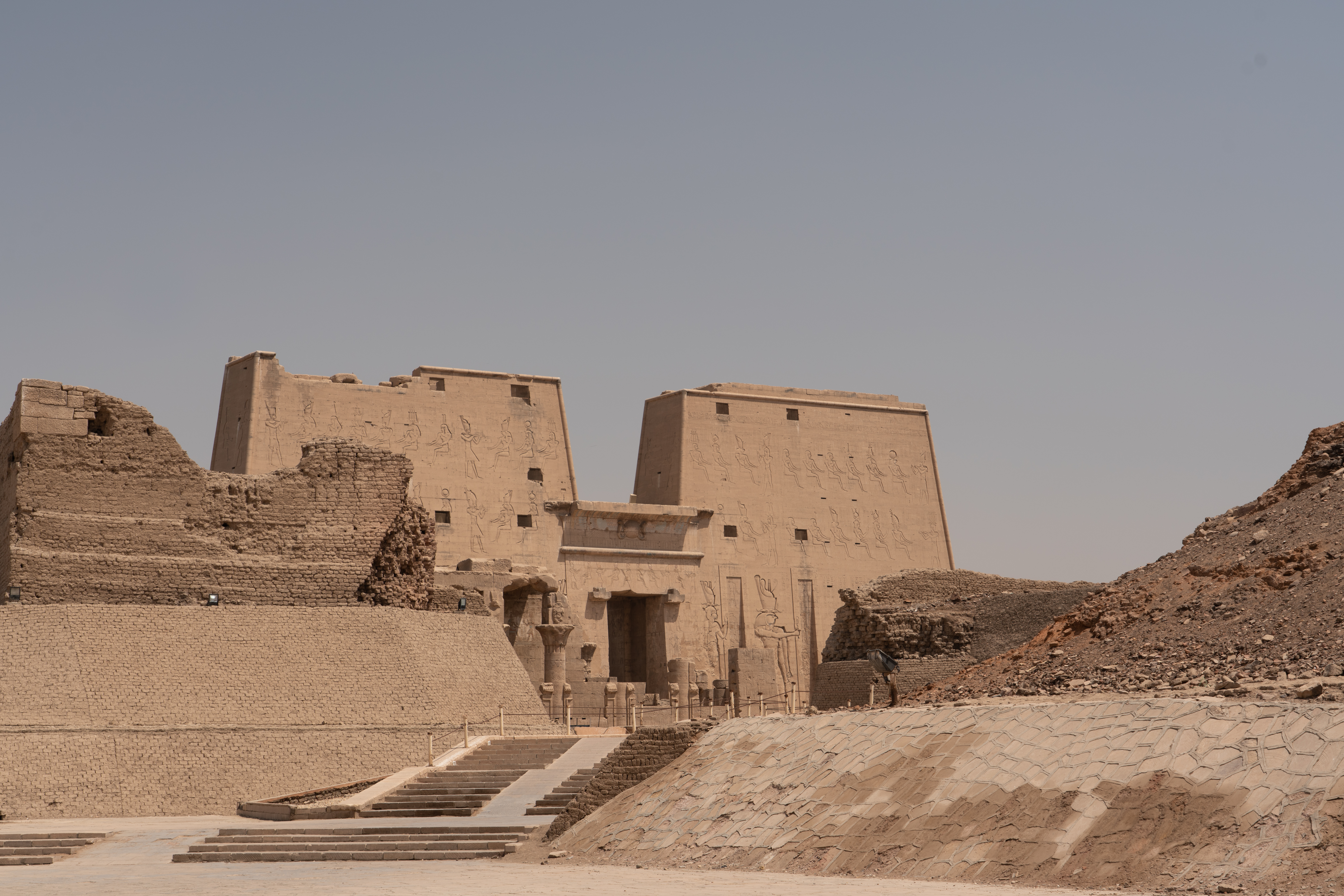 The Temple of Horus, also known as the Temple of Edfu, is a Ptolemaic temple that was built between 237-57 BC for the Egyptian god Horus. This temple is nearly intact. Horus is represented in hieroglyphics with a falcon. In Egyptian mythology he was the son of Isis and Osiris and was the god of the sky, with the sun being his right eye and the moon his left eye. His story is told in carvings and hieroglyphs throughout the temple. The god of the desert, Set, killed Horus’ father. Horus had many battles to avenge his father’s death. He eventually decided to exile Set instead of killing him, but in the process of these battles, Horus lost one of his eyes.