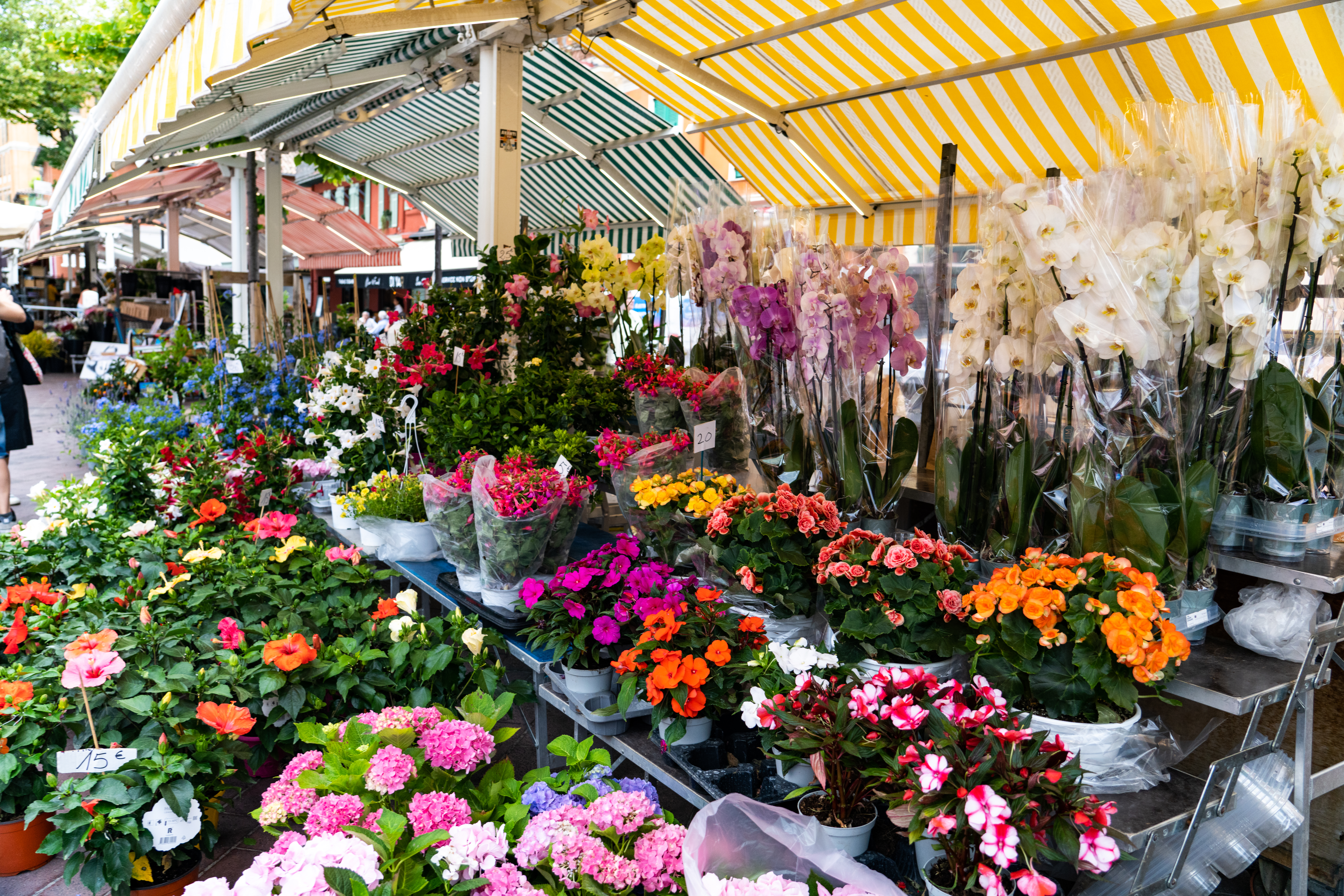 Despite the rain, we walked around town. We started out at the local flower market: Marché aux fleurs. This is a street market that has been ongoing in Nice since 1897. They sell flowers, produce and other items.