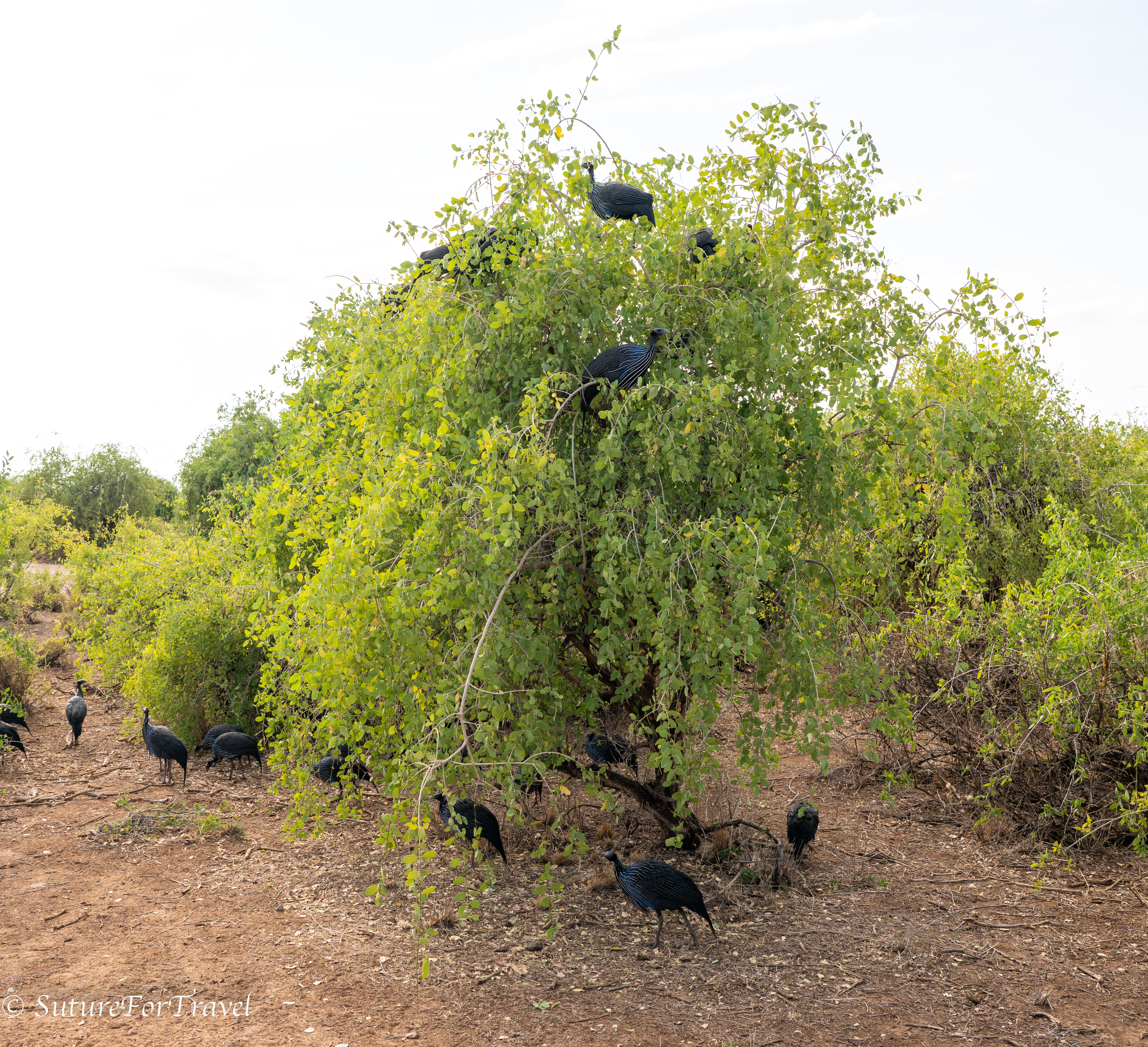 vulturine guinea fowl up in a bush