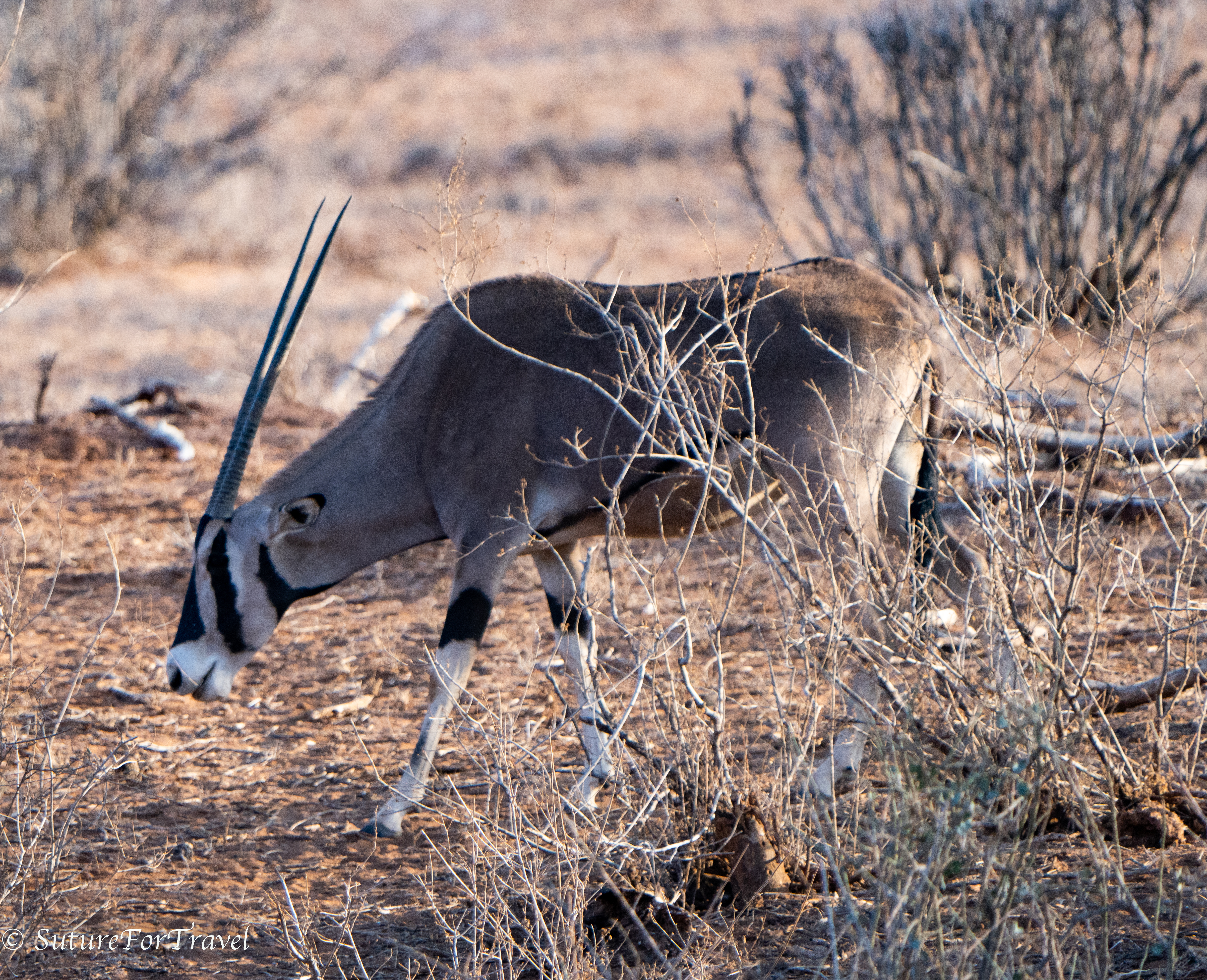 East African oryx (common beisa oryx): one of the Samburu special 5. It is a large gray antelope with distinctive black and white facial markings and long horns. They are endangered and currently are mainly found in Northern Kenya and Ethiopia.