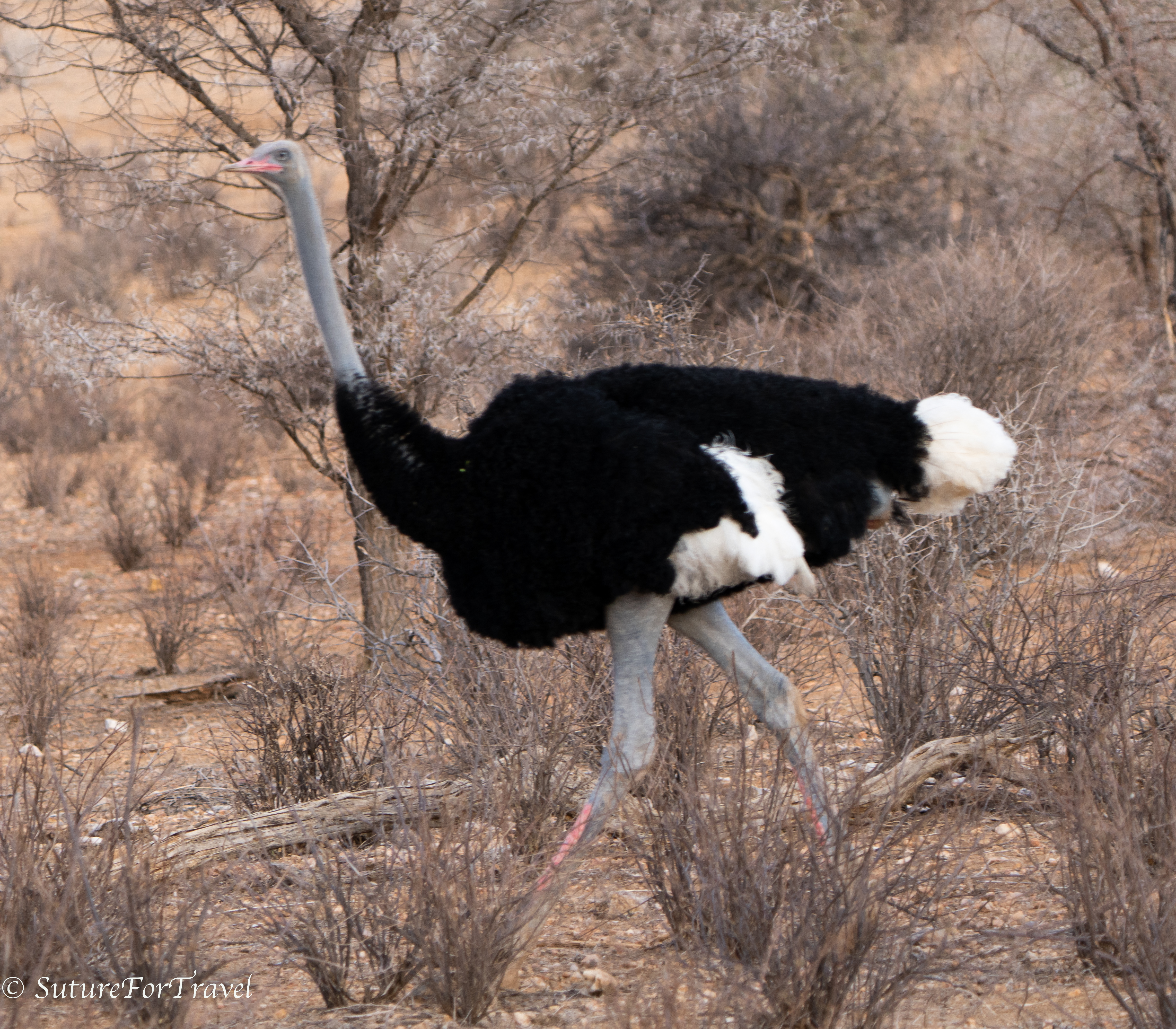 male Somali ostrich: This guy has been hiding! The light for my pictures was awful, but we got to see him in all his blue-gray glory. The standard male common ostrich has pink skin, but these guys have this blue-gray skin. This gets bright blue in the mating season. They also have white tail feathers.