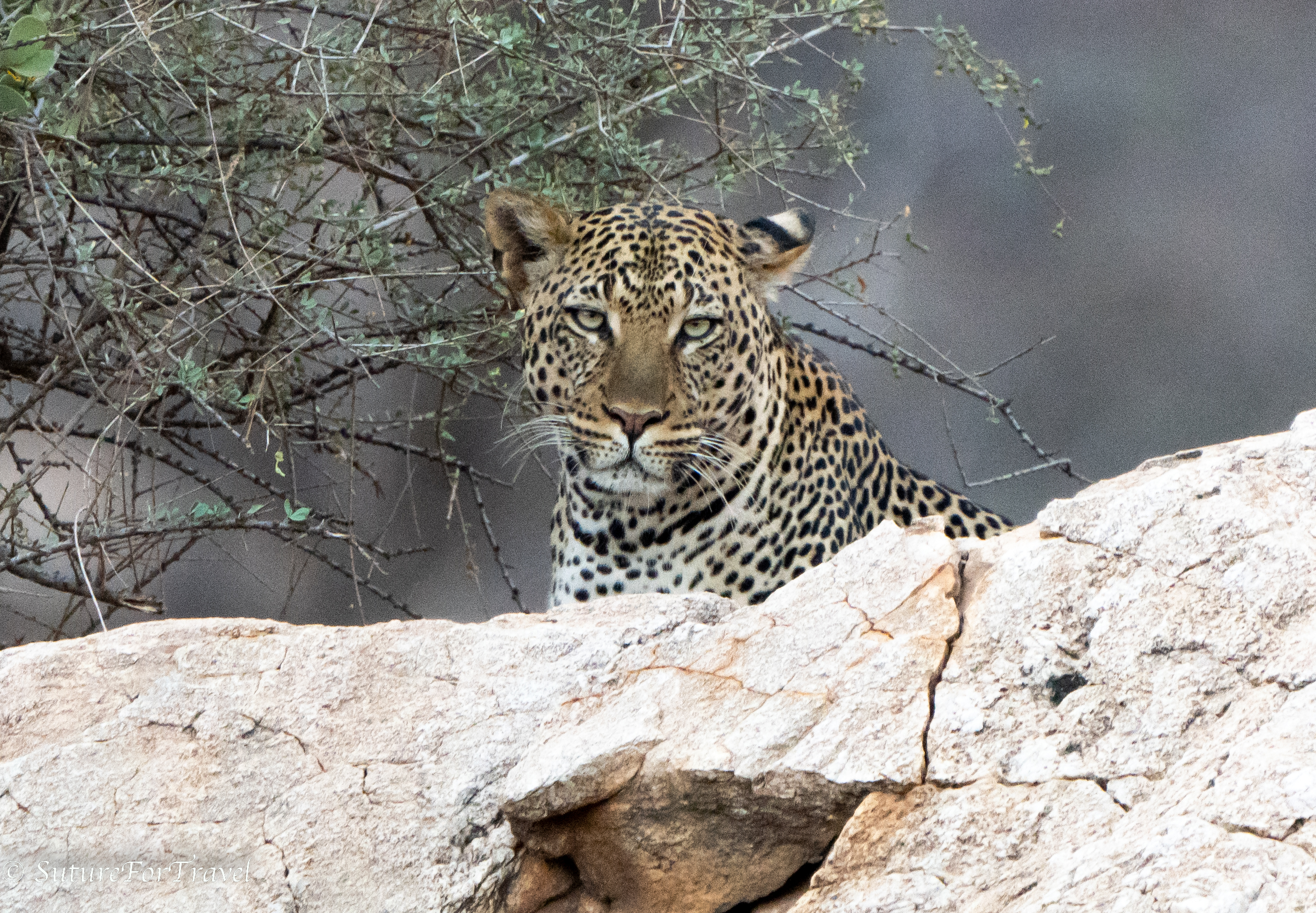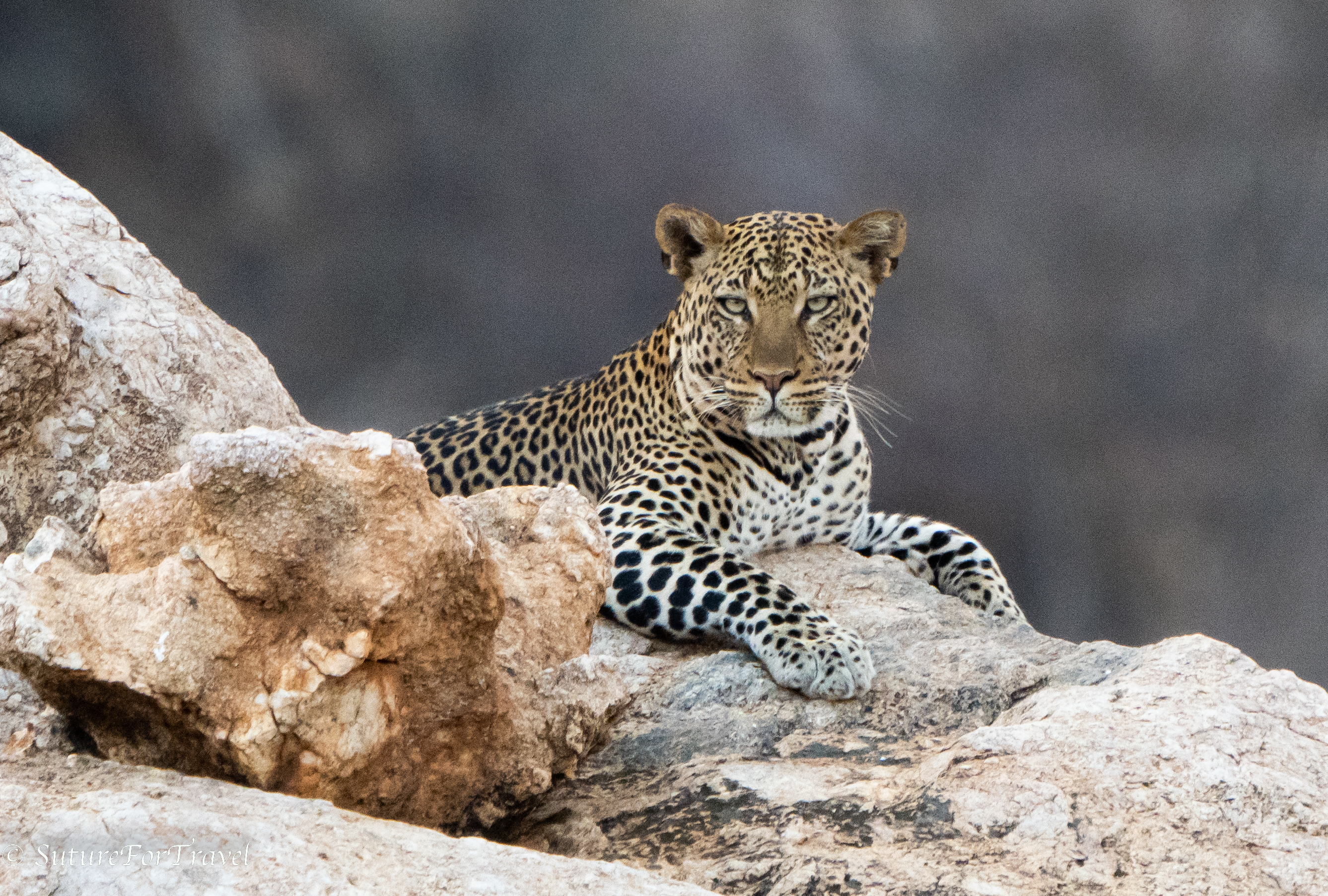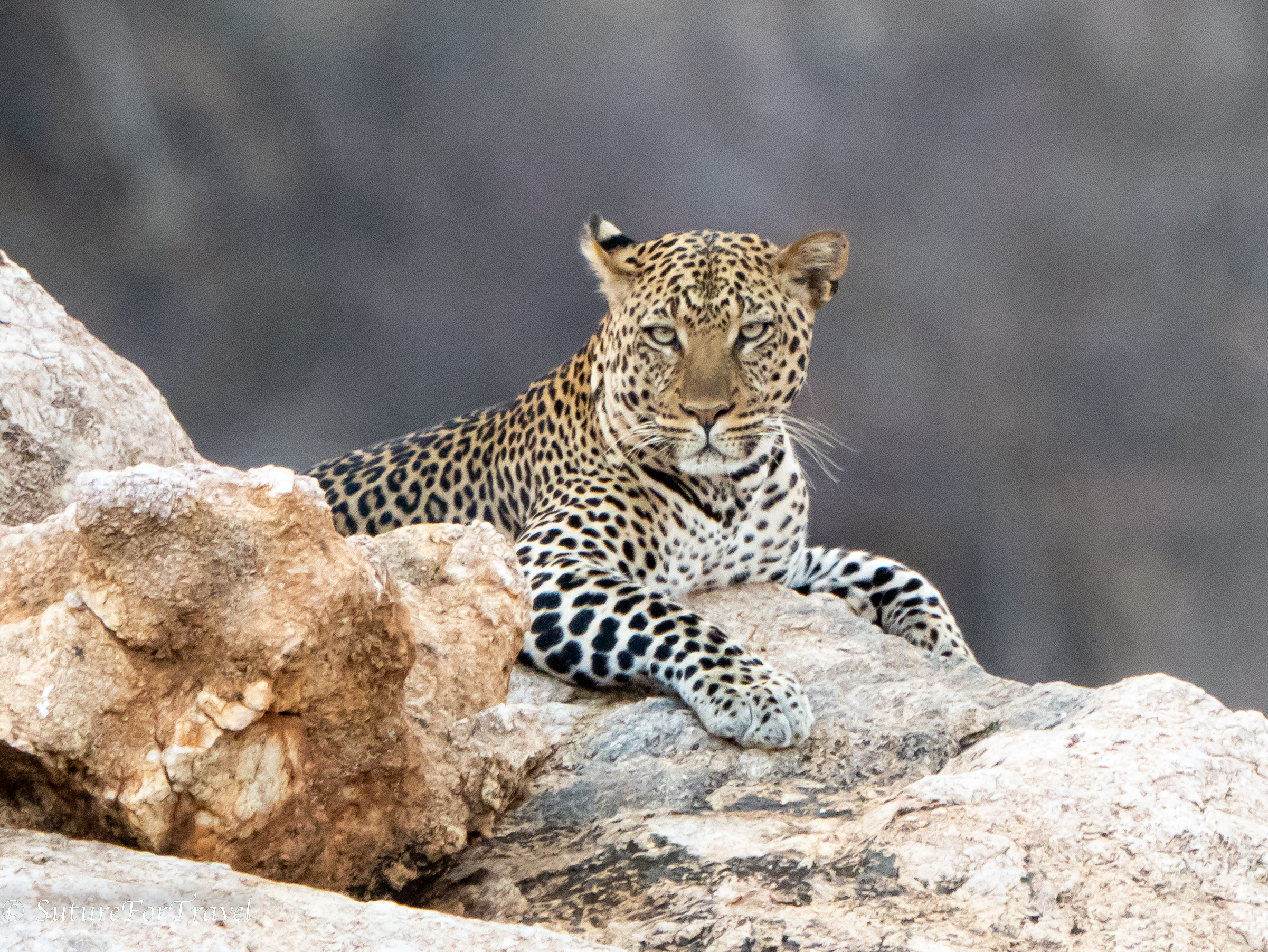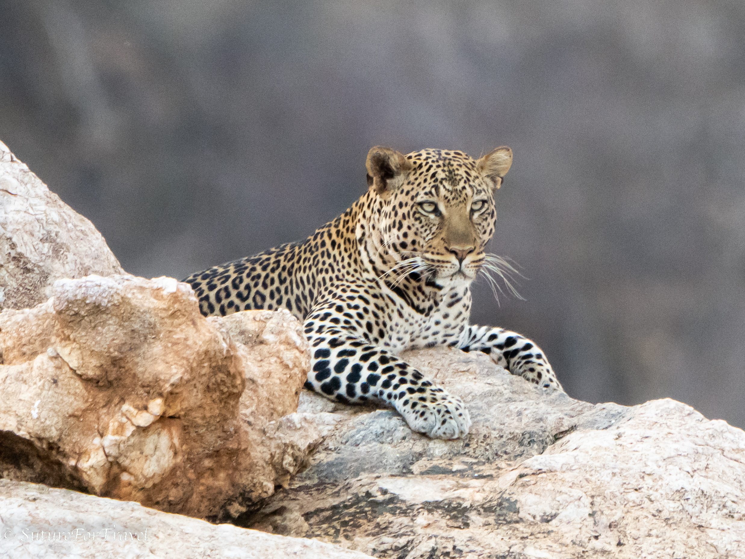 This is a female leopard. The guide here are familiar with all of the local big cats since it is a limited area. She was about 100 yards off sitting on a large rock. Ironically, about 30 minutes prior to this, Paul had stated in frustration that he just wished that someone would put a leopard out on a rock for us!