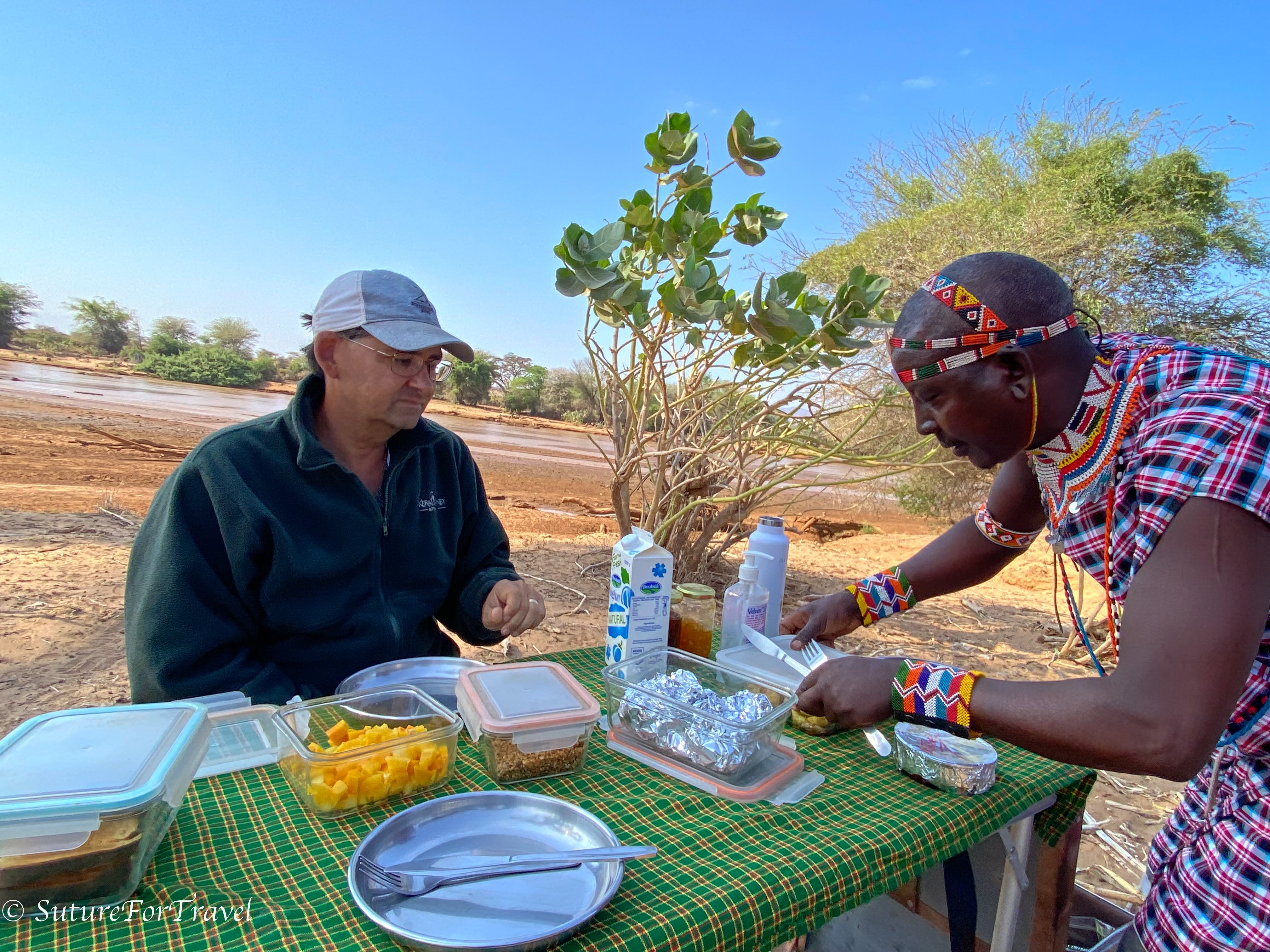 bush breakfast: That is our guide, Sumoro, setting things out. He is wearing traditional Samburu clothing and beads.