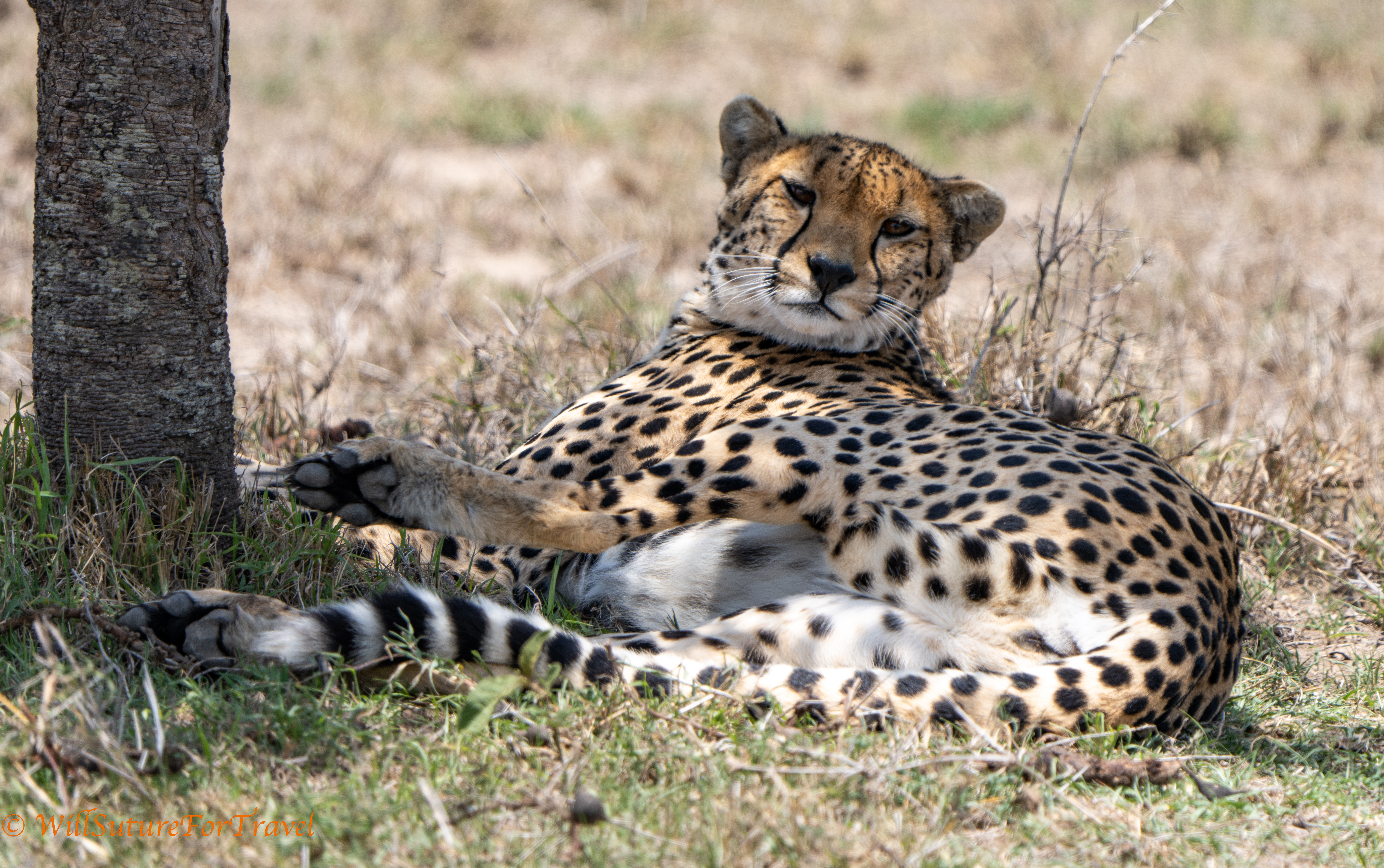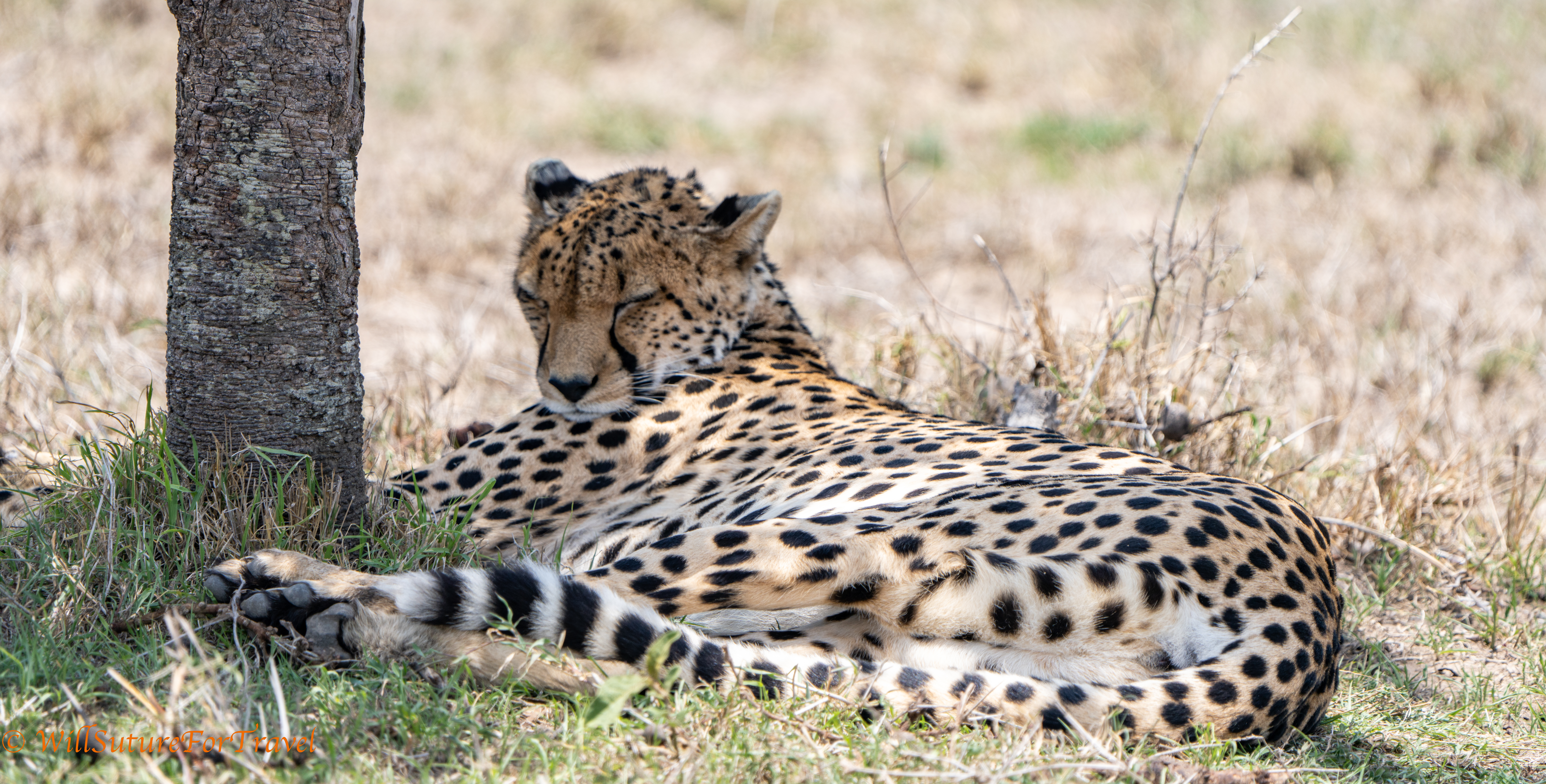 Cheetah! She was resting in the shade and we watched her for a while. She wasn’t up for doing anything in the mid-day heat. Our guide, Peter, says they believe this cheetah is pregnant.