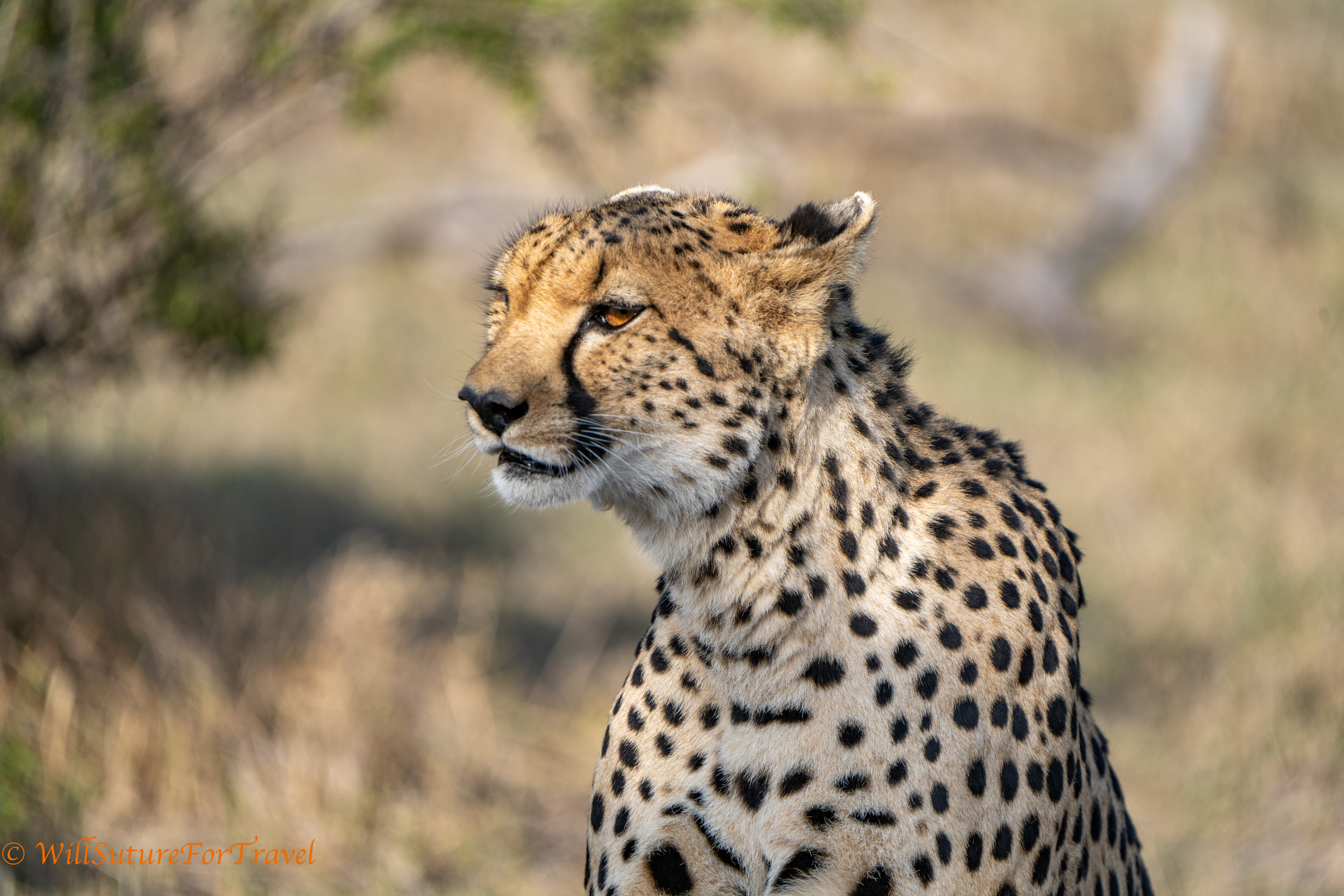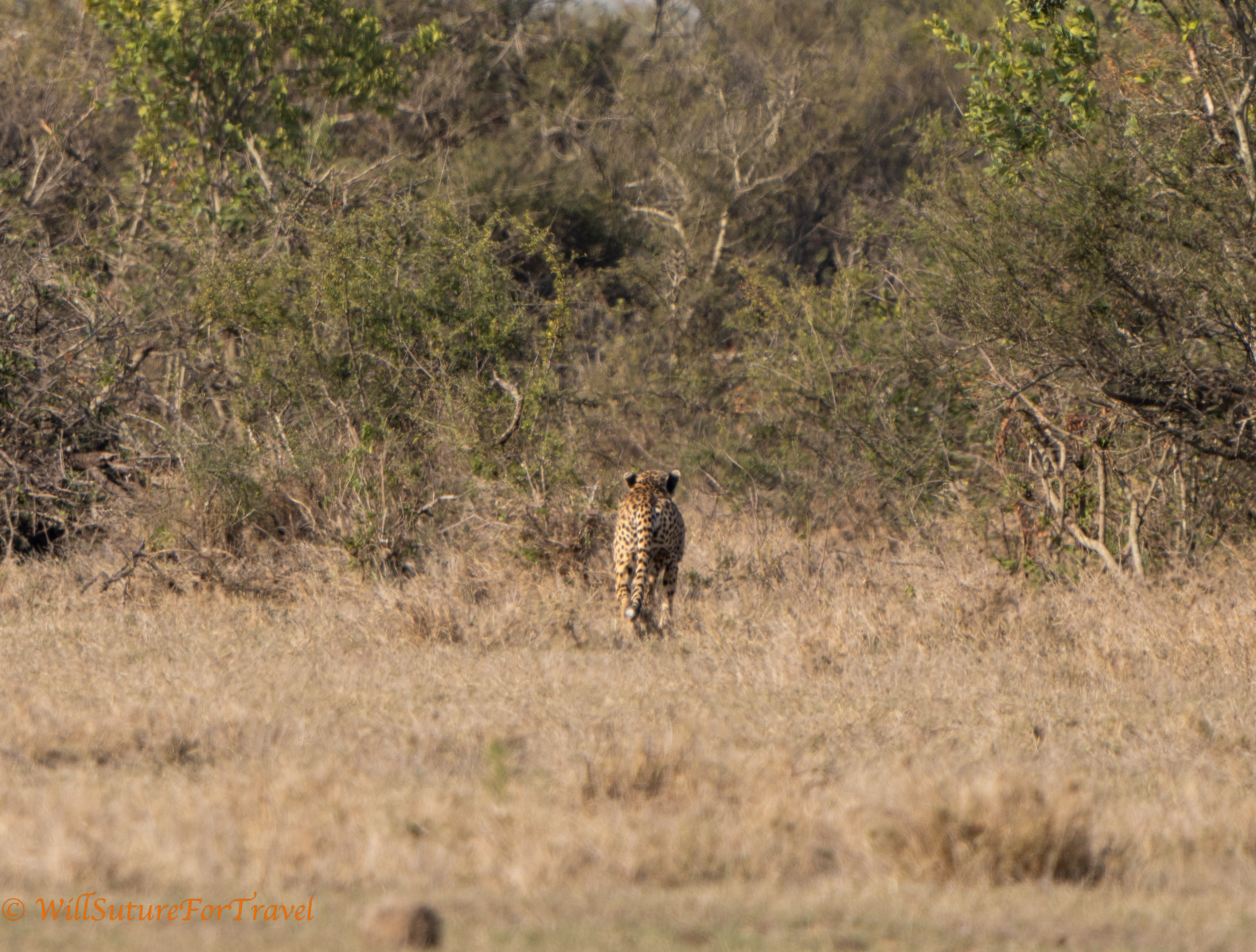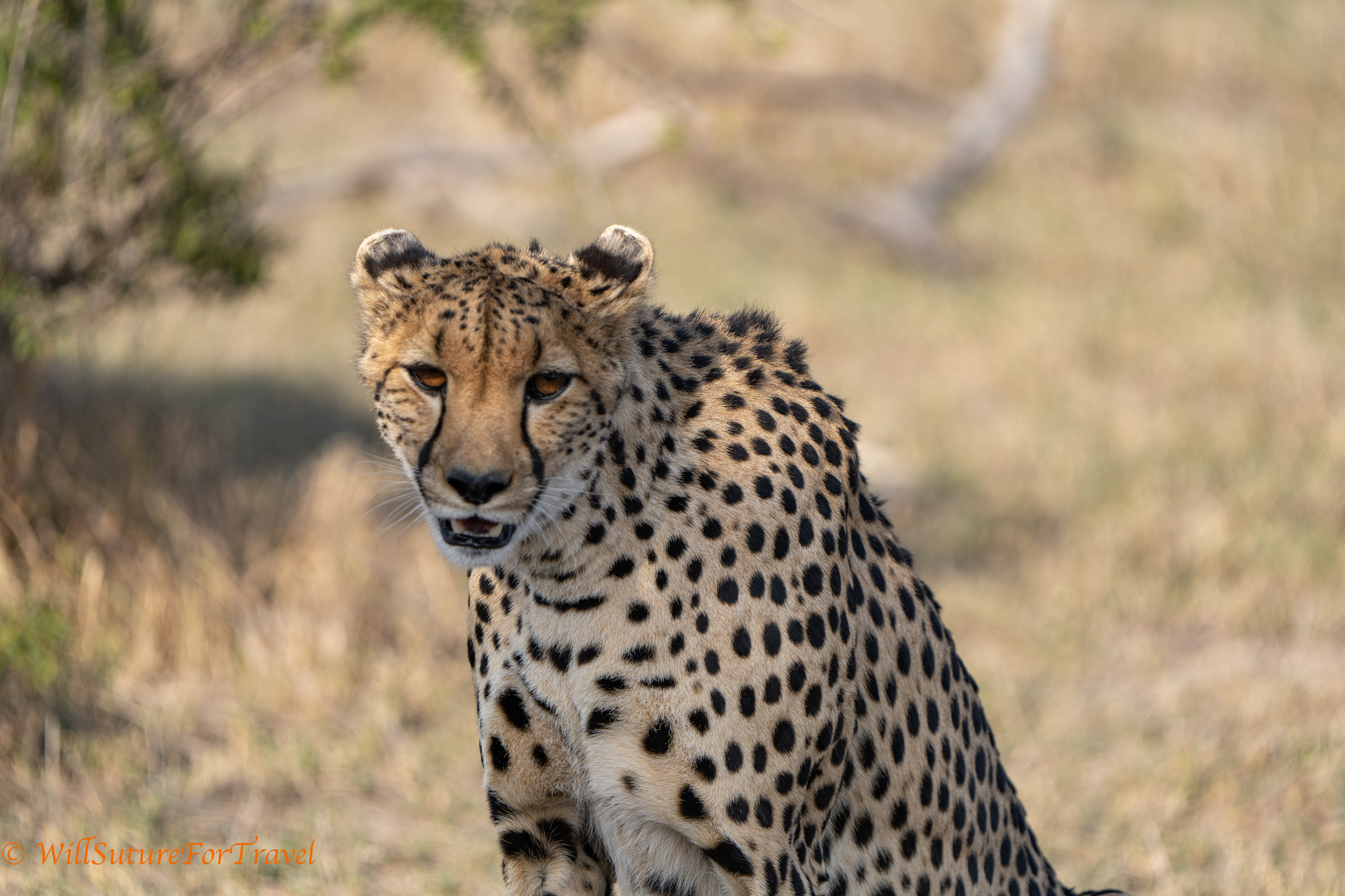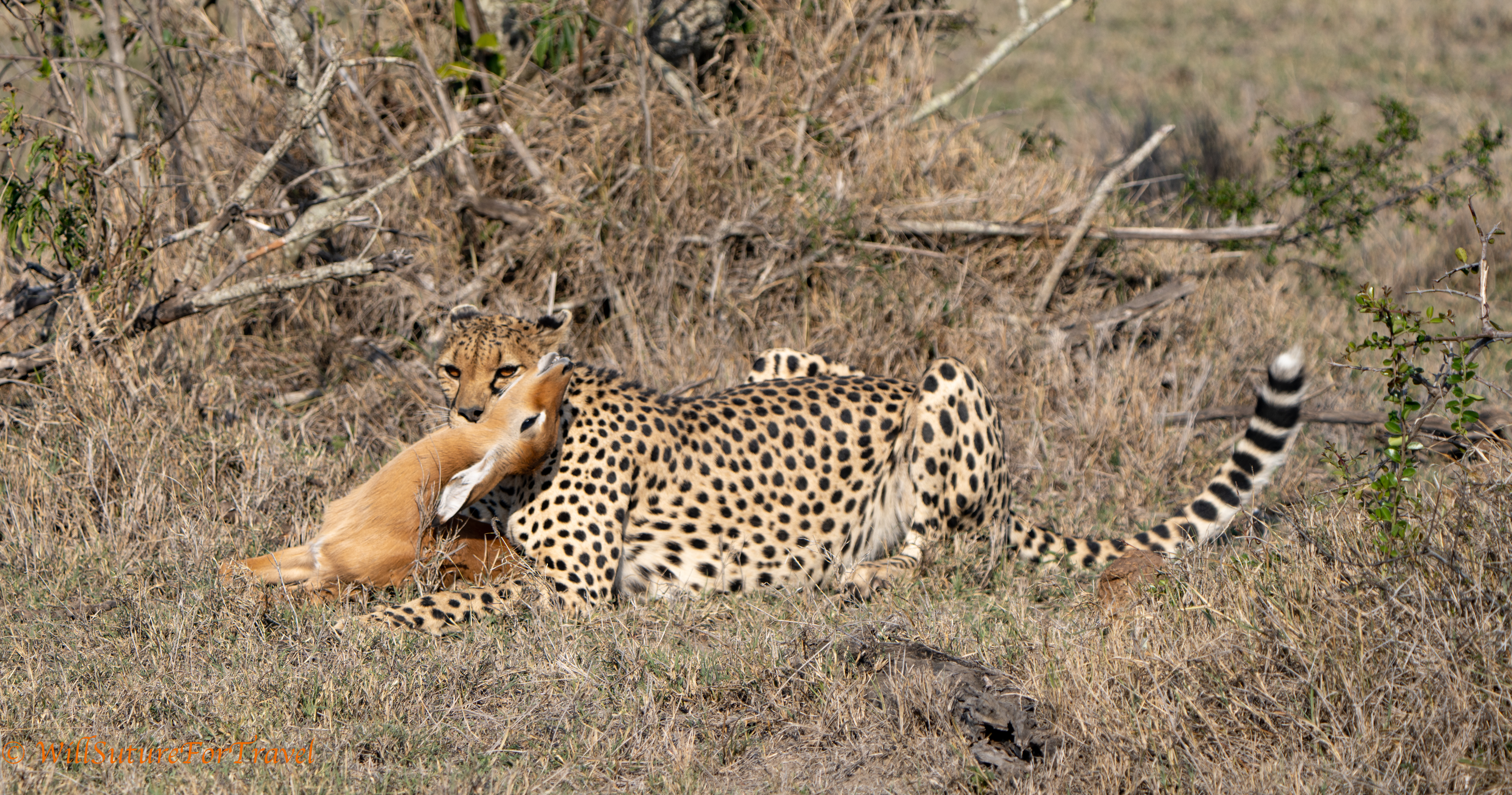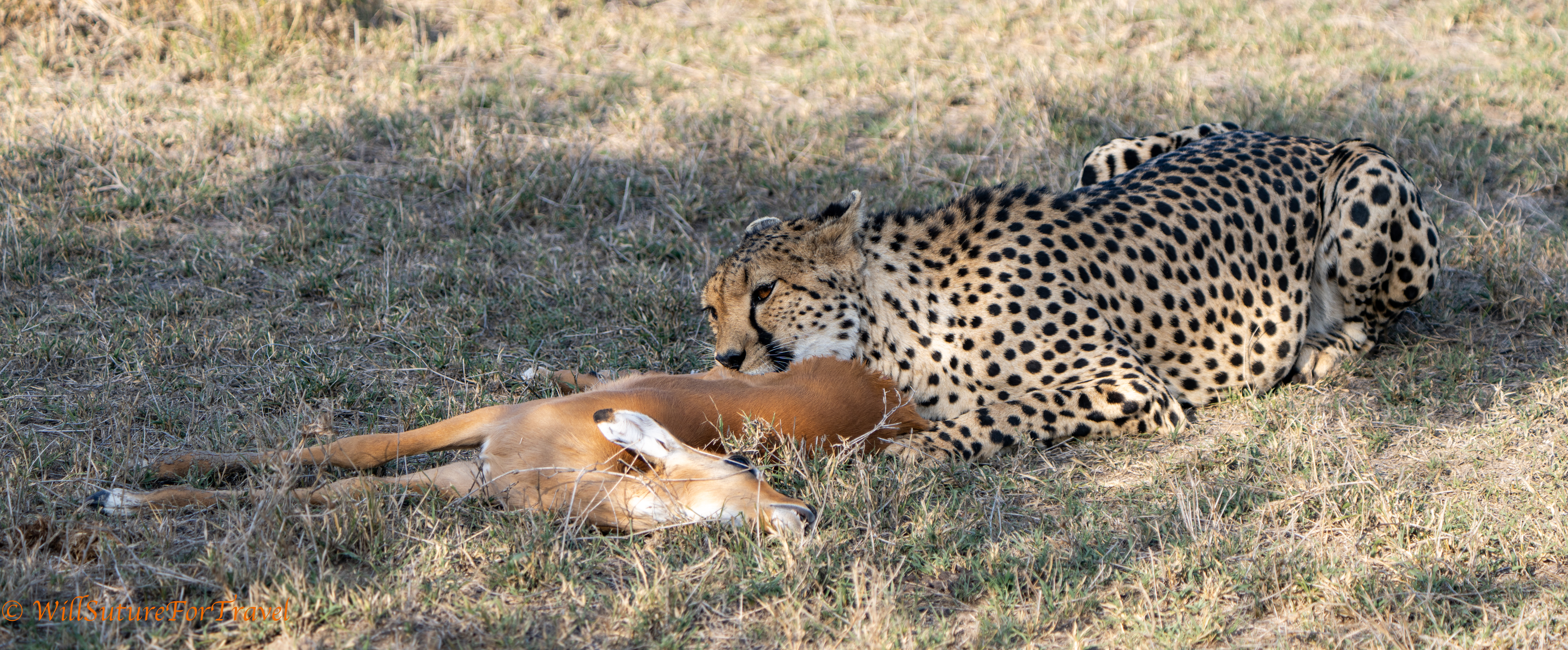 There were a few things that stood out to me. First, the impala herd were upset for a few minutes, vocalizing and agitated, but then they moved on. Second, even though the hunt was quick, the cheetah sat panting for quite a few minutes. That clearly took tremendous effort. Lastly, the kill itself, after the initial takedown, was calm and, oddly peaceful. Cheetahs hold down on the tracheas of their prey until they suffocate. This little impala didn’t move around or act in pain or distress. Once the cheetah let go of it there wasn’t a mark on the impala’s body.
