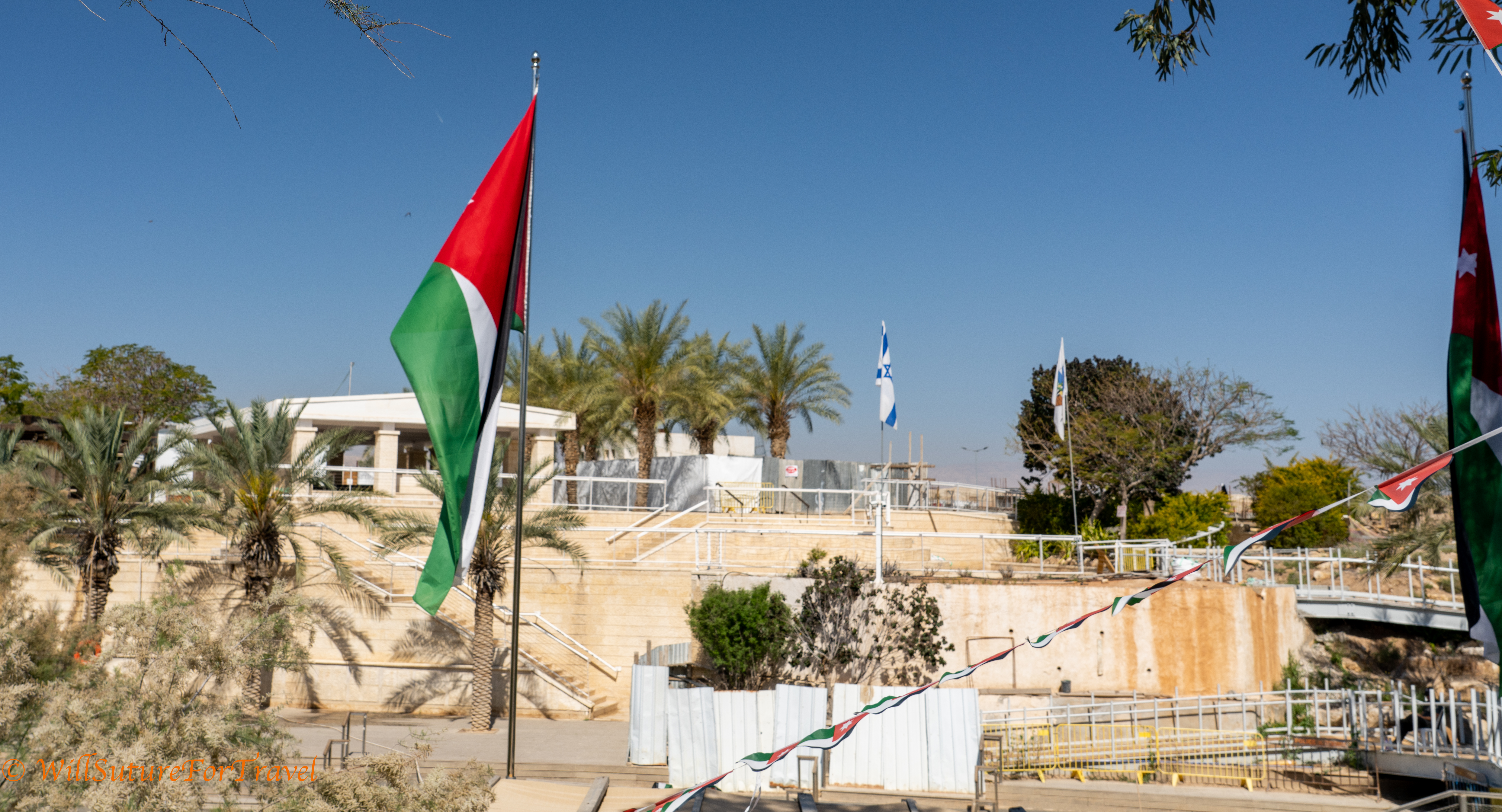 Jordanian and Israeli flags on their respective sides of the Jordan River.