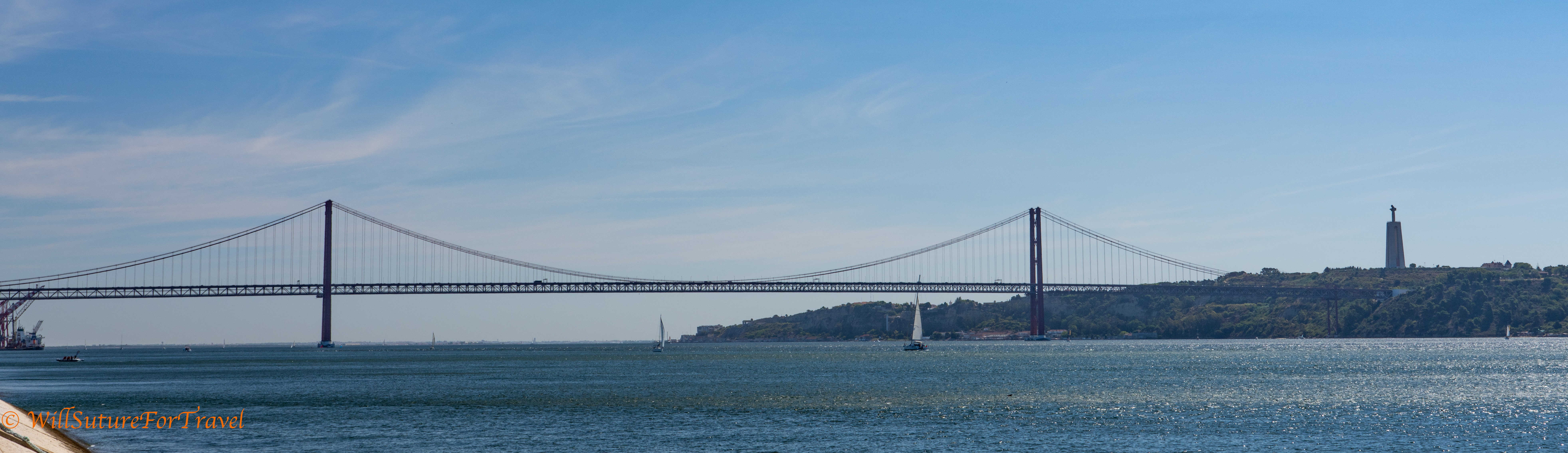 25th of April Bridge. This connects Lisbon to Almada, crossing the Tagus River. It was constructed by the same company that worked on the San Francisco Bay Bridge and closely resembles it. On the right is Lisbon’s version of Christ the Redeemer, called Christ the King.