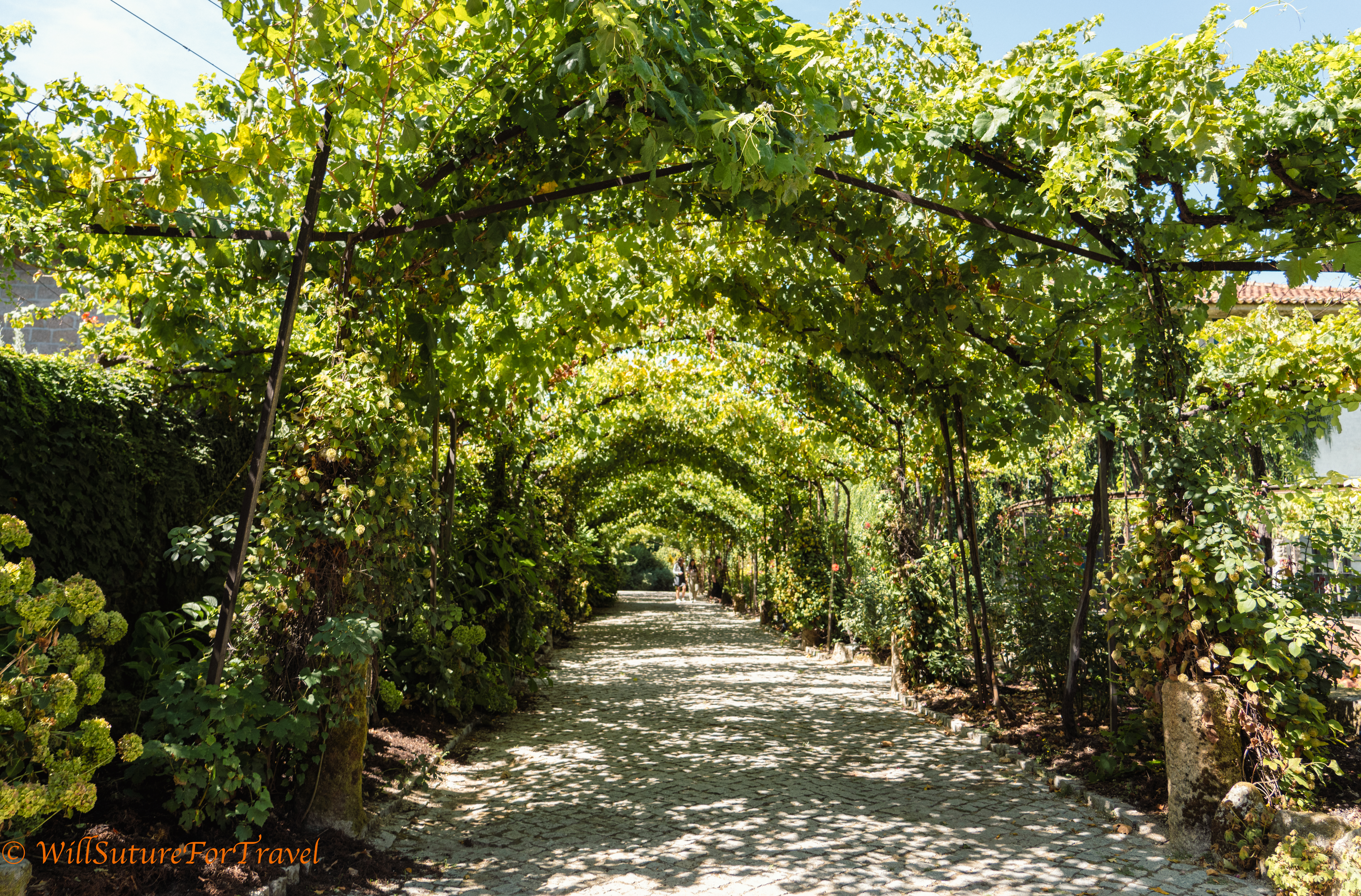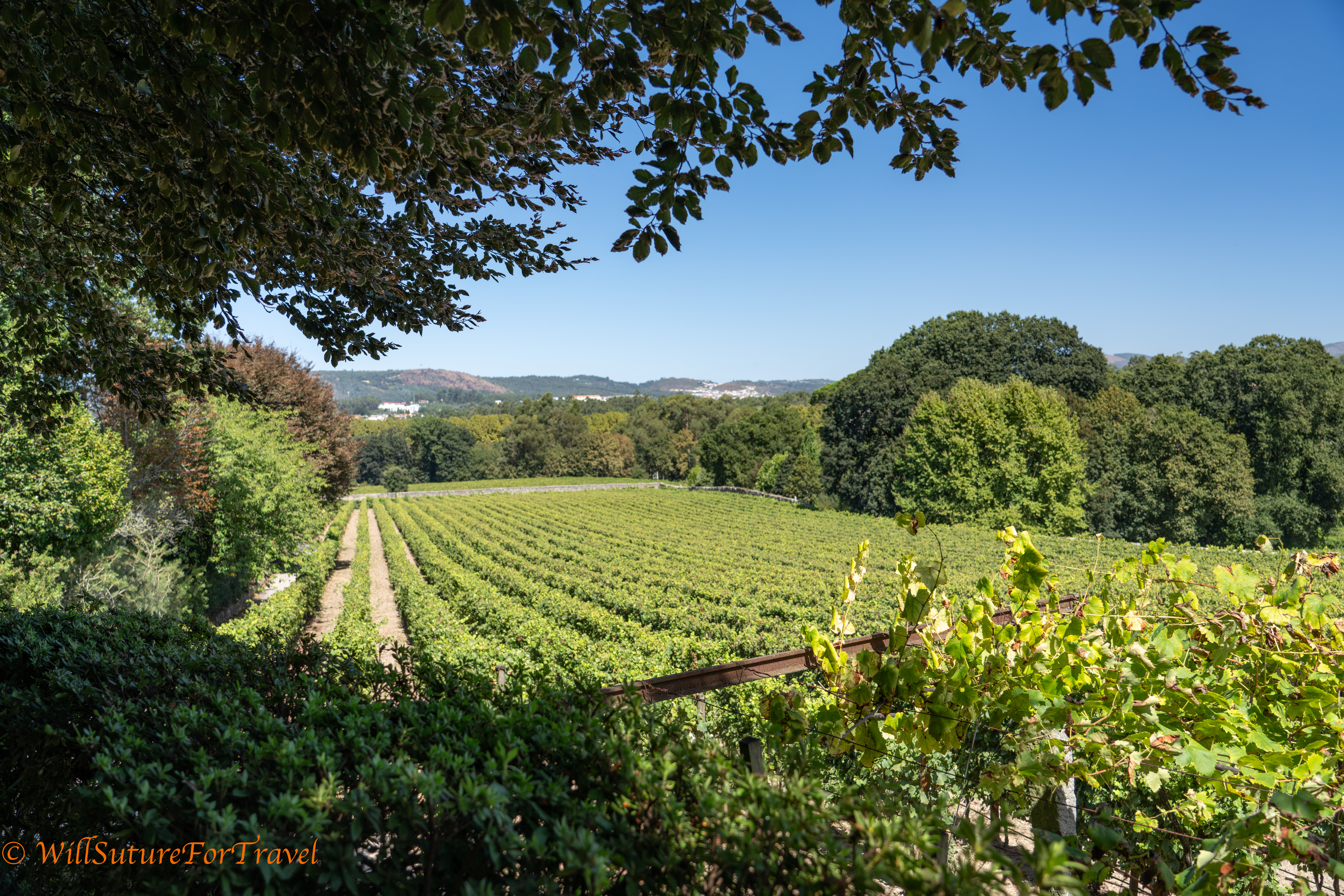 One of the vineyards. The closest vines on the right are trained to be elevated so the grapes are picked from overhead. This is a local traditional method and allows for other crops to be grown below, but is not economical in large volume grape production and is not used often now.