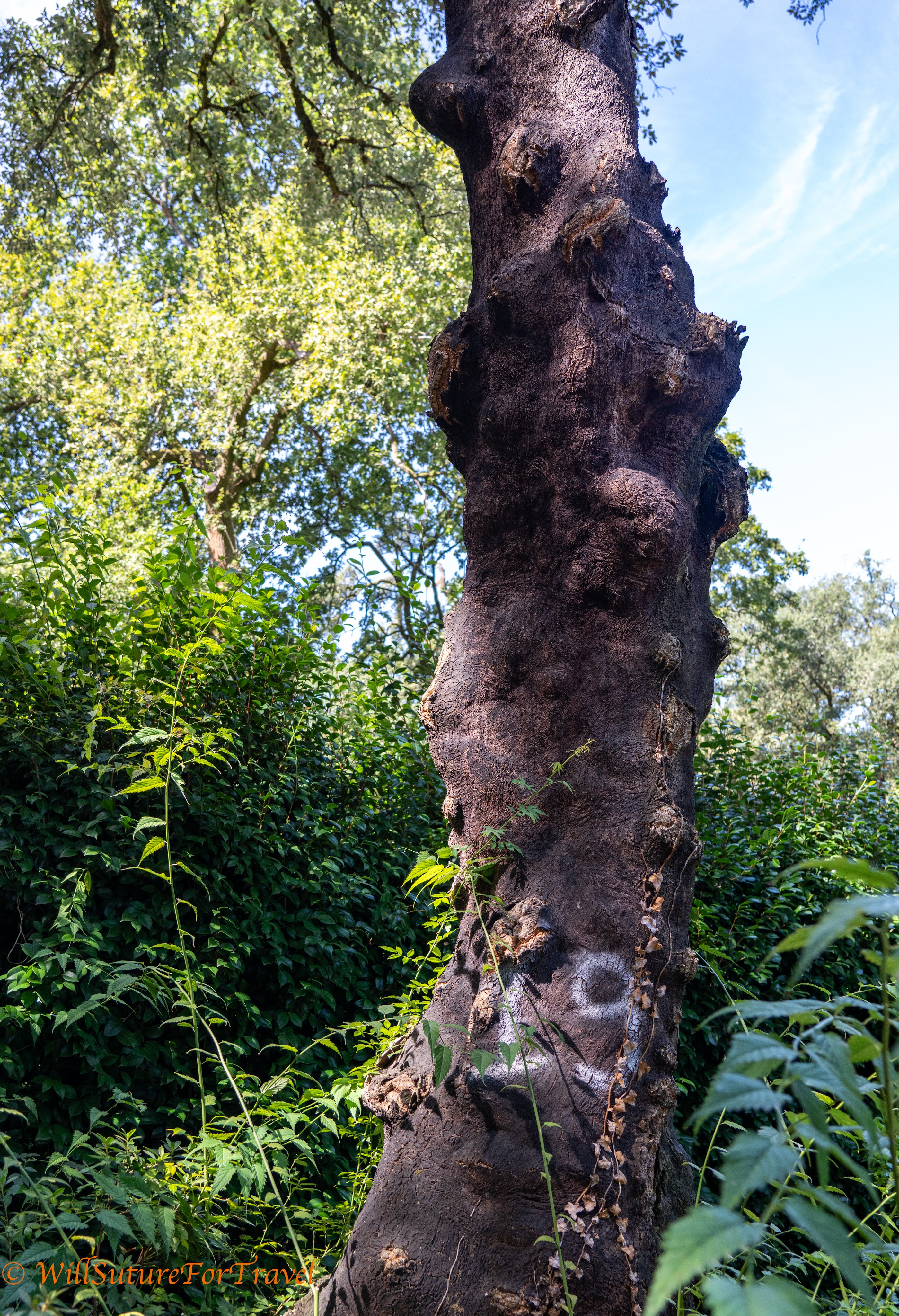 This is a cork oak tree. Portugal is a major producer of cork. The cork is a part of the bark of the tree. It takes about 25 years for a tree to make enough initial cork. The bark is carefully peeled off of the tree, the tree is marked with the year it was done, and then the tree is left to make more cork, which takes about another 10 years before it can be harvested again.