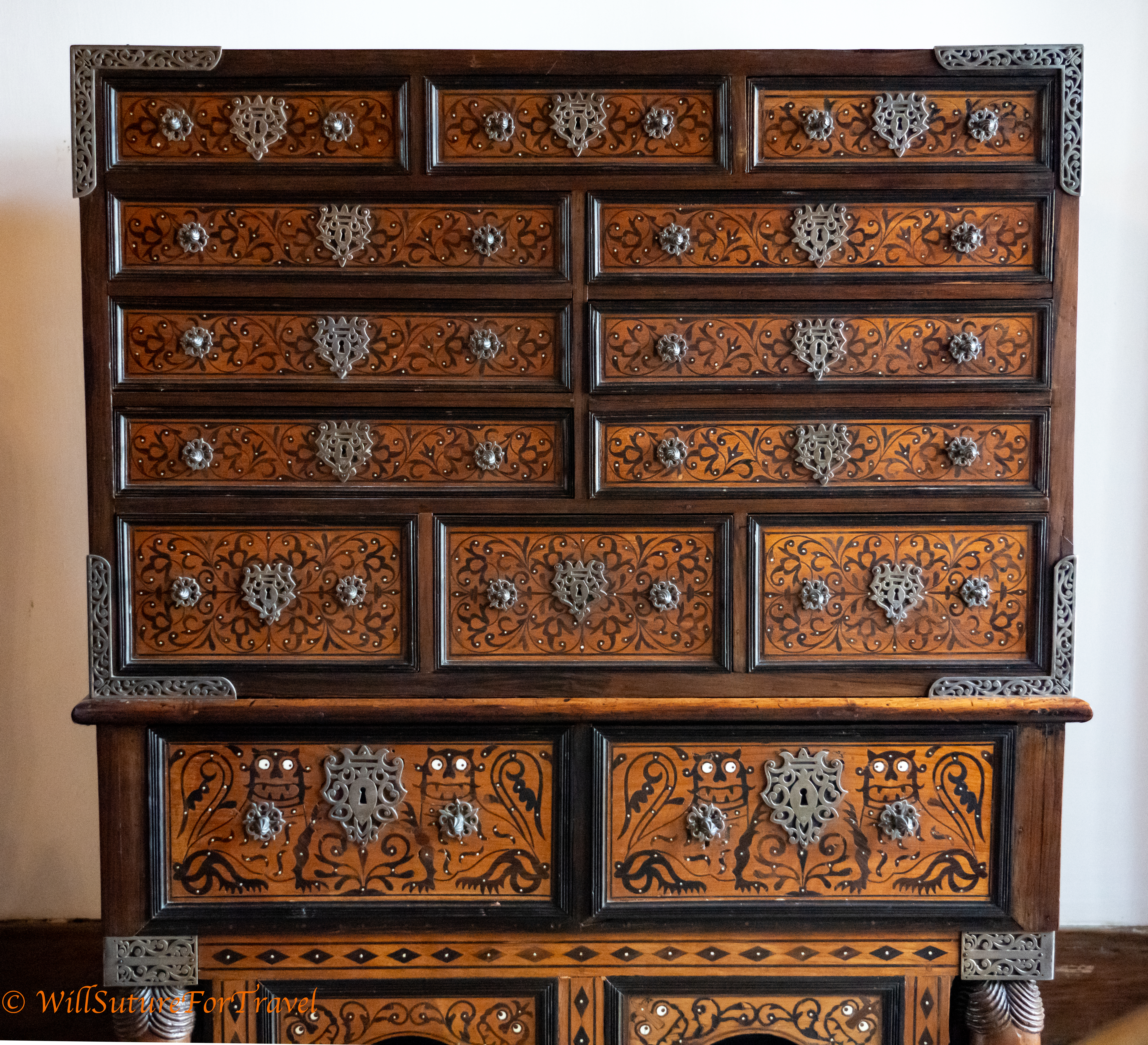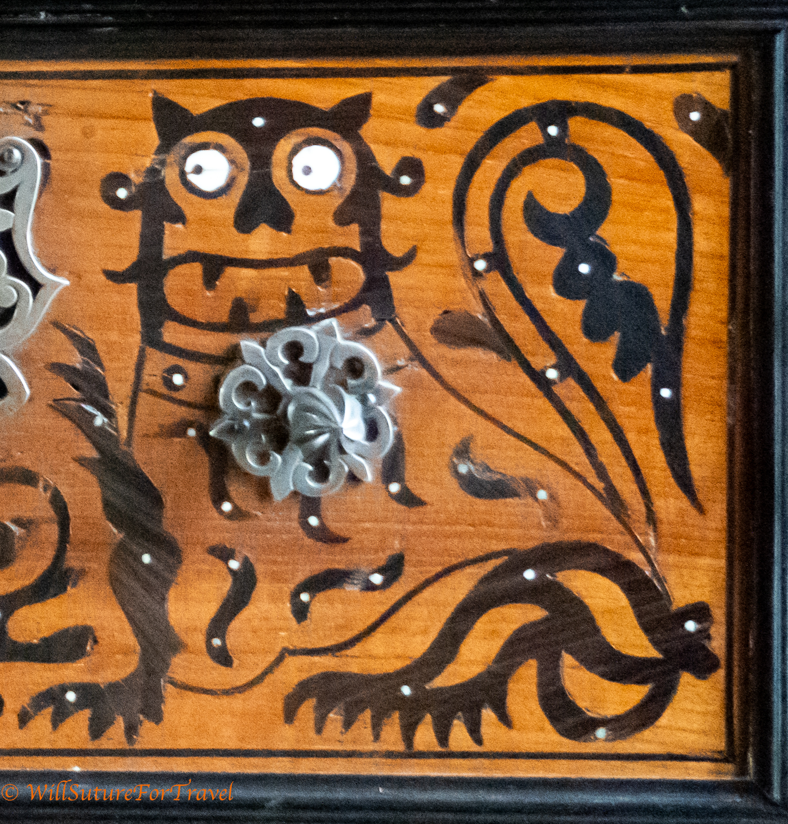 This intricate cabinet initially appears to have owls on it. If you look more closely they have fangs and are tigers.