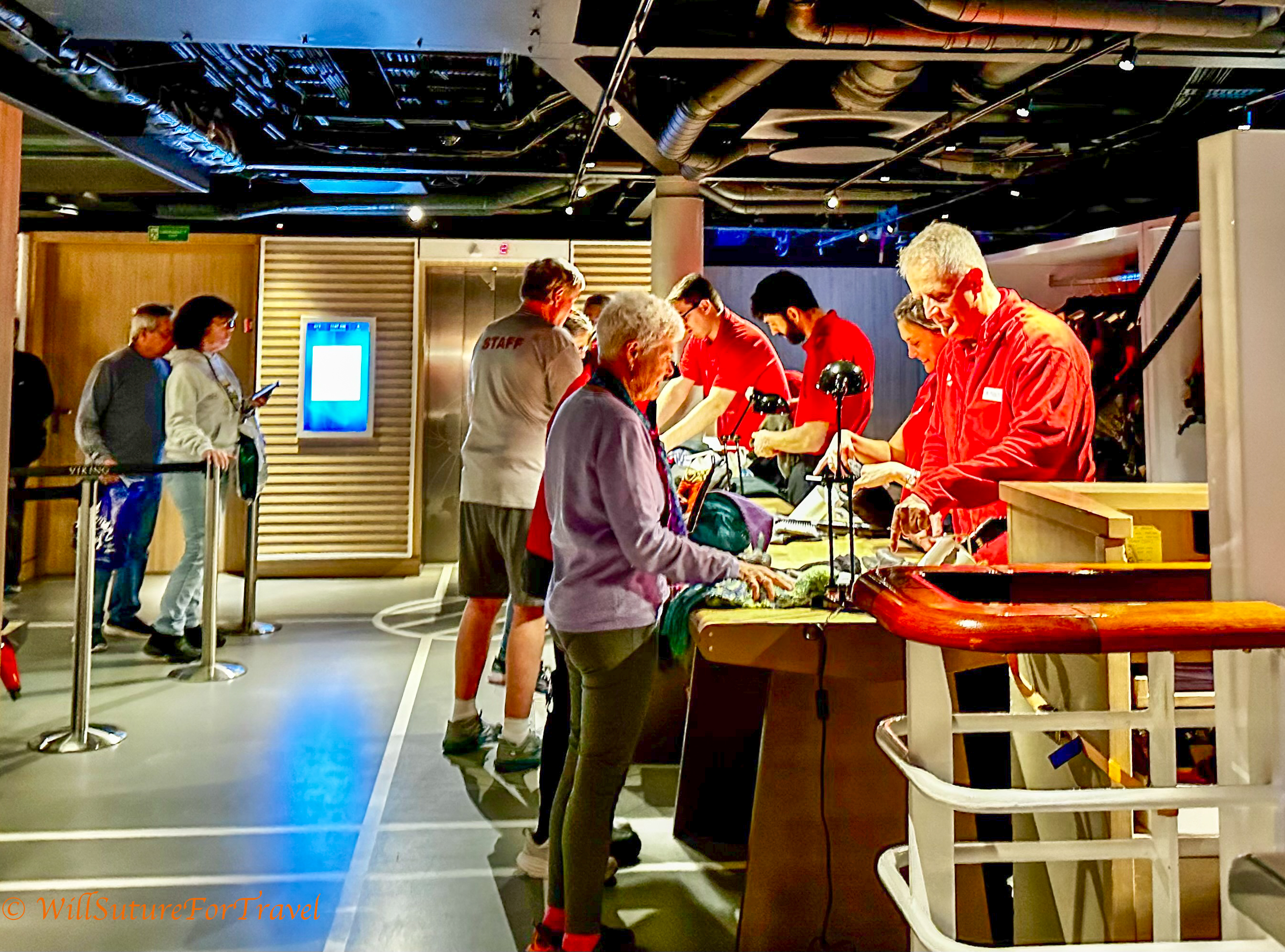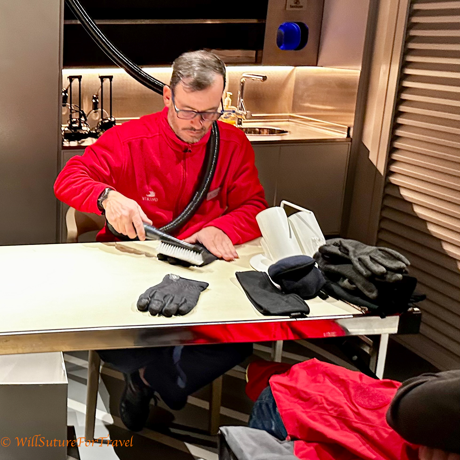 While crossing we had some time for preparation for Antarctica landing. Part of this time was taking our personal items for examination and cleaning. This included gloves, hats, scarves, etc. They were looking for things like seeds and micro plastics (pieces of tags), which would be extremely problematic if taken to Antarctica.