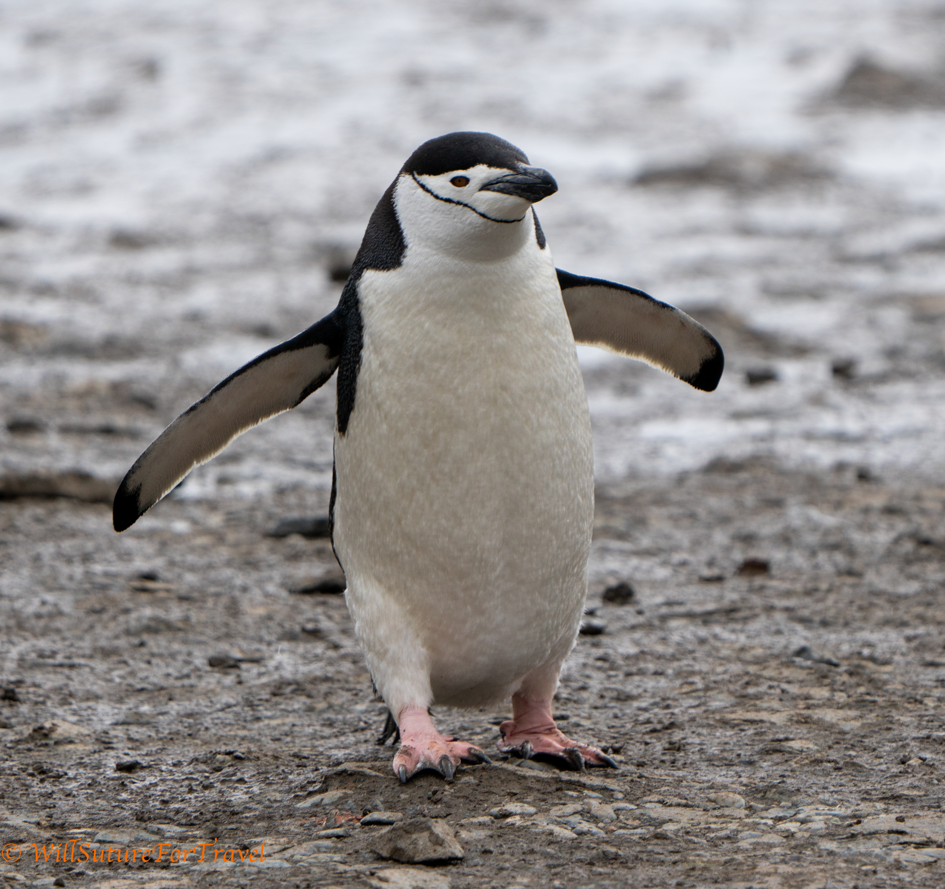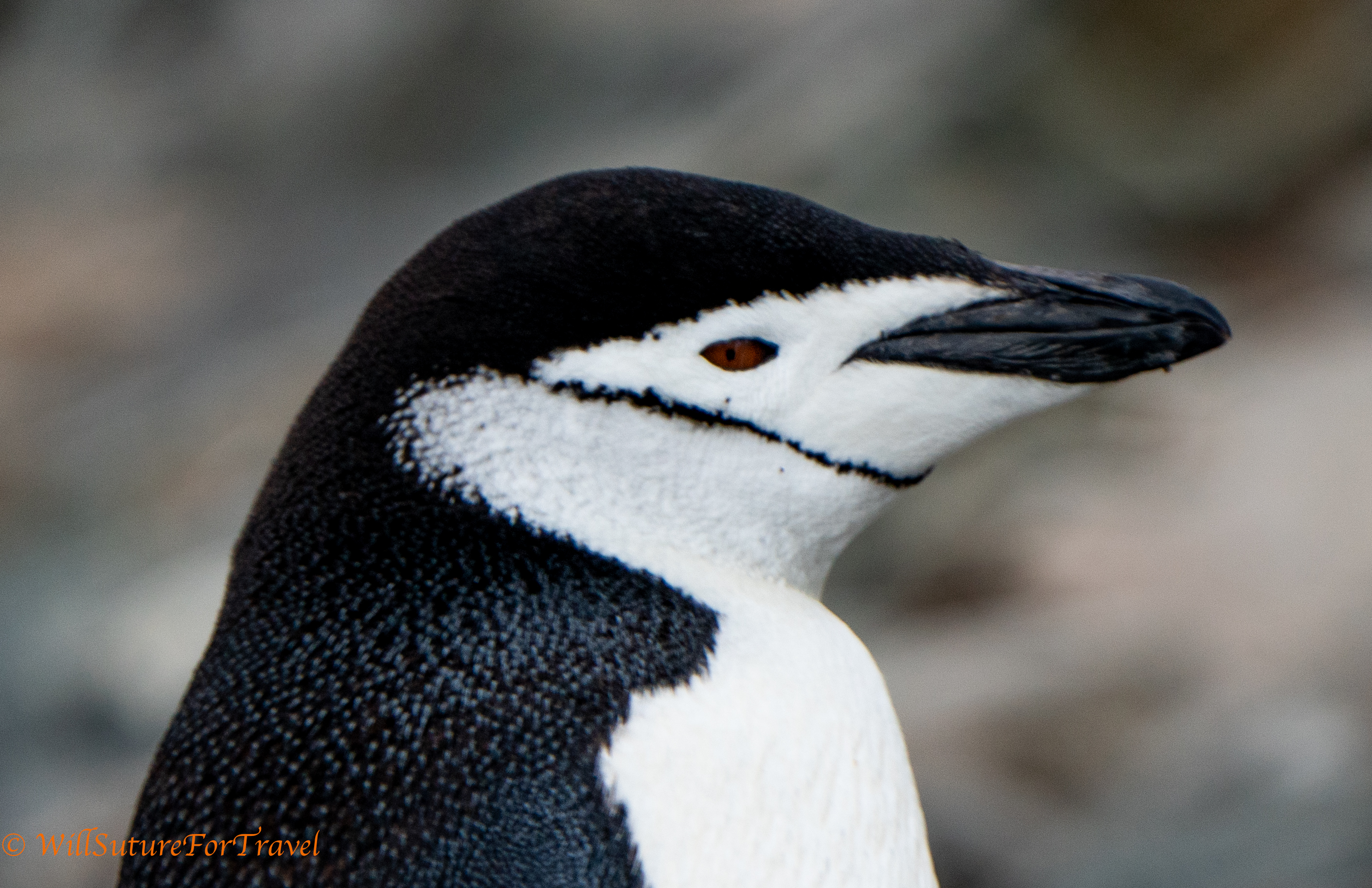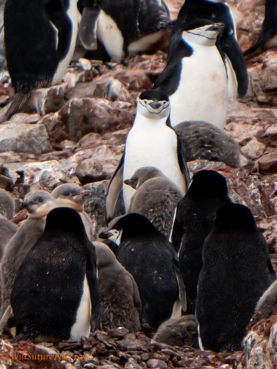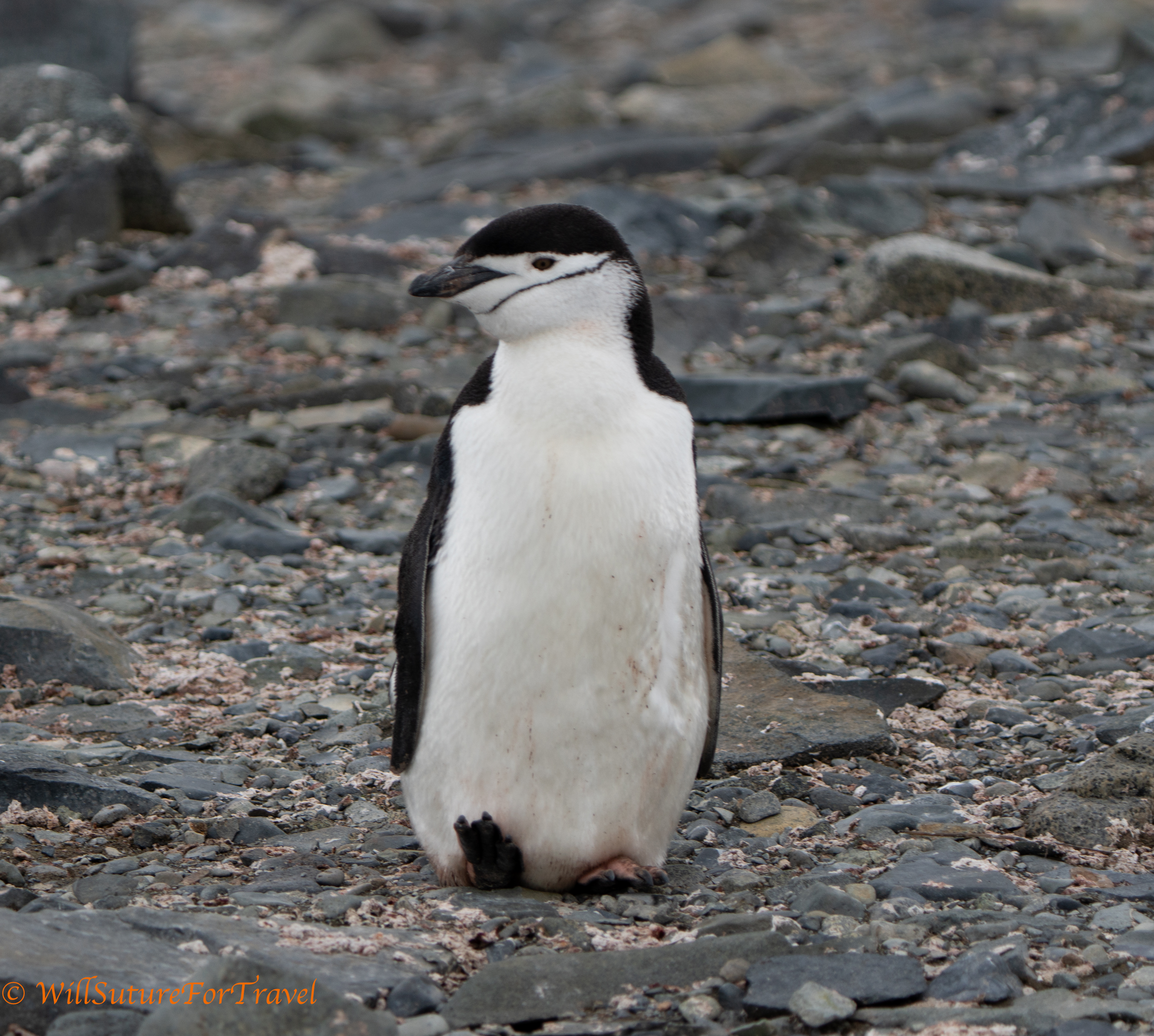 Chinstrap penguins are a little smaller than the Gentoo penguins that we have been seeing. They have a dark beak and a black line that extends under their chin.